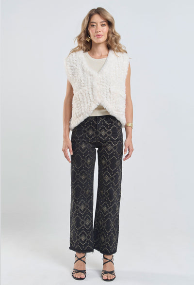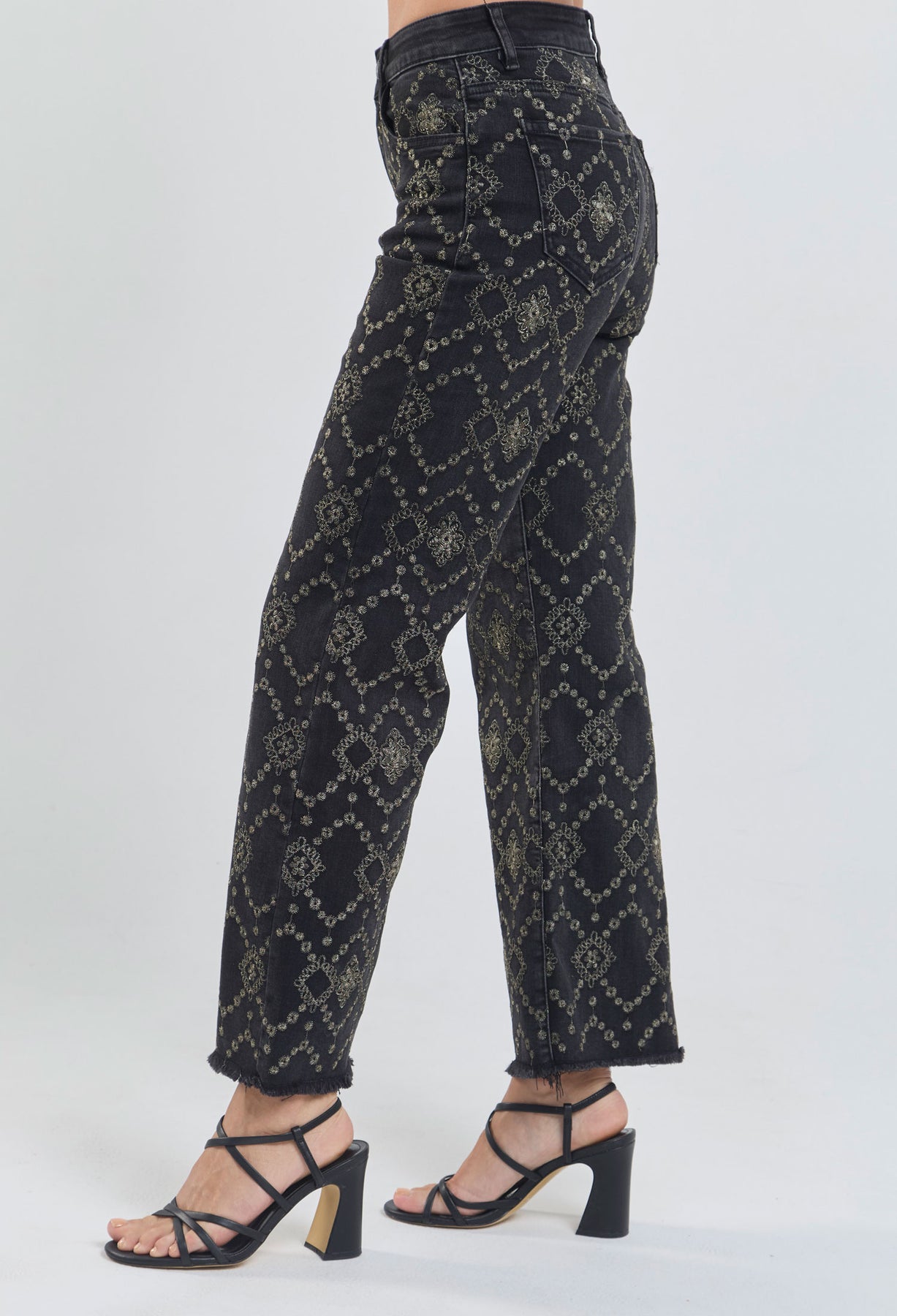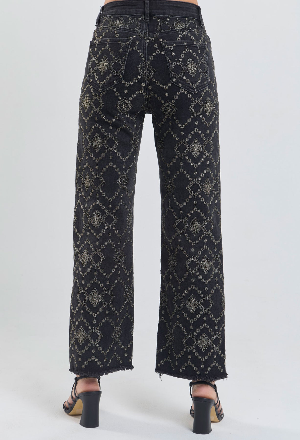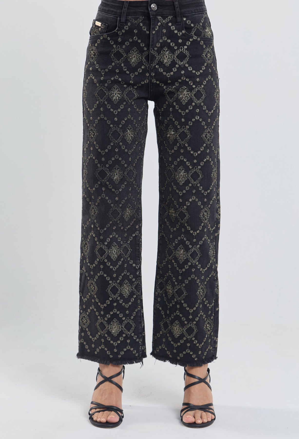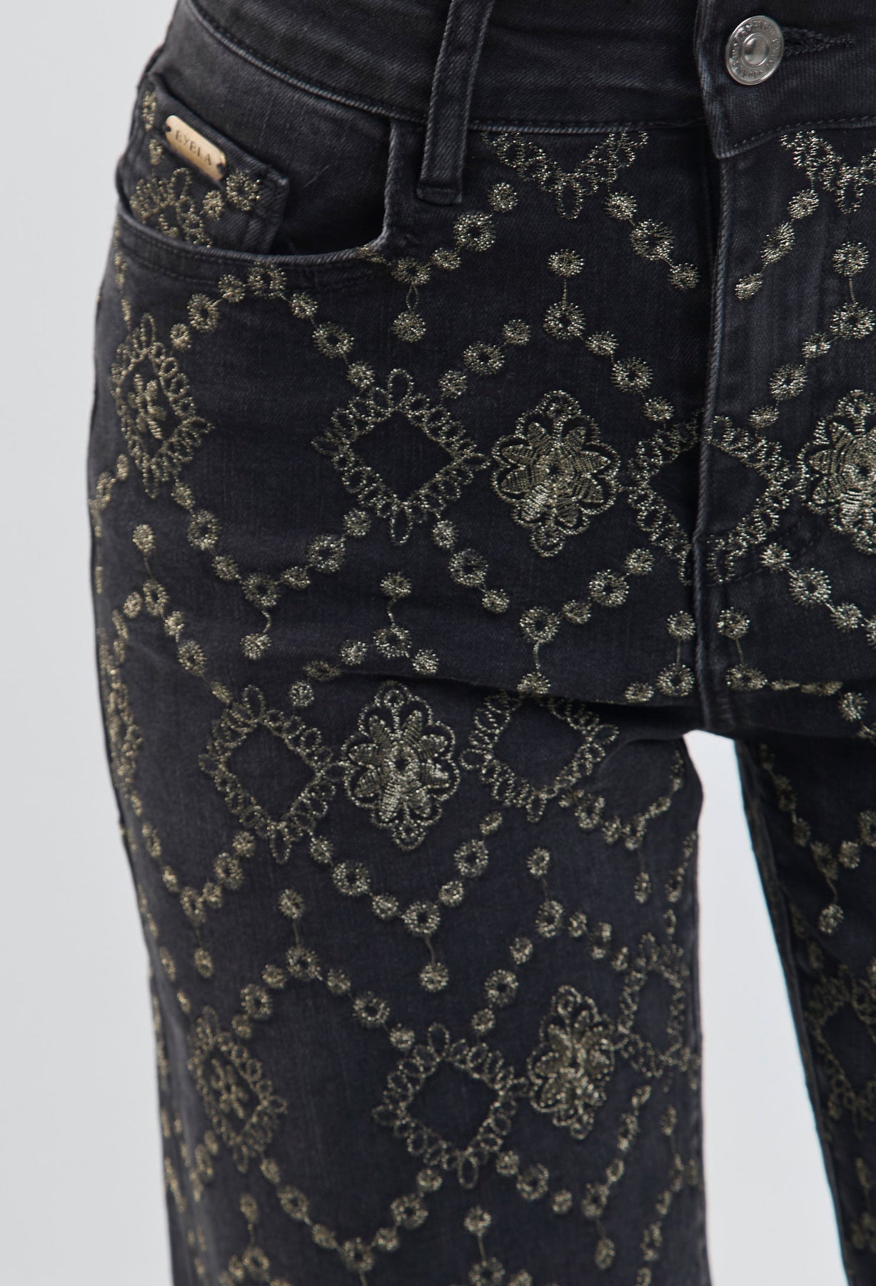 Pantalón Jean recto cinco bolsillos, pretina con pasadores y ajuste por cierre con botonadura; Detalles bordados en forma de rombos y flores en hilo dorado brillante. La modelo mide 1.74 m y lleva puesta la talla 6. Los accesorios de esta foto no vienen con la prenda. COMPOSICIÓN: 66% ALGODÓN, 33% POLIESTER, 1% ELASTANO. Instrucciones de Lavado: Lavar a mano con agua fría, usar detergente suave, no retorcer en el secado, no usar secadora, no usar suavizante.