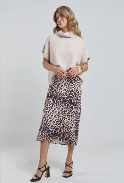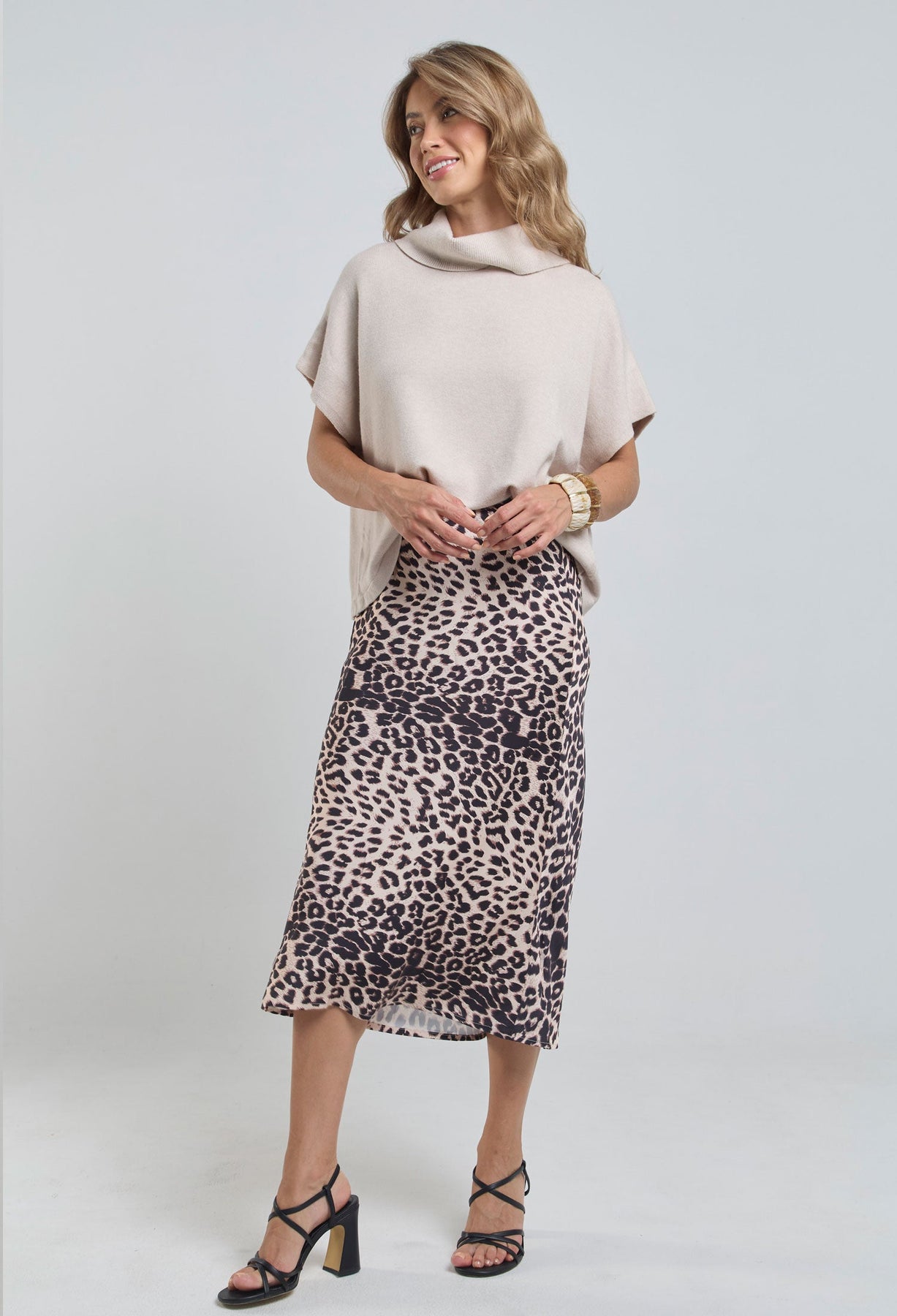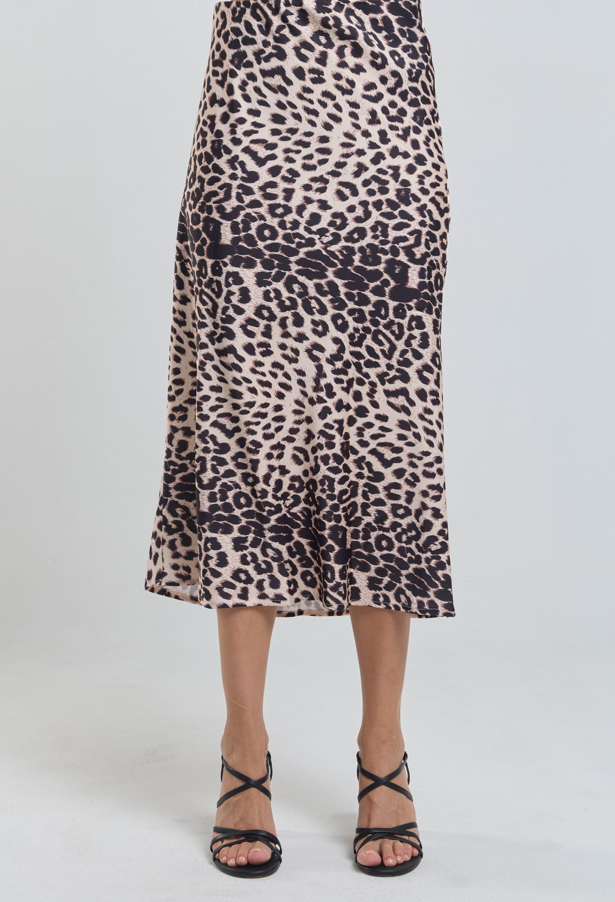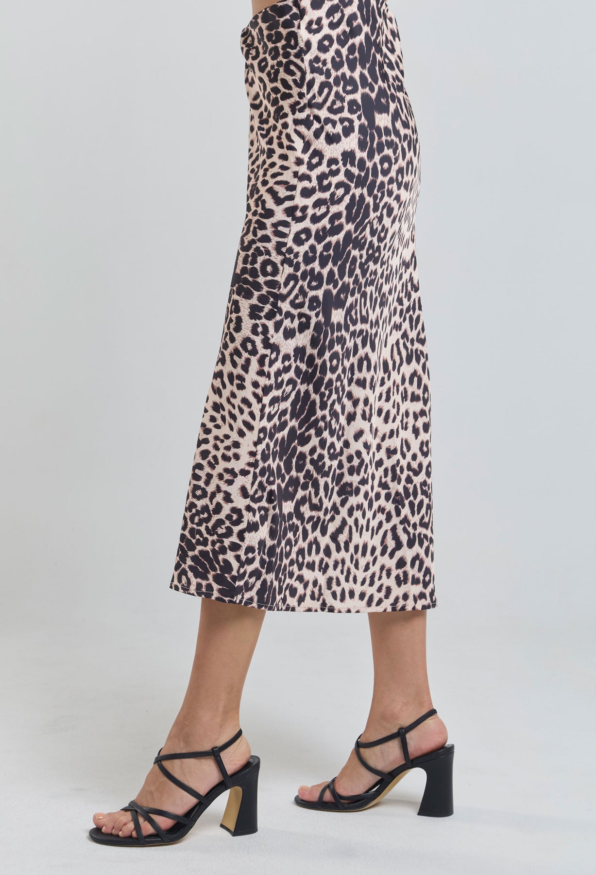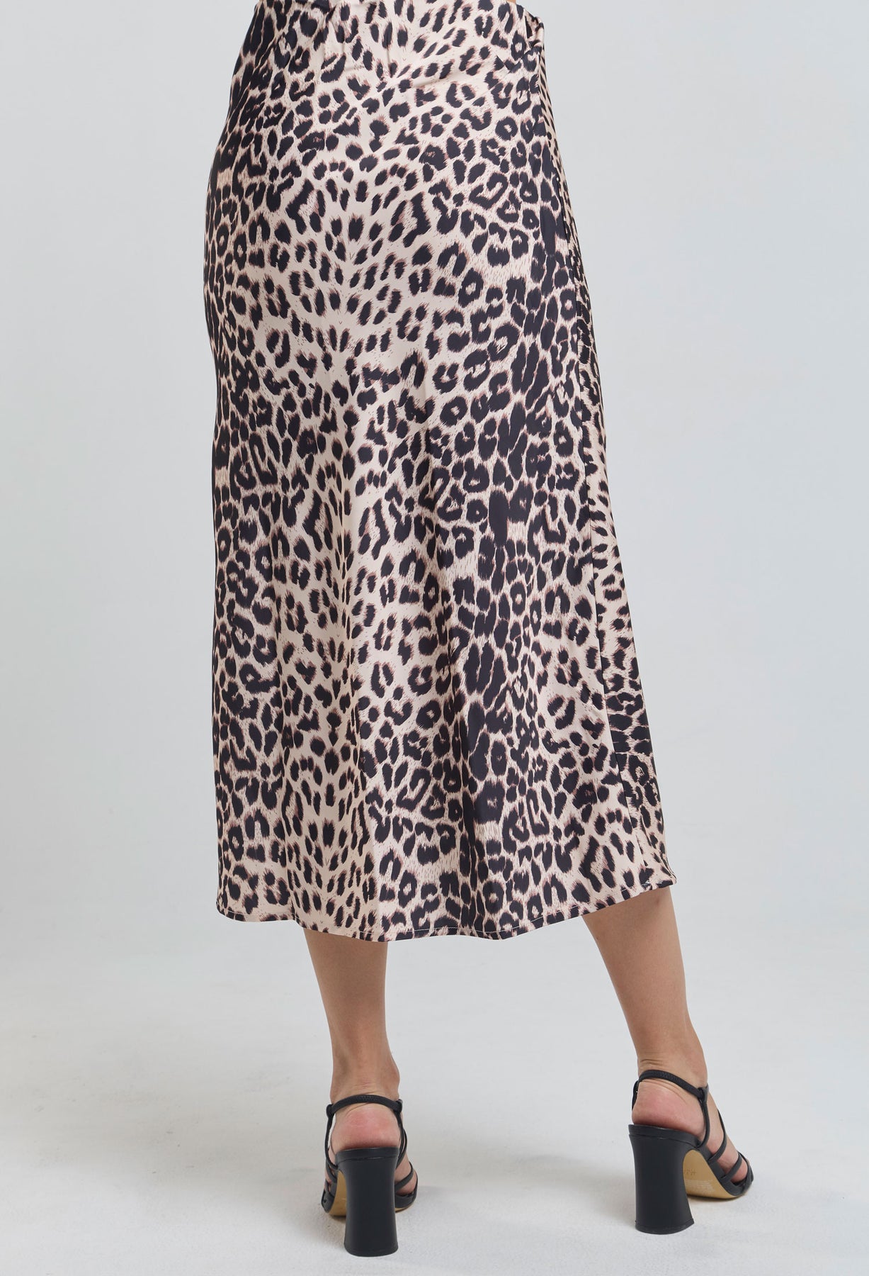 Falda larga con estampado animal print leopardo con pretina enresortada. La modelo mide 1.74 m y lleva puesta la talla S. Los accesorios de esta foto no vienen con la prenda. COMPOSICIÓN: 100% POLIESTER. SIN FORRO. Instrucciones de Lavado: Lavar a mano con agua fría, usar detergente suave, no retorcer en el secado, no usar secadora, no usar suavizante.