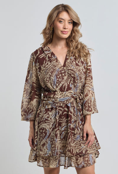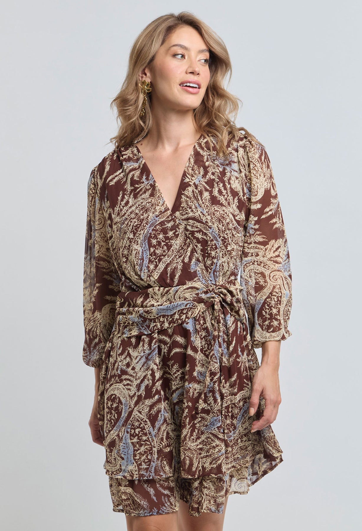 Vestido corto con detalle en la cintura, cuello en v con broche frontal, manga larga con puño resortado, estampado de hojas.