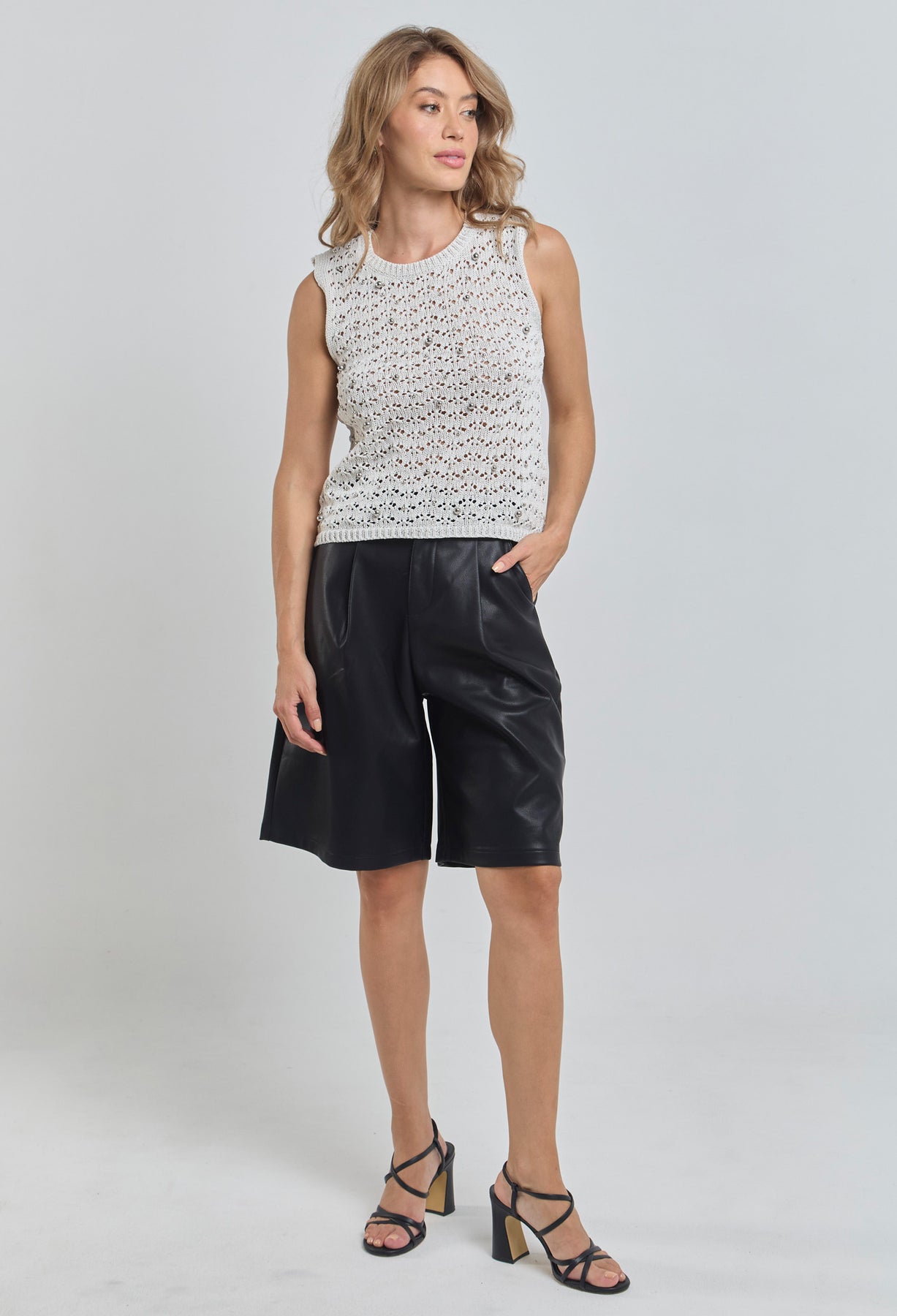 Blusa tejida, cuello redondo con borde ondulado, sin mangas. La modelo mide 1.74 m y lleva puesta la talla ÚNICA.