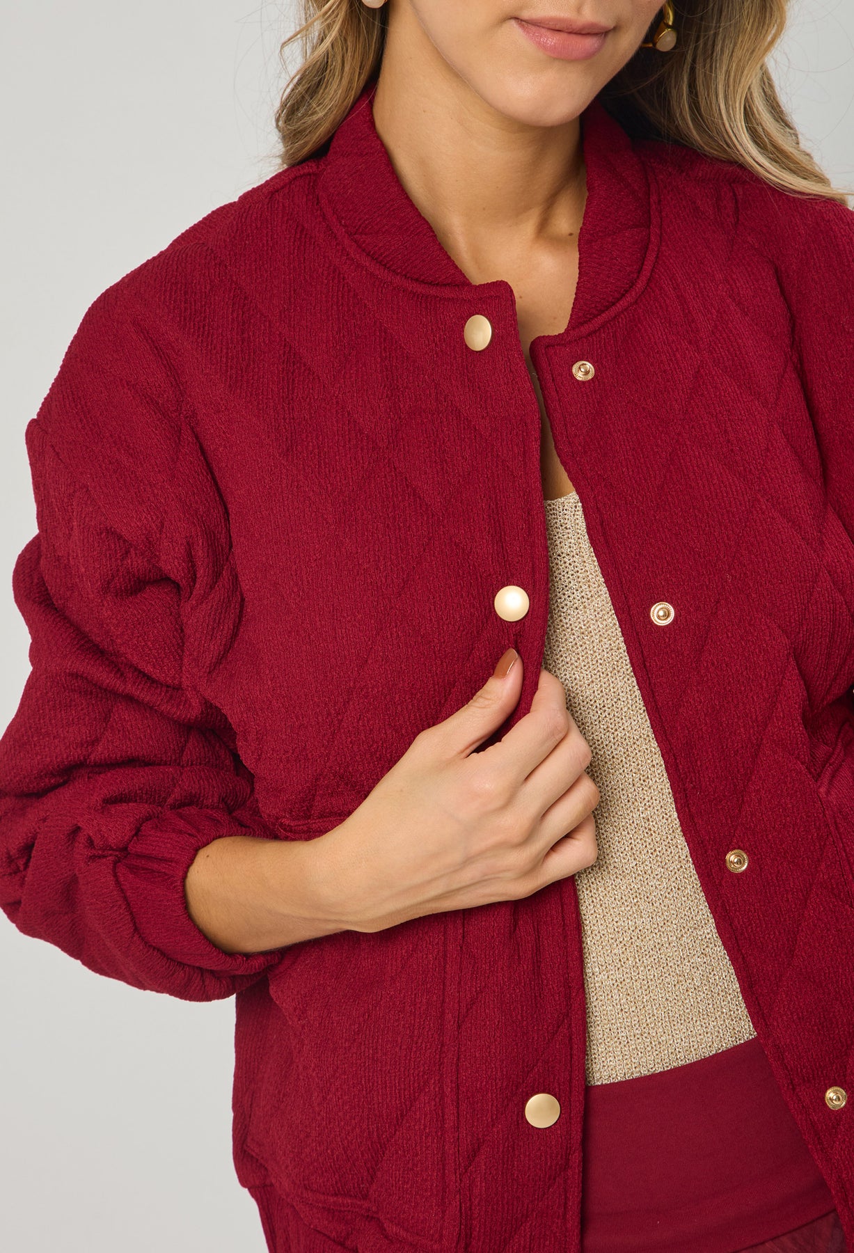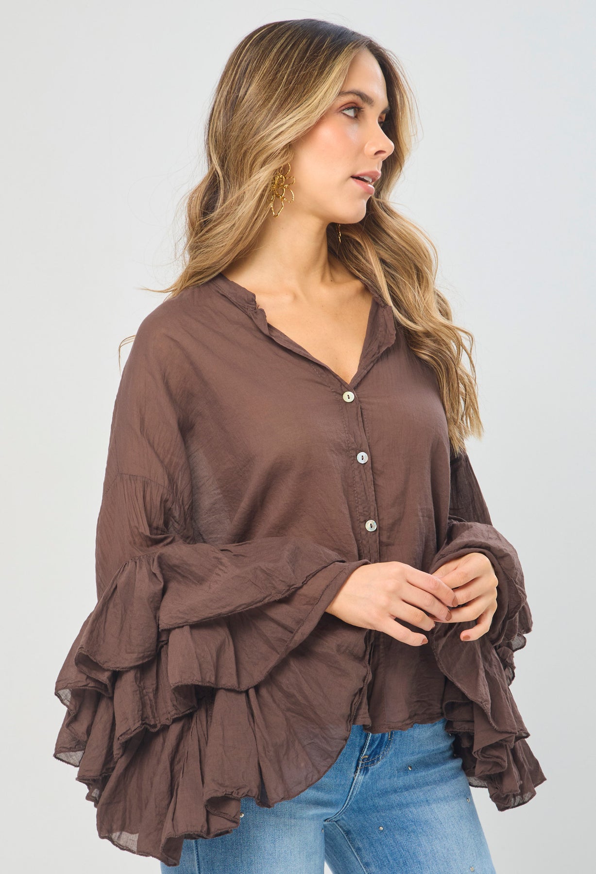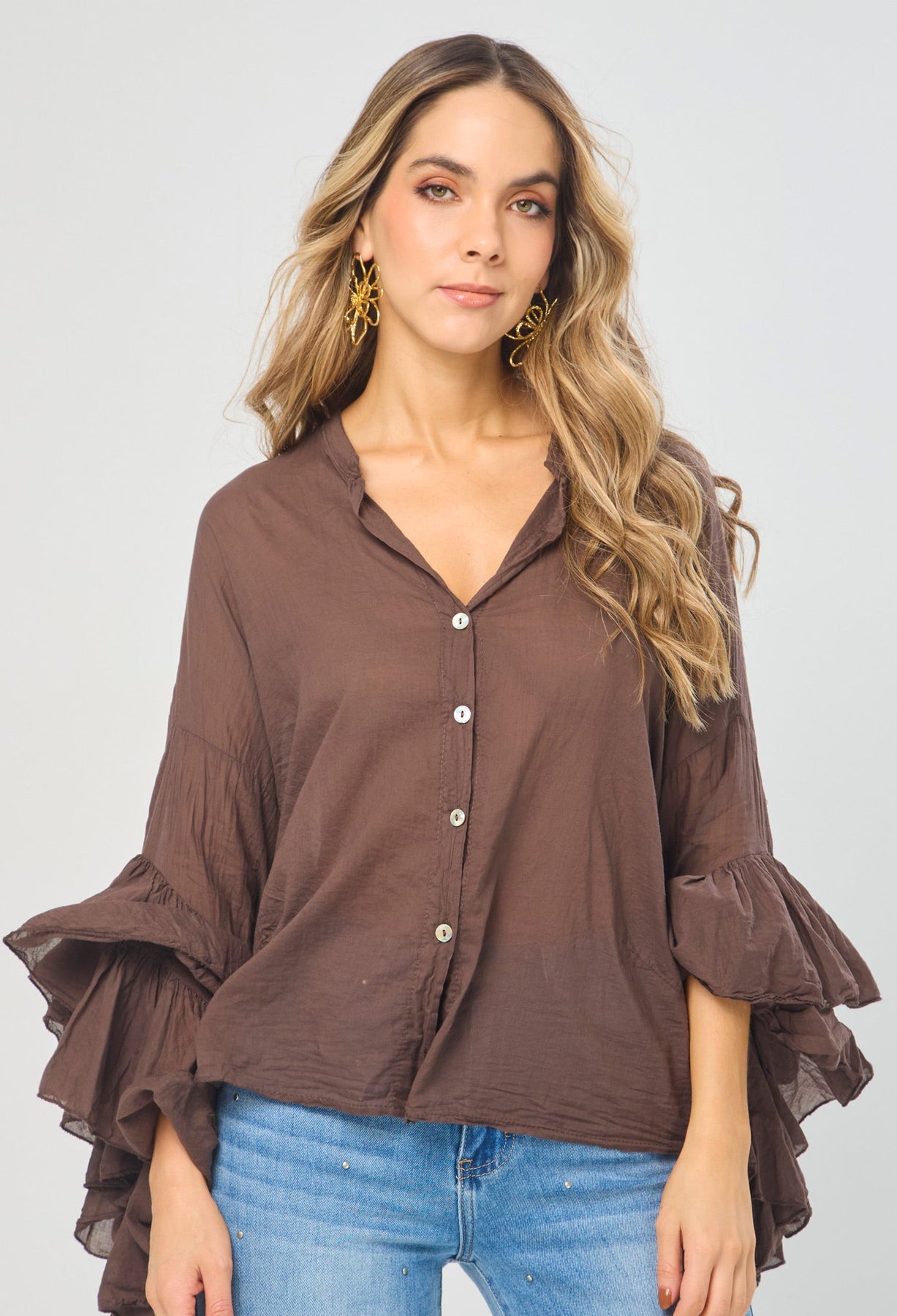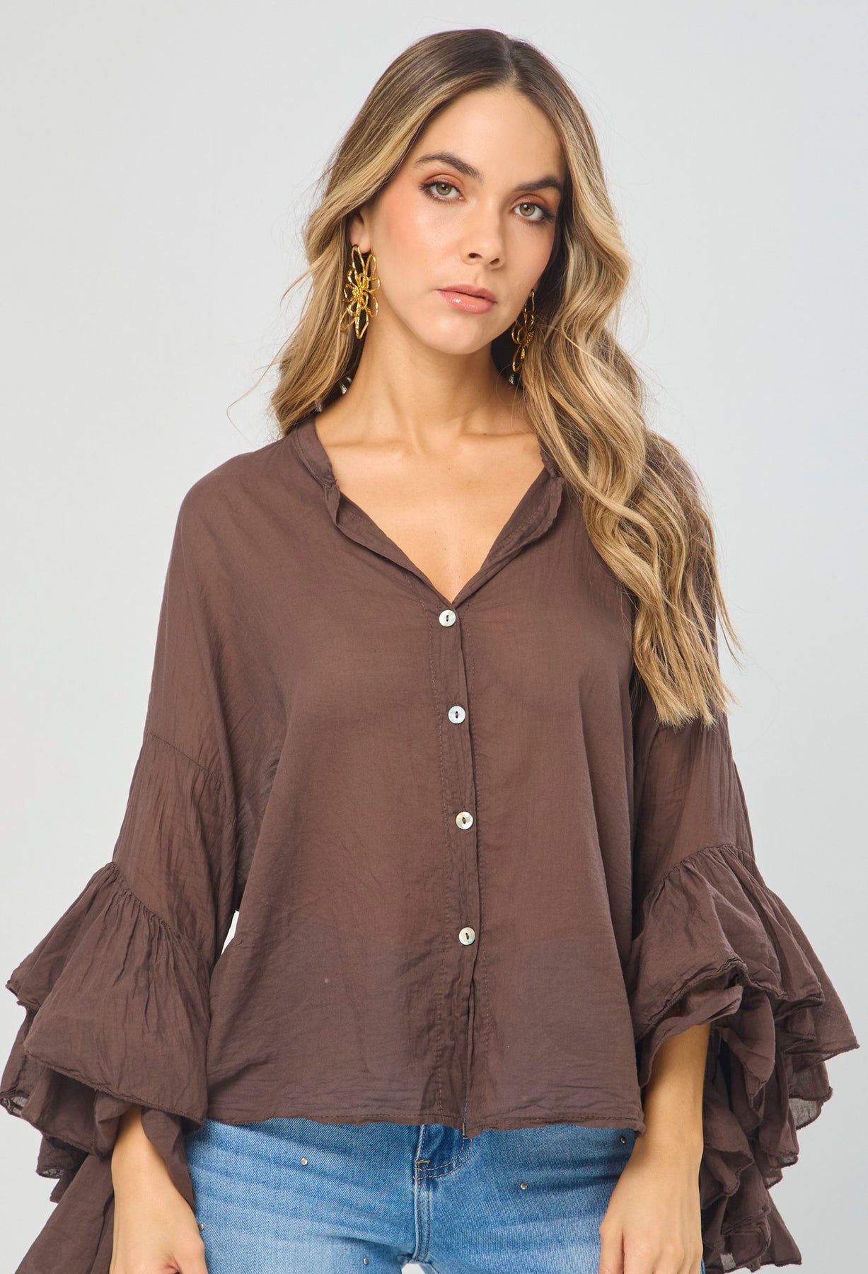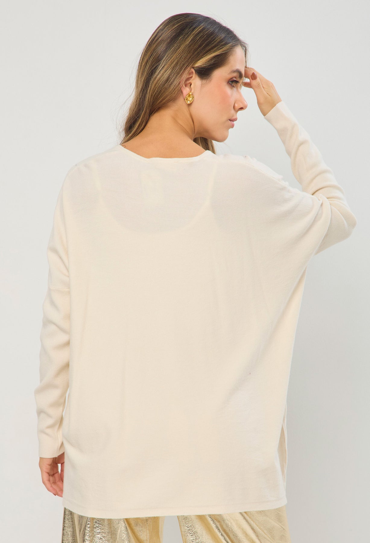 Blusa estilo oversize cuello neru con botonadura en frente completa, manga larga con boleros. La altura de la modelo es 1.72cm y esta usando una talla única.
