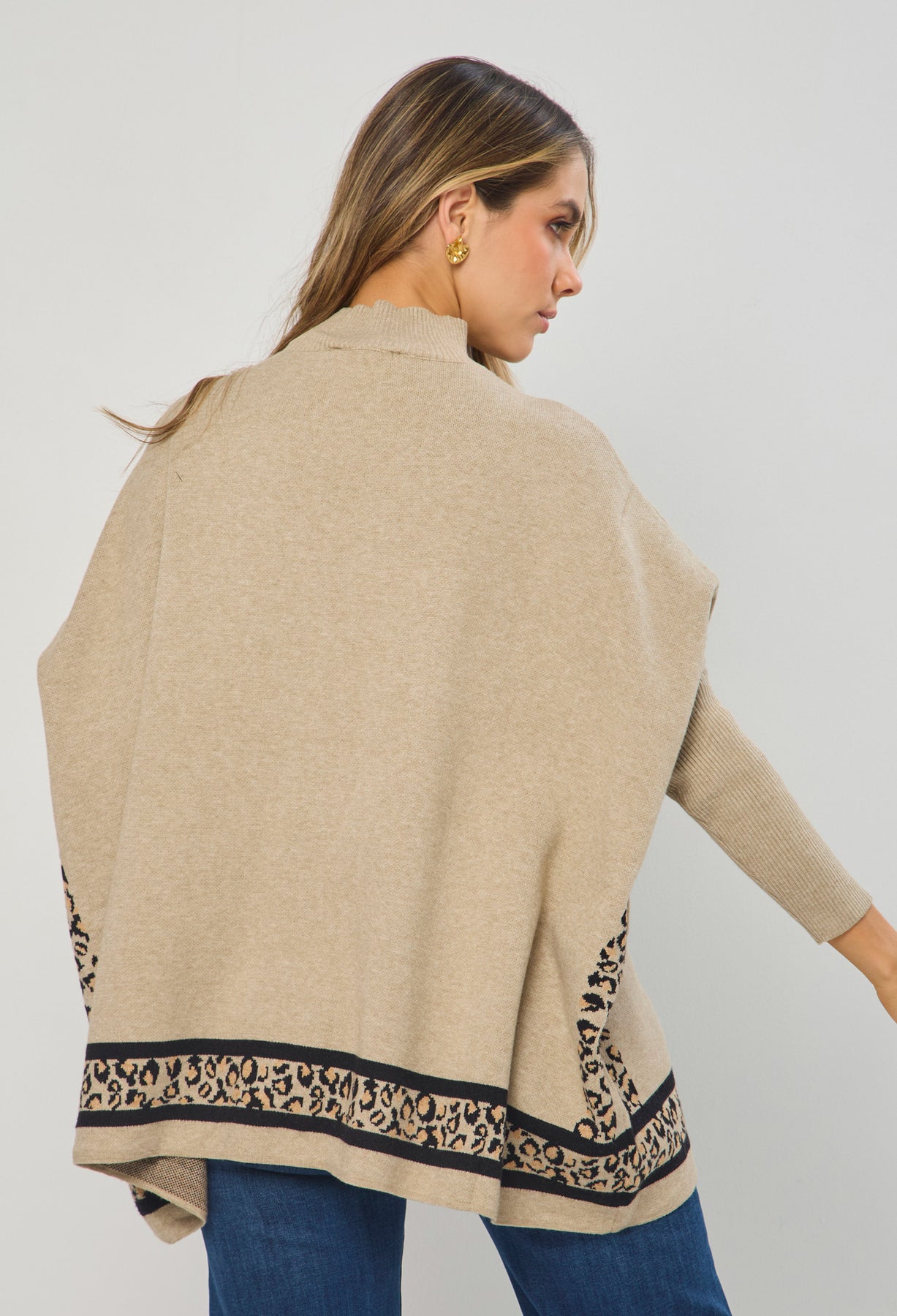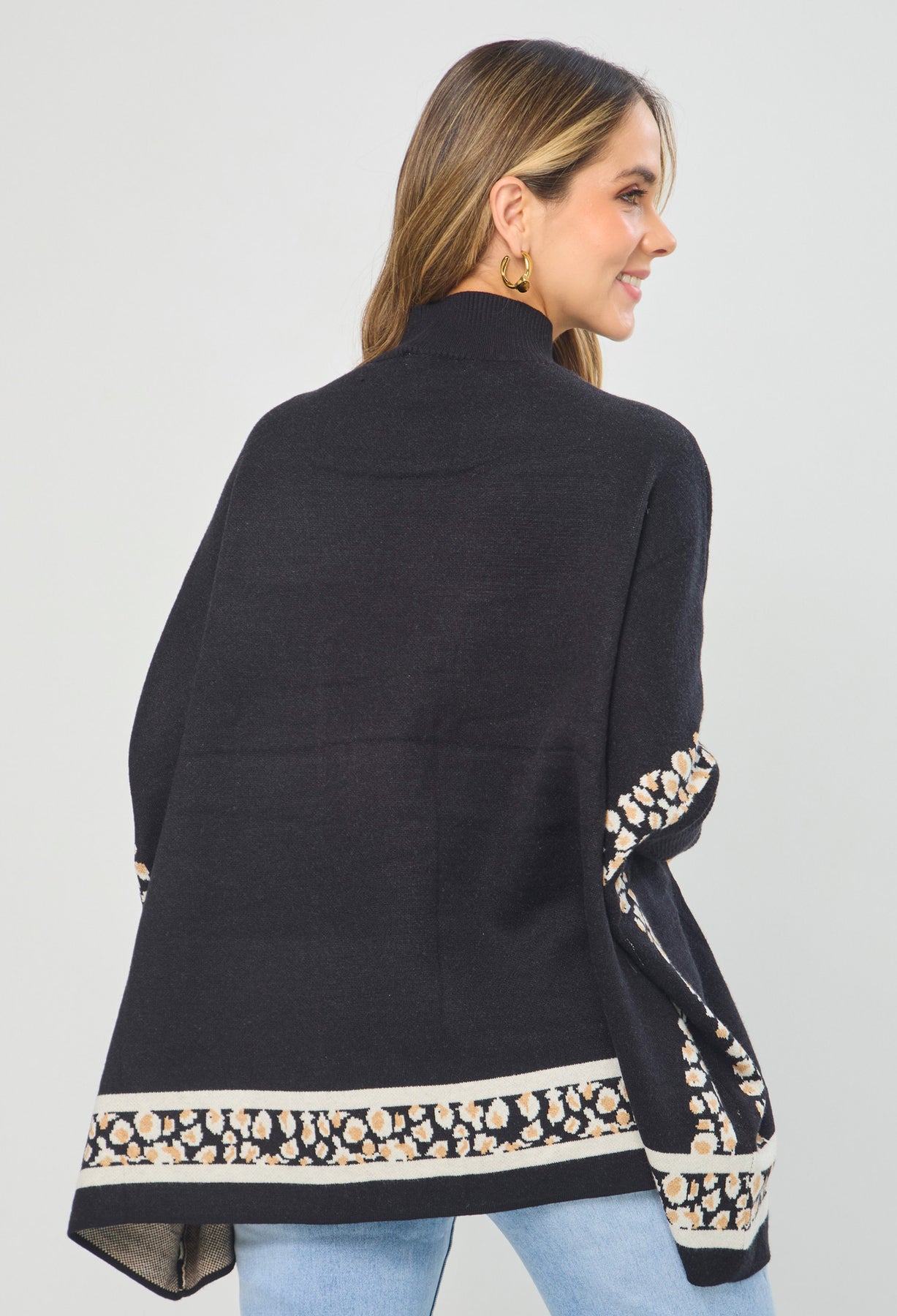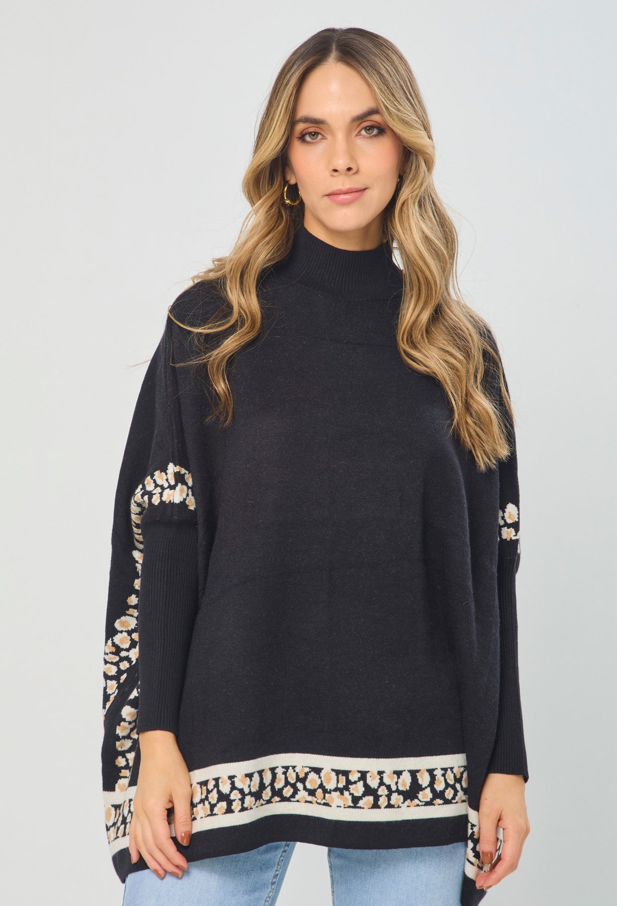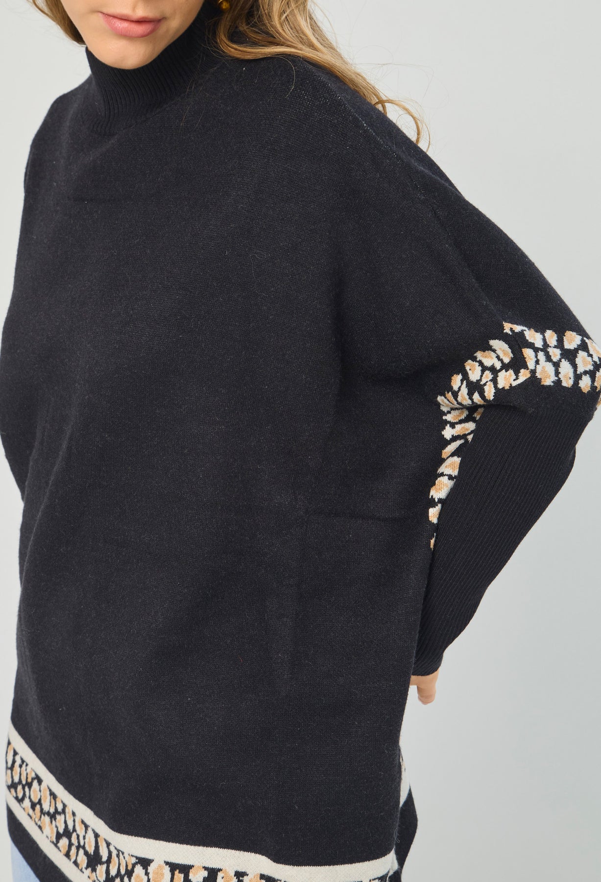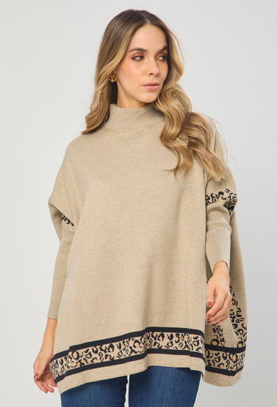 Buzo cuello alto, manga larga estilo mariposa con Rib, detalles en Animal Print en costados y ruedo. La altura de la modelo es 1.72cm y esta usando una talla única. COMPOSICIÓN: 55% VISCOSA, 27% ACRILICO, 18% NAILON. SIN FORRO. Los accesorios de esta foto no vienen con la prenda. Instrucciones de Lavado: Lavar a mano con agua fría, usar detergente suave, no retorcer en el secado, no usar secadora, no usar suavizante.