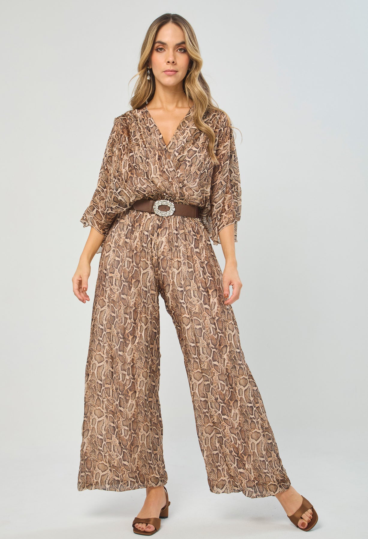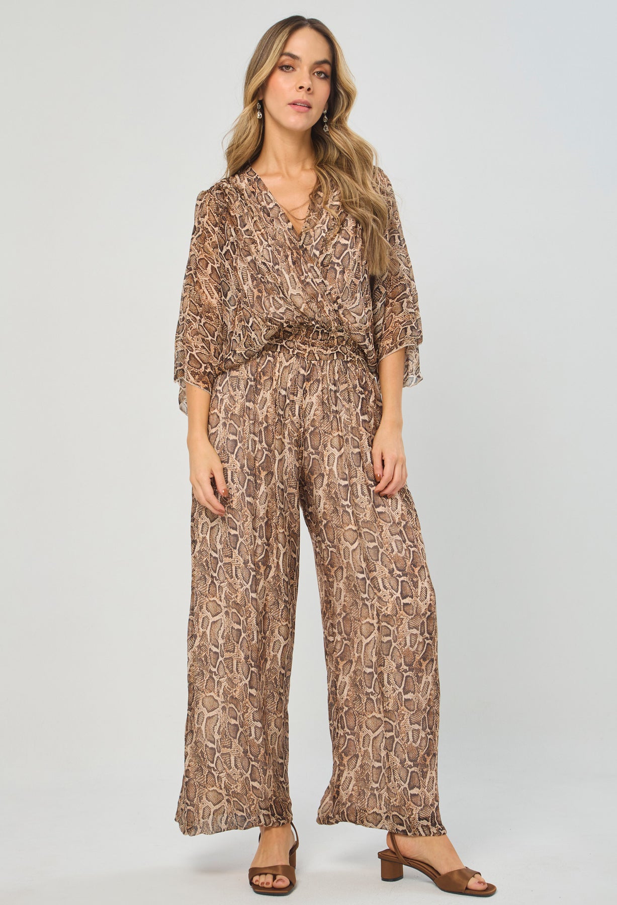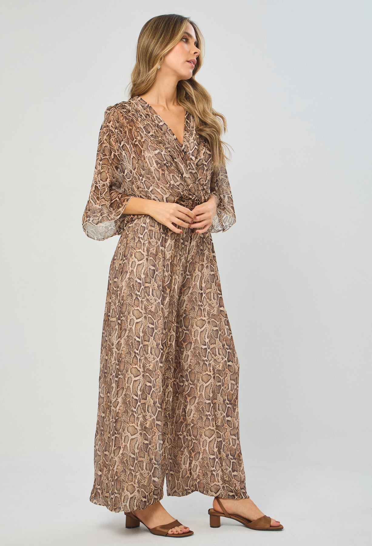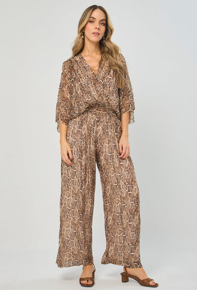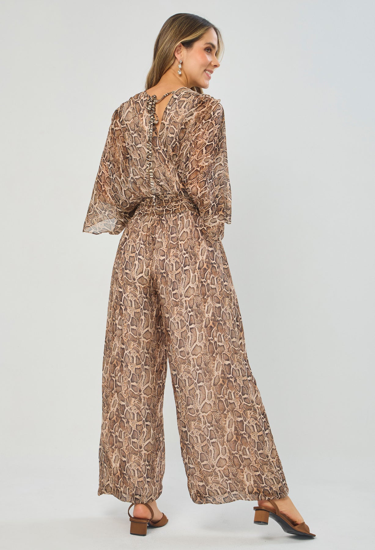 Enterizo seda escote V profundo delantero/posterior, manga corta, cintura enresortada y ajuste posterior con tirante en tela, estampado animal print de serpiente. La altura de la modelo es 1.72cm y esta usando una talla única.