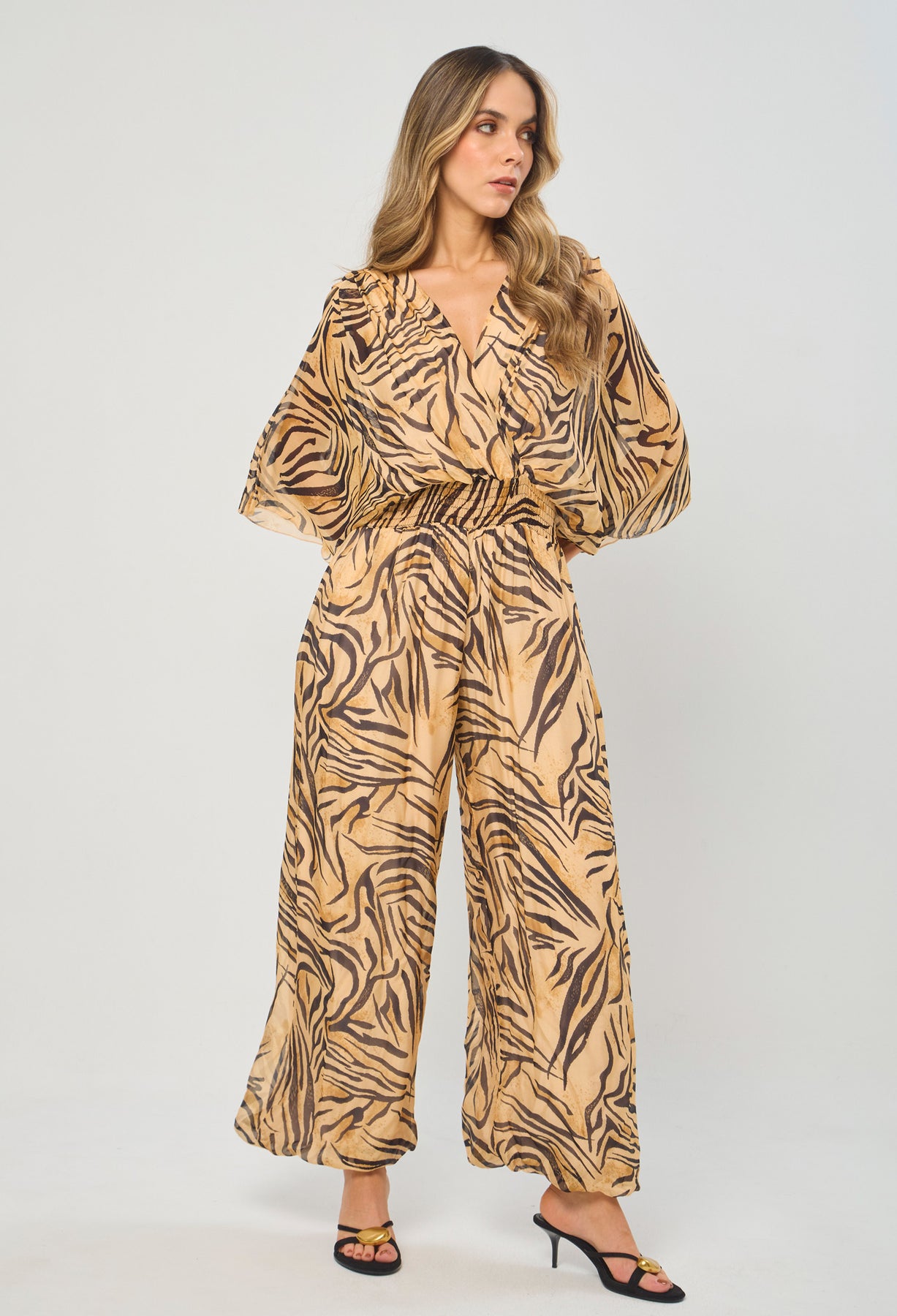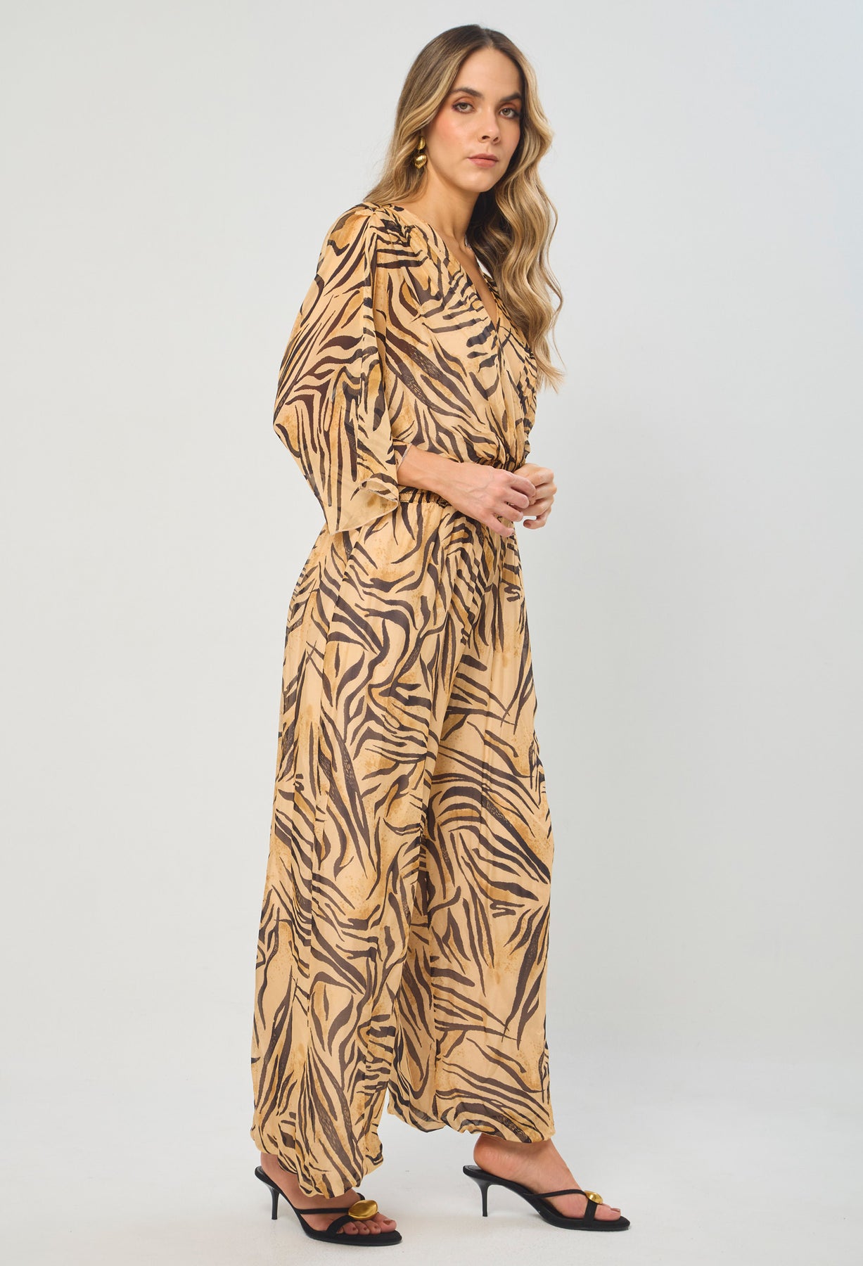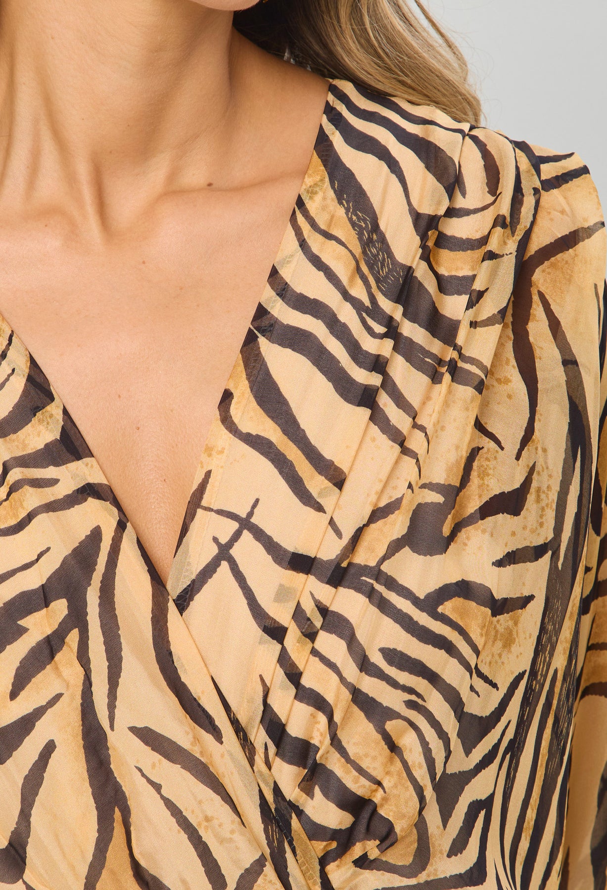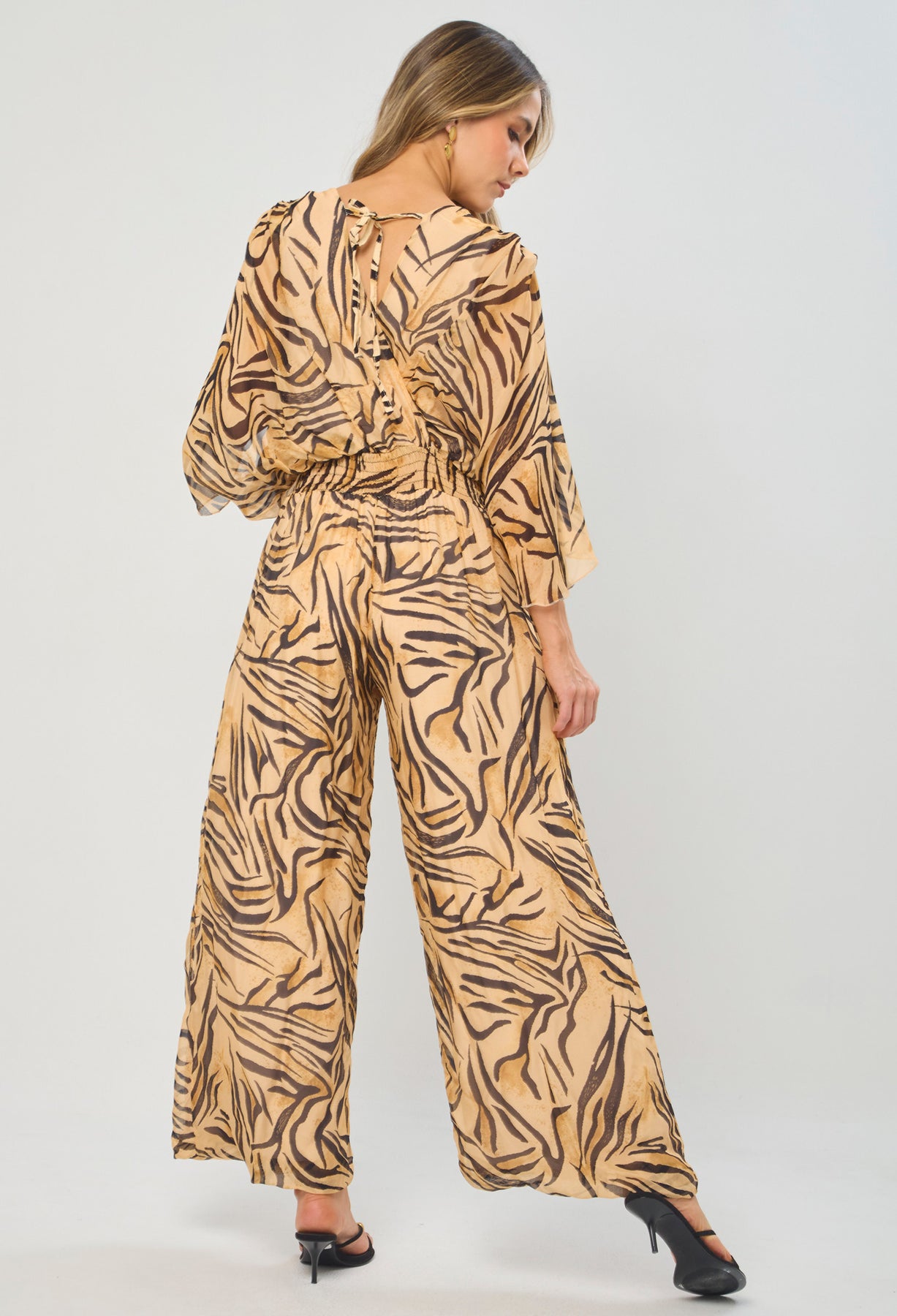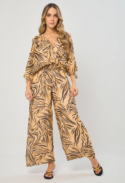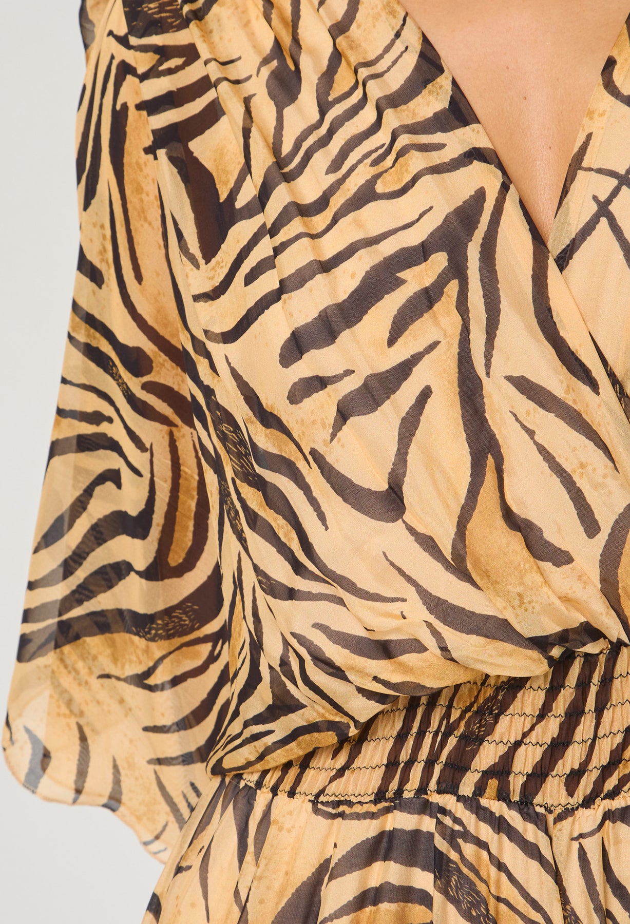 Enterizo seda escote V profundo delantero/posterior, manga corta, cintura enresortada y ajuste posterior con tirante en tela, estampado animal print de tigre. La altura de la modelo es 1.72cm y esta usando una talla única.
