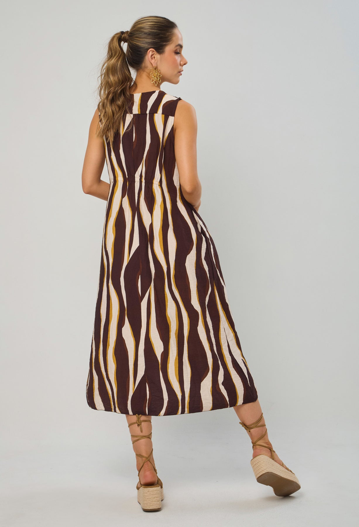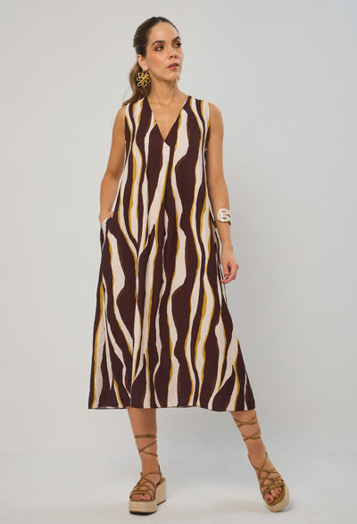 Vestido largo, manga sisa, escote V profundo con estampado en rayas orgánicas, resorte en cintura posterior y bolsillos laterales. La altura de la modelo es 1.72cm y esta usando una talla única. COMPOSICIÓN: 87% VISCOSA, 13% POLIESTER. SIN FORRO. Los accesorios de esta foto no vienen con la prenda. Instrucciones de Lavado: Lavar a mano con agua fría, usar detergente suave, no retorcer en el secado, no usar secadora, no usar suavizante.