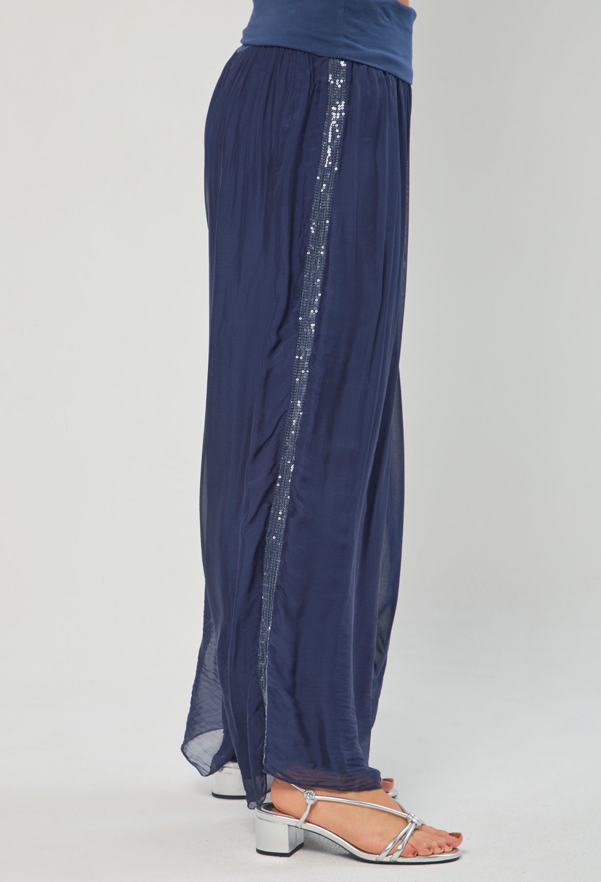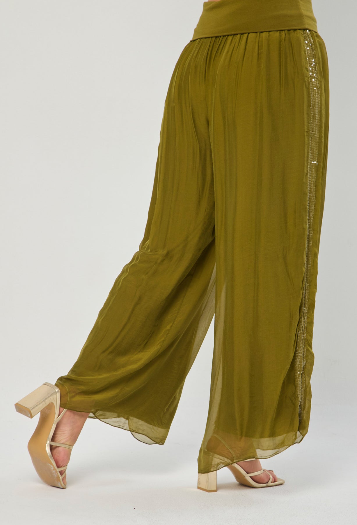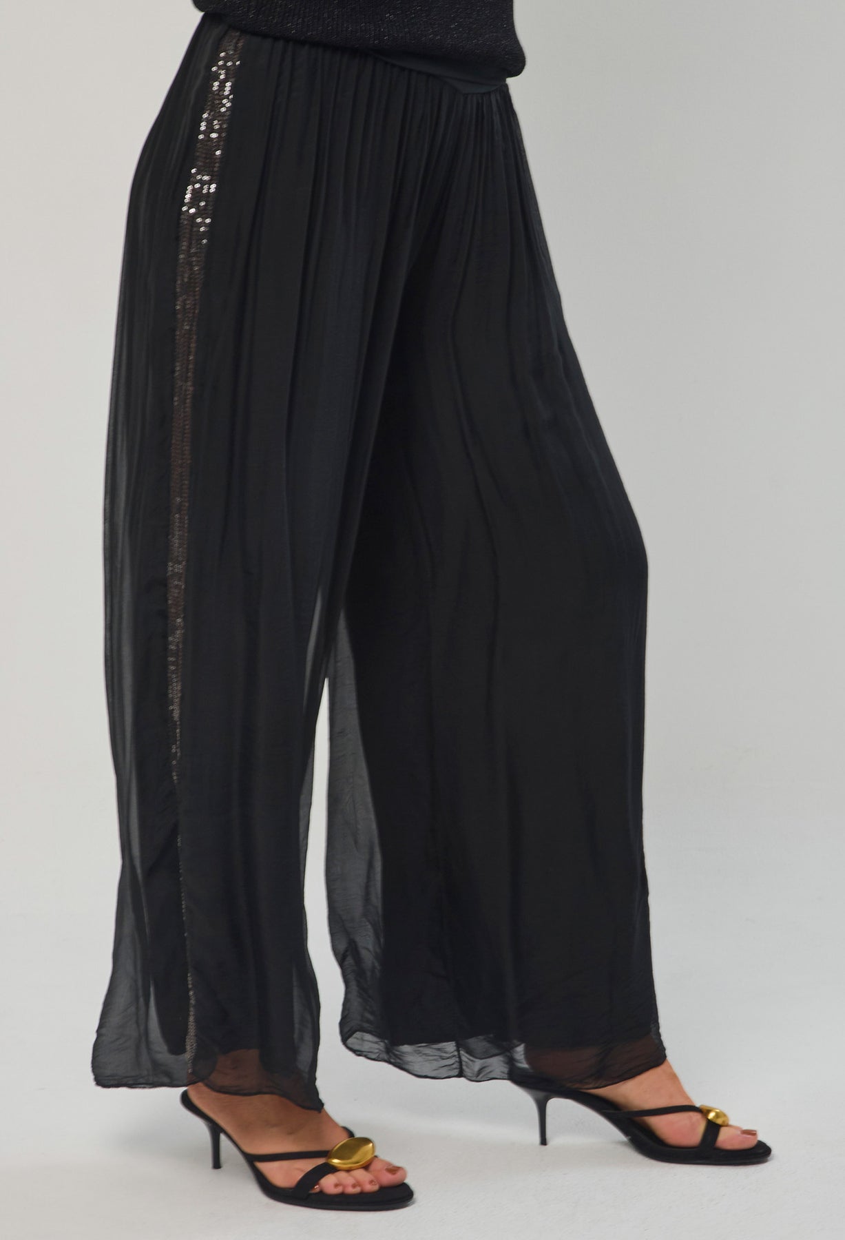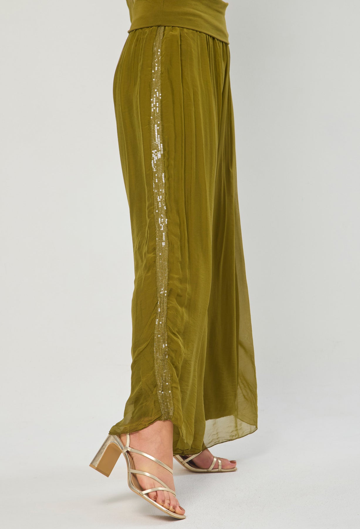 Pantalón seda con detalle en lentejuelas en los laterales, bota recta, pretina de fajón. La modelo mide 1.70 m y lleva puesta la talla ÚNICA. Los accesorios de esta foto no vienen con la prenda.