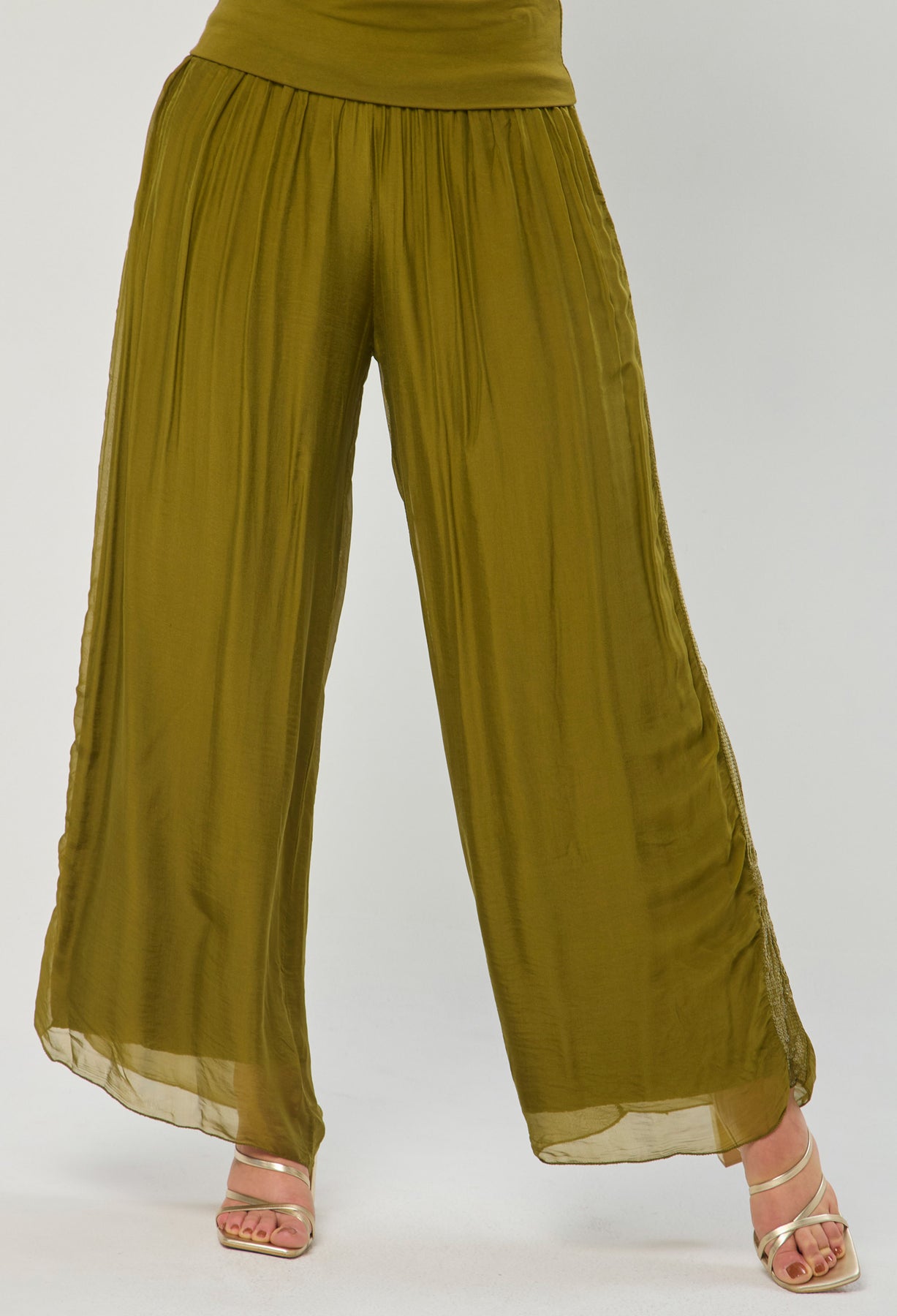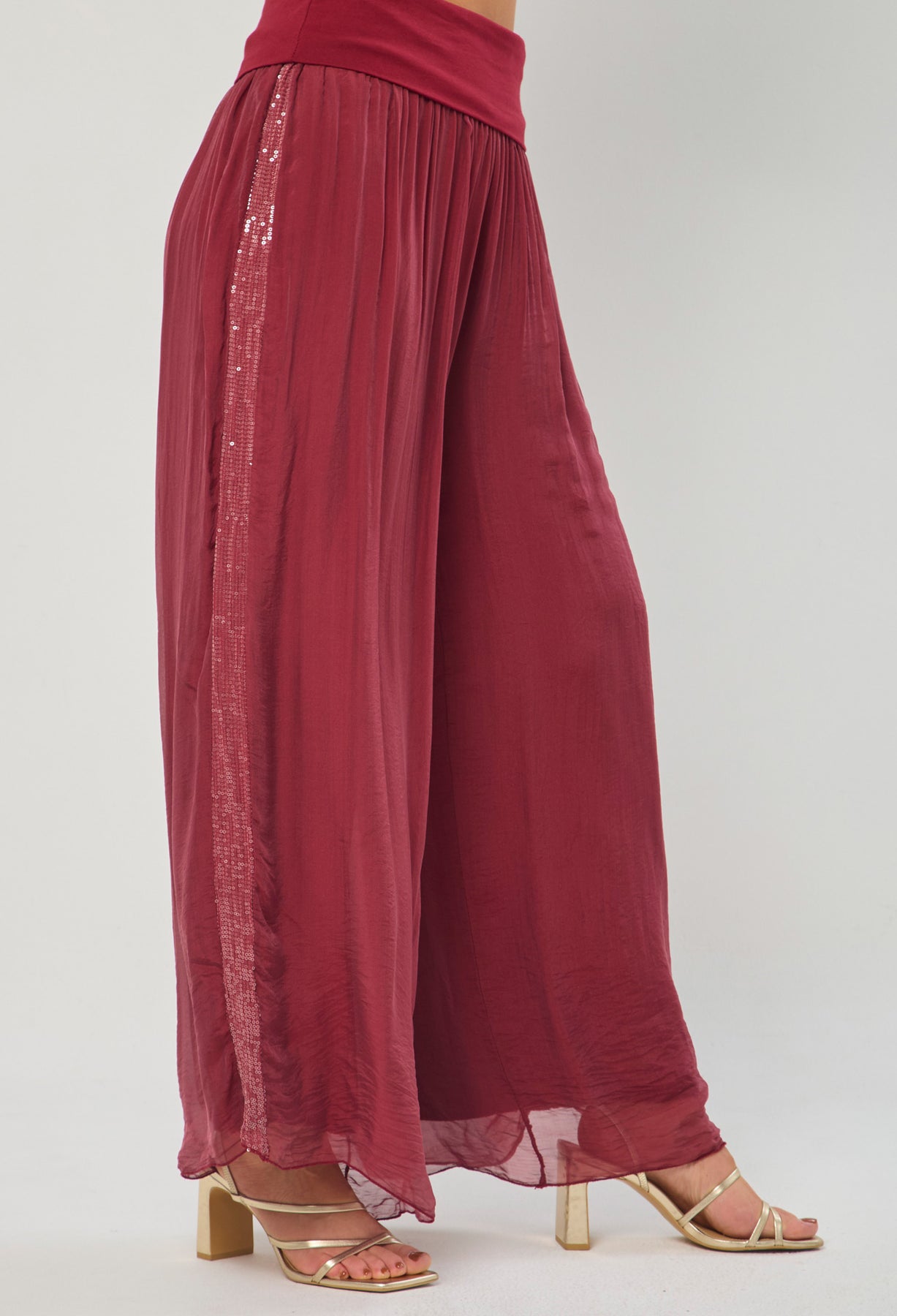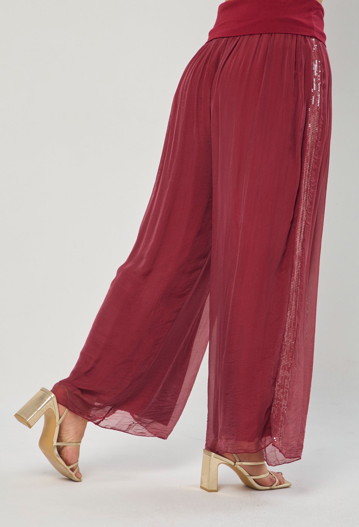 Pantalón seda con detalle en lentejuelas en los laterales, bota recta, pretina de fajón. La modelo mide 1.70 m y lleva puesta la talla ÚNICA. Los accesorios de esta foto no vienen con la prenda.