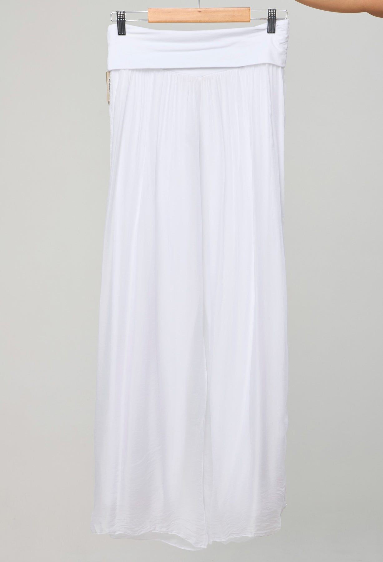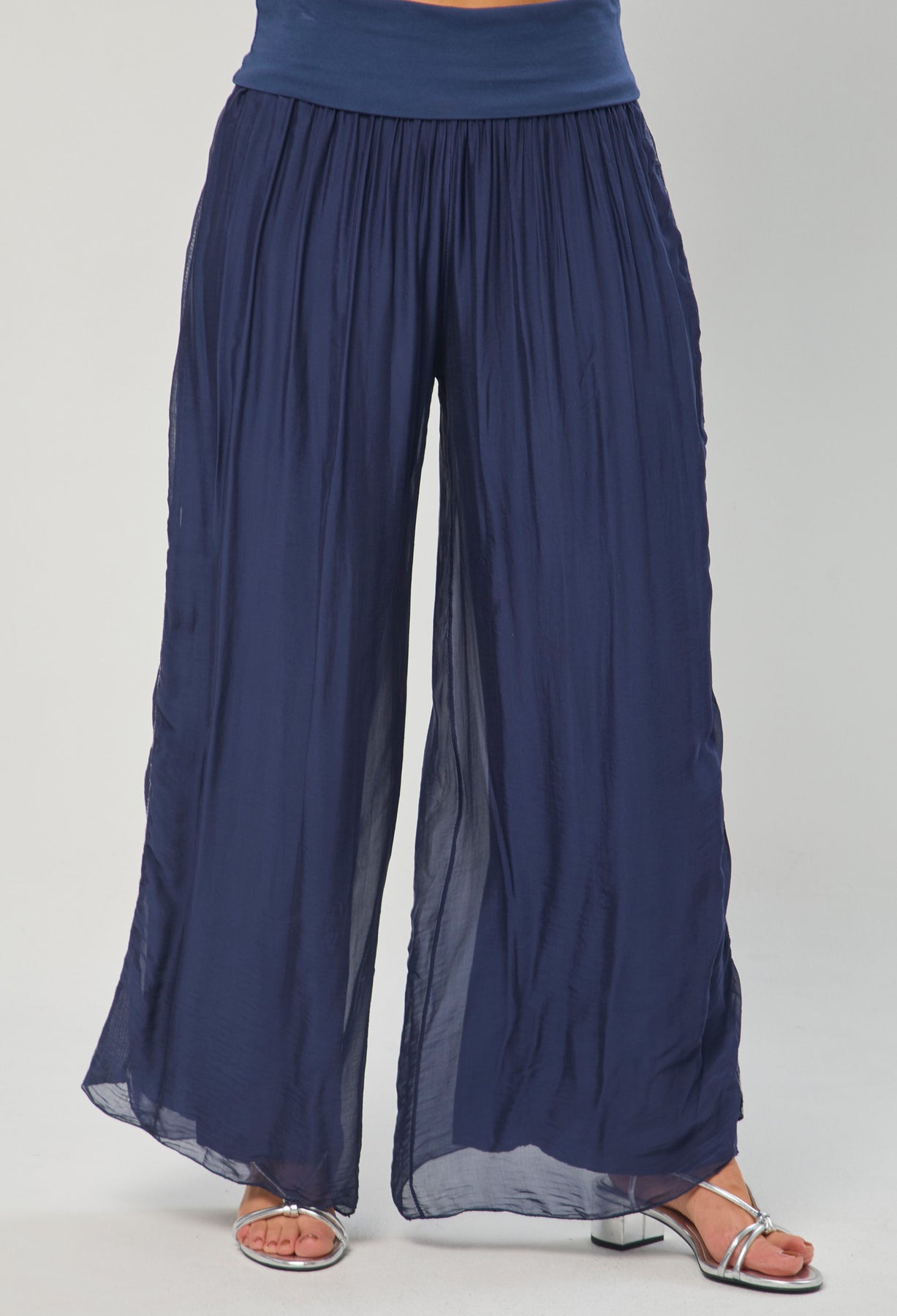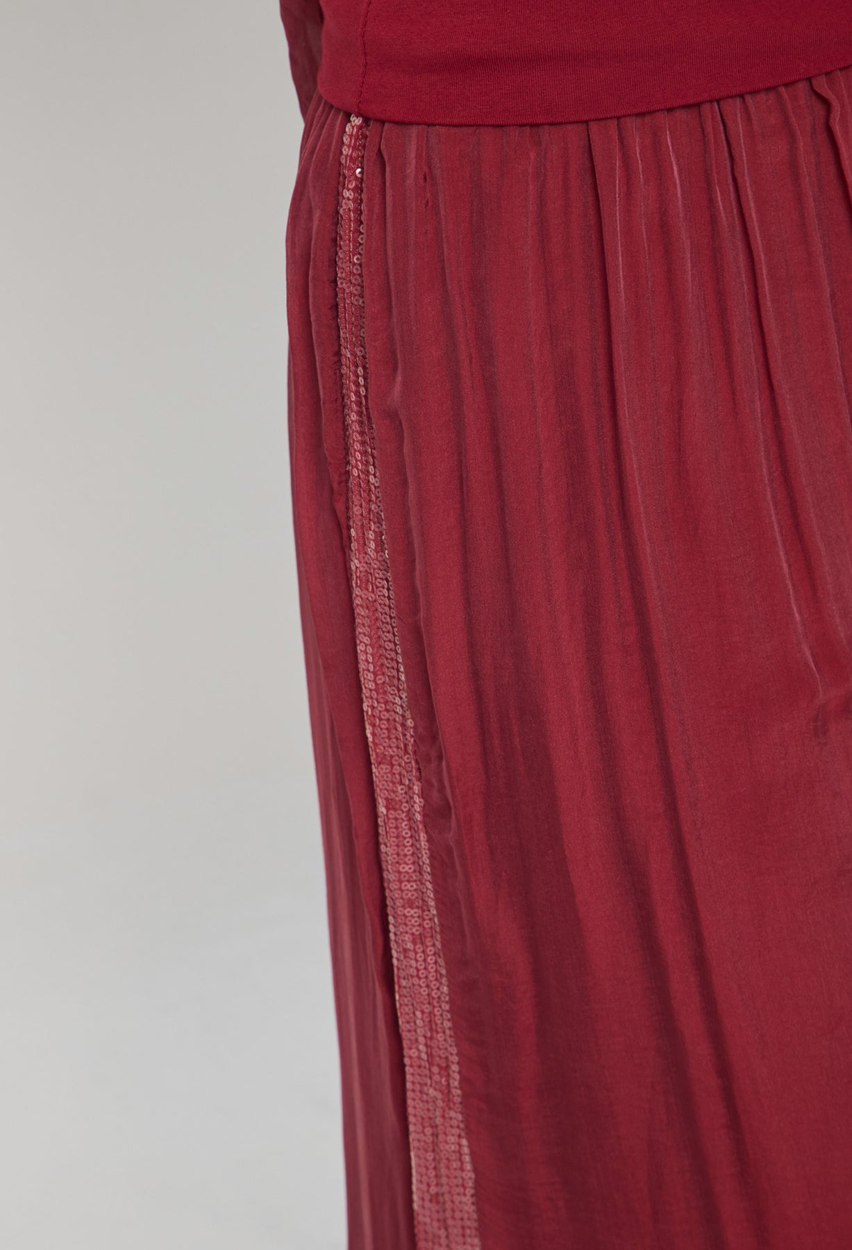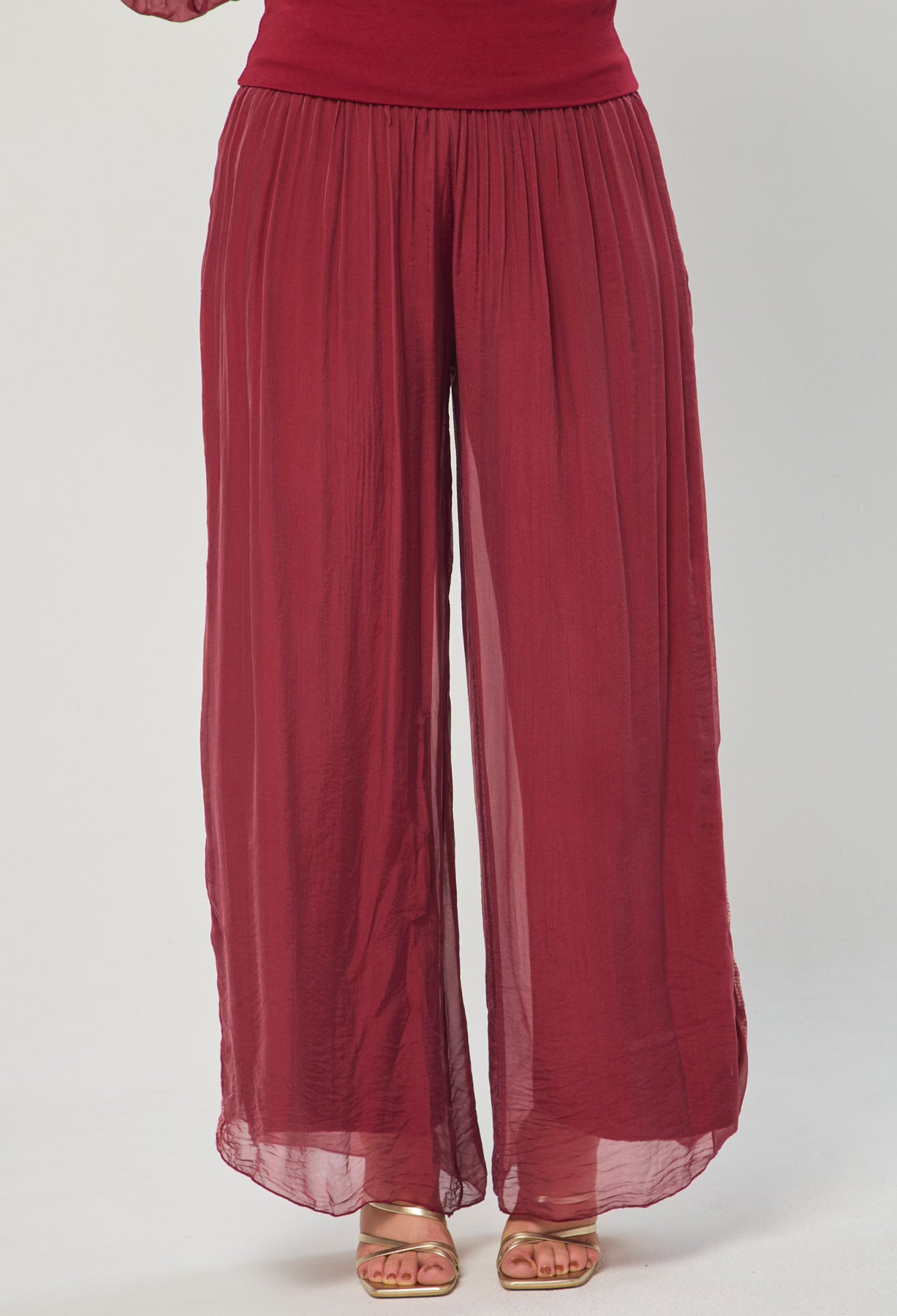 Pantalón seda con detalle en lentejuelas en los laterales, bota recta, pretina de fajón. La modelo mide 1.70 m y lleva puesta la talla ÚNICA. Los accesorios de esta foto no vienen con la prenda.