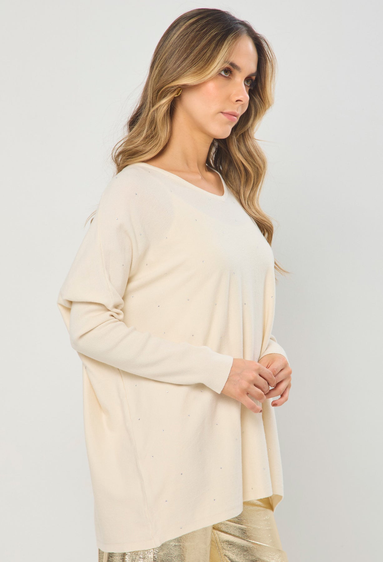 Blusa escote V, manga larga con detalle en piedras brillantes. La altura de la modelo es 1.72cm y esta usando una talla única. COMPOSICIÓN: 51% VISCOSA, 28% POLIESTER, 21% NAILON. SIN FORRO. DETALLE: 100% SINTETICO. Los accesorios de esta foto no vienen con la prenda. Instrucciones de Lavado: Lavar a mano con agua fría, usar detergente suave, no retorcer en el secado, no usar secadora, no usar suavizante.