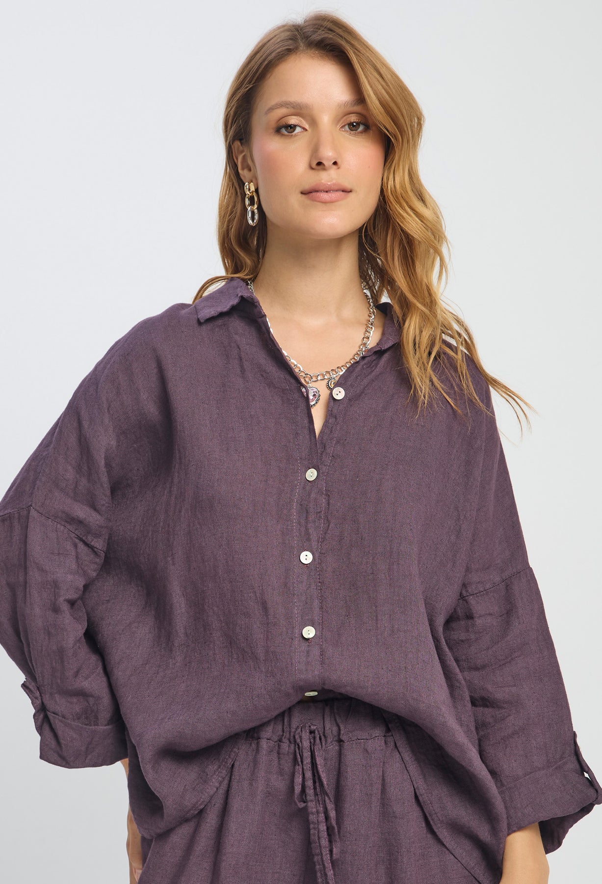 Precio habitual $269.900Blusa en lino, manga larga ajustable, cuello y botonadura en frente completa. La altura de la modelo es 1.77cm y esta usando una talla única.