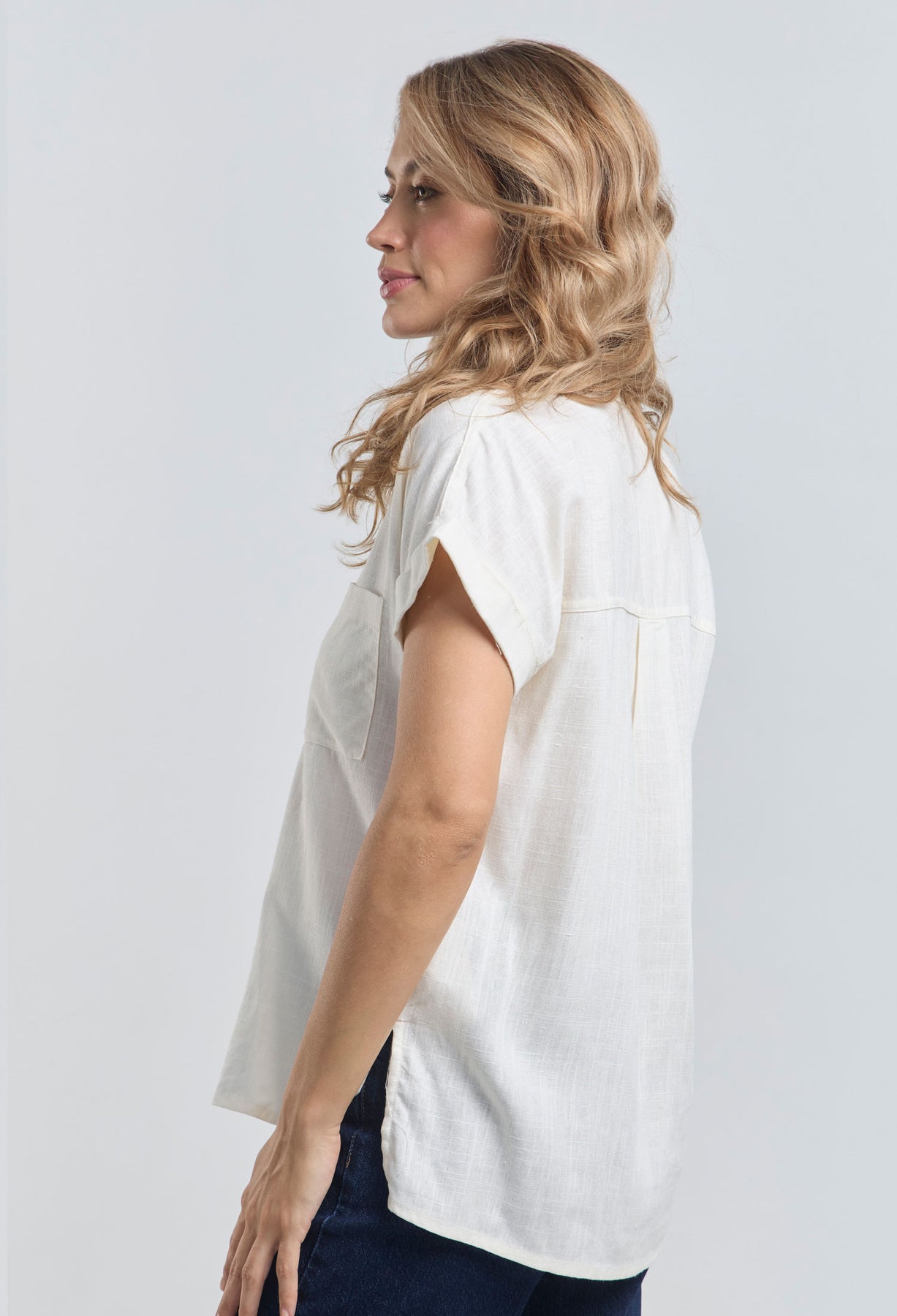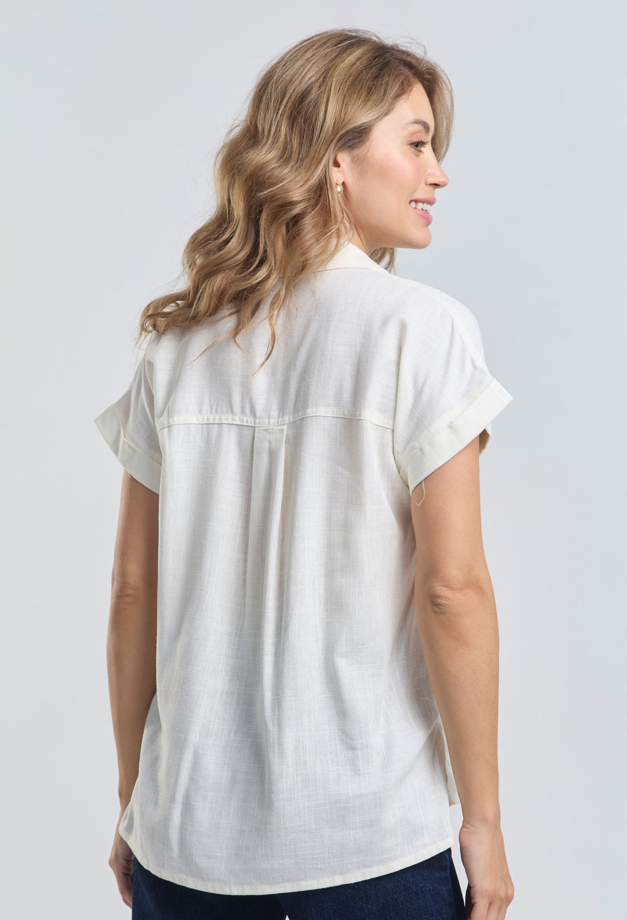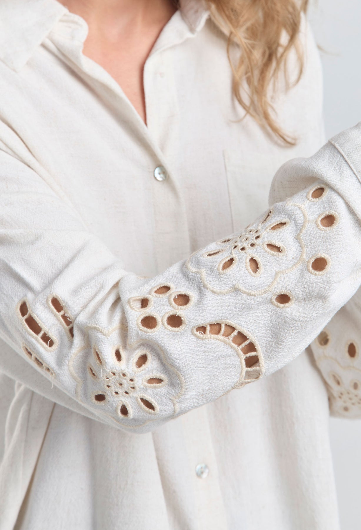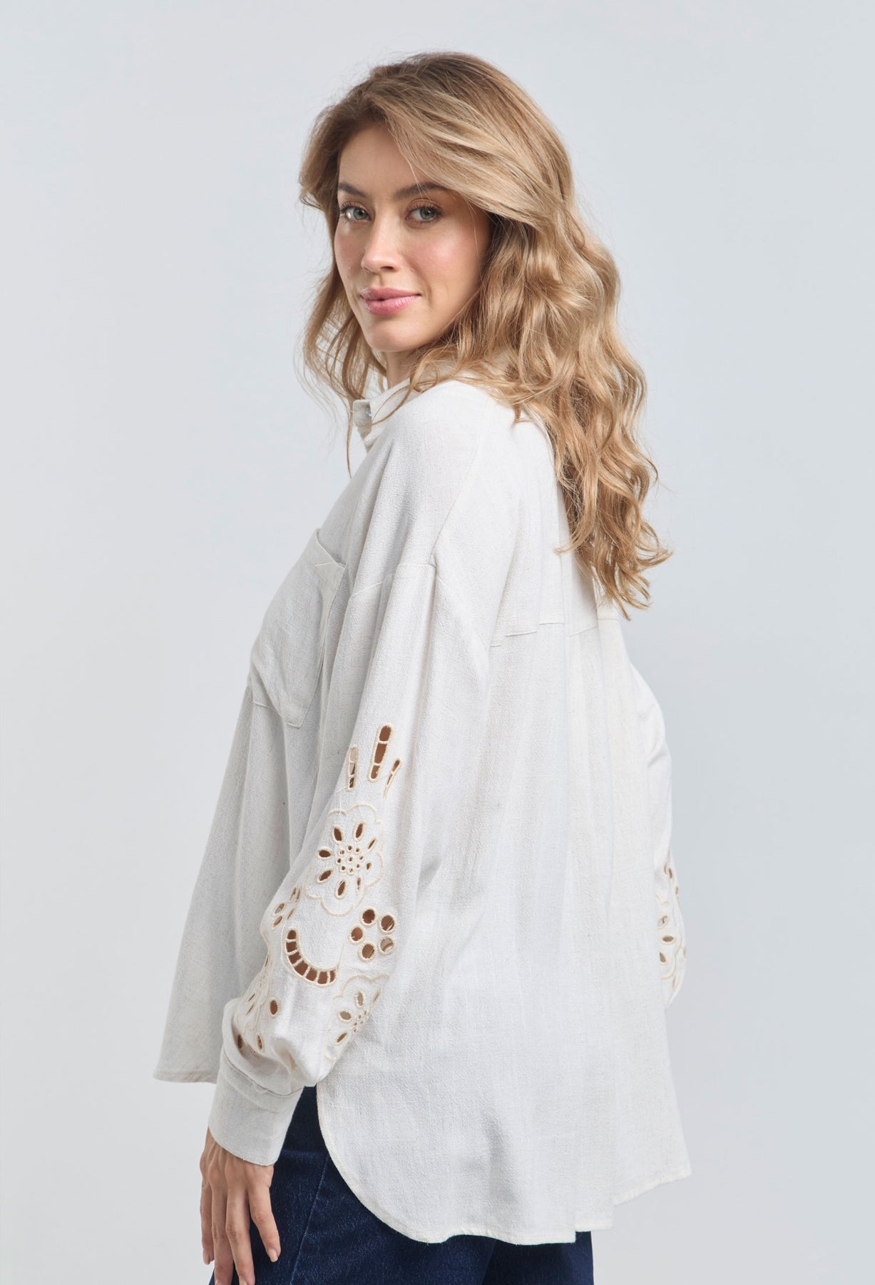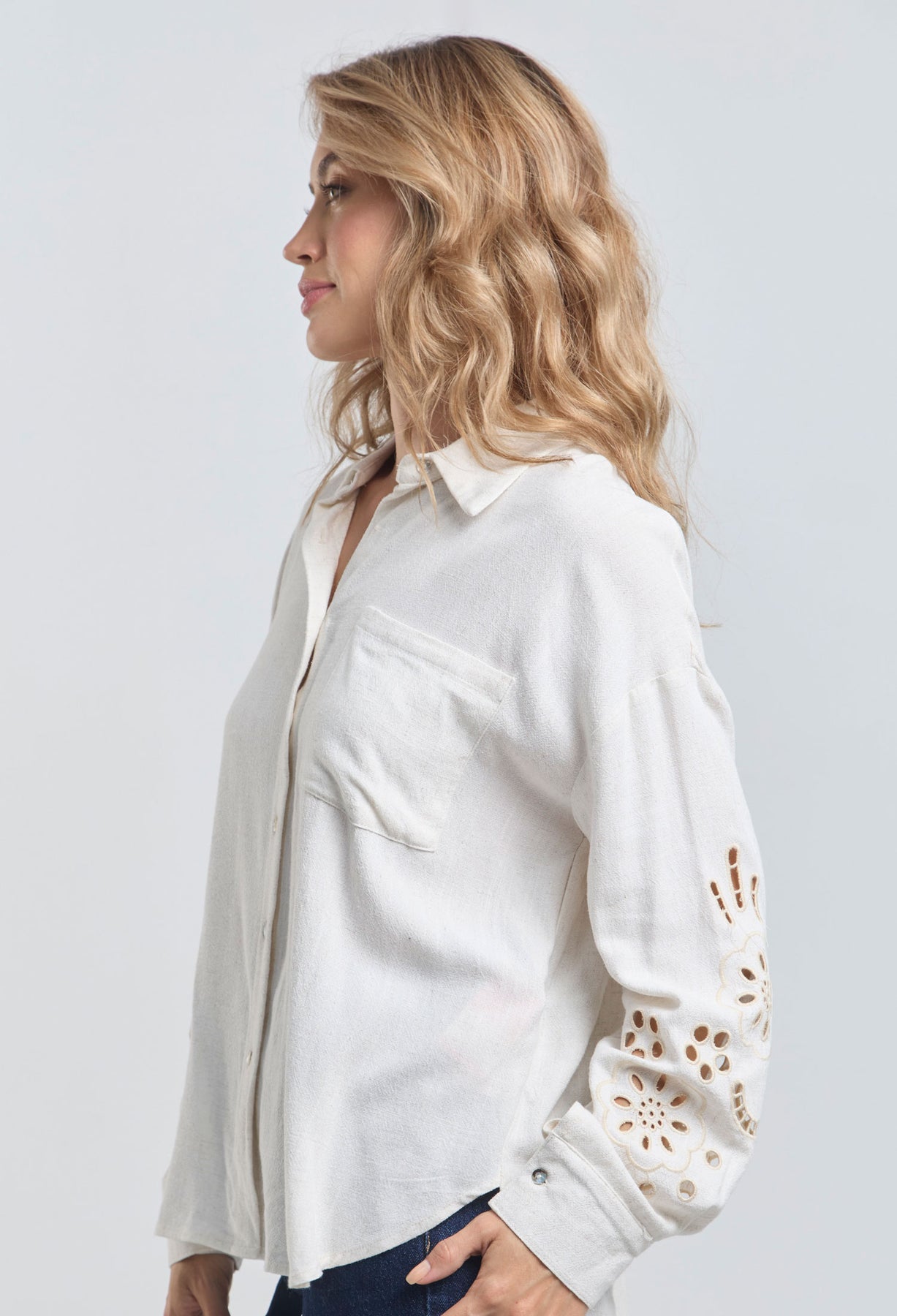 Camisa manga larga, bordado en mangas estilo floral, botonería delantera y puños, bolsillo delantero, corte asimétrico.