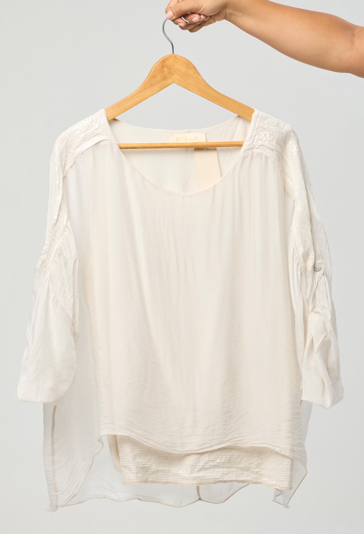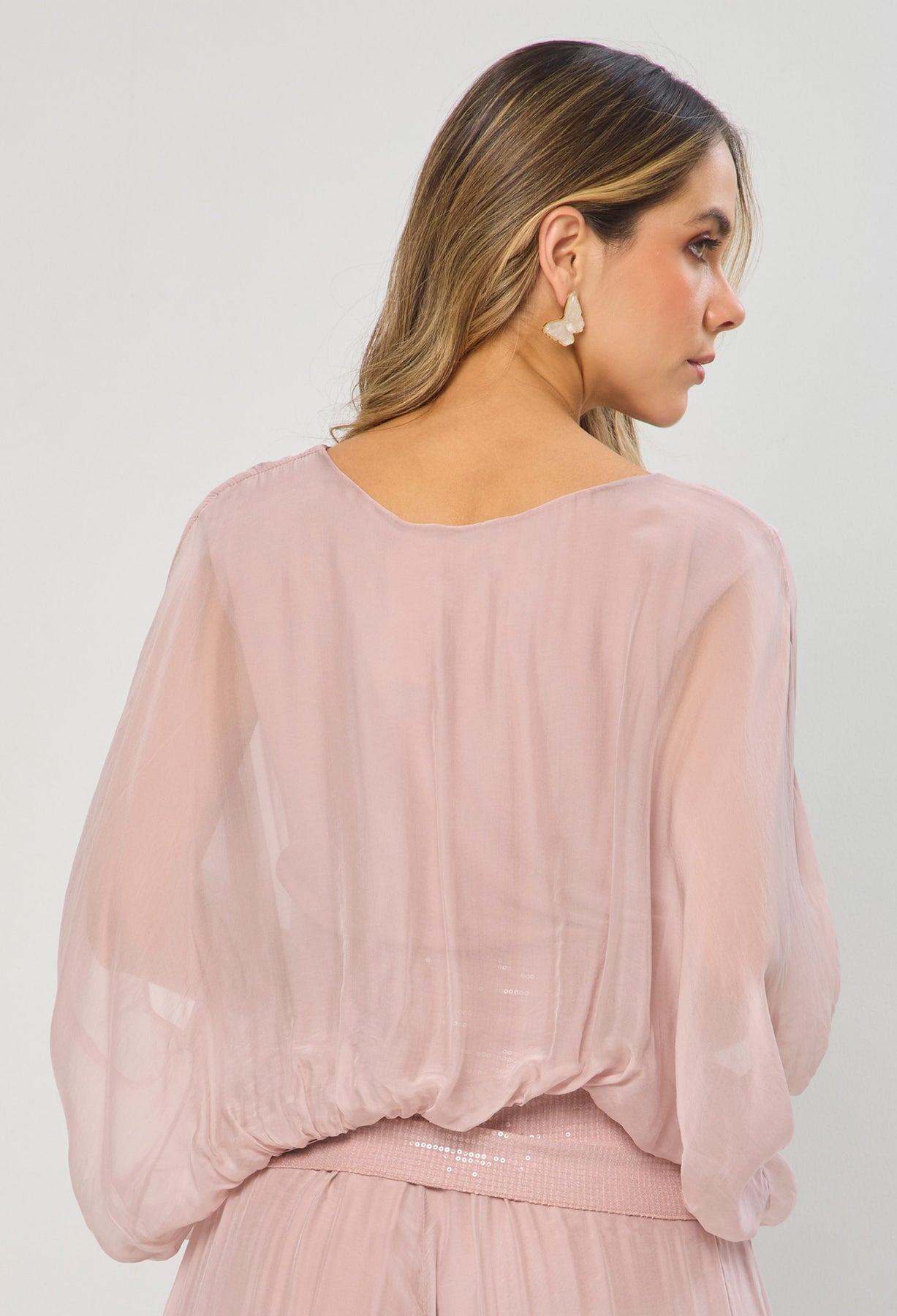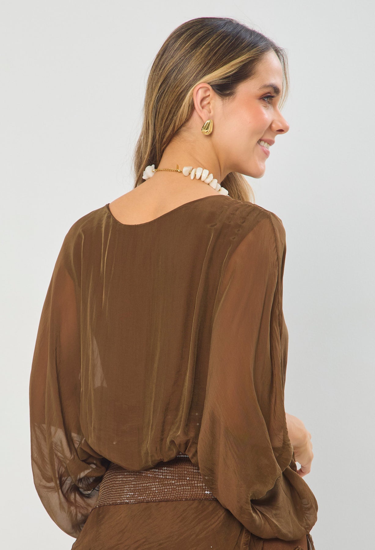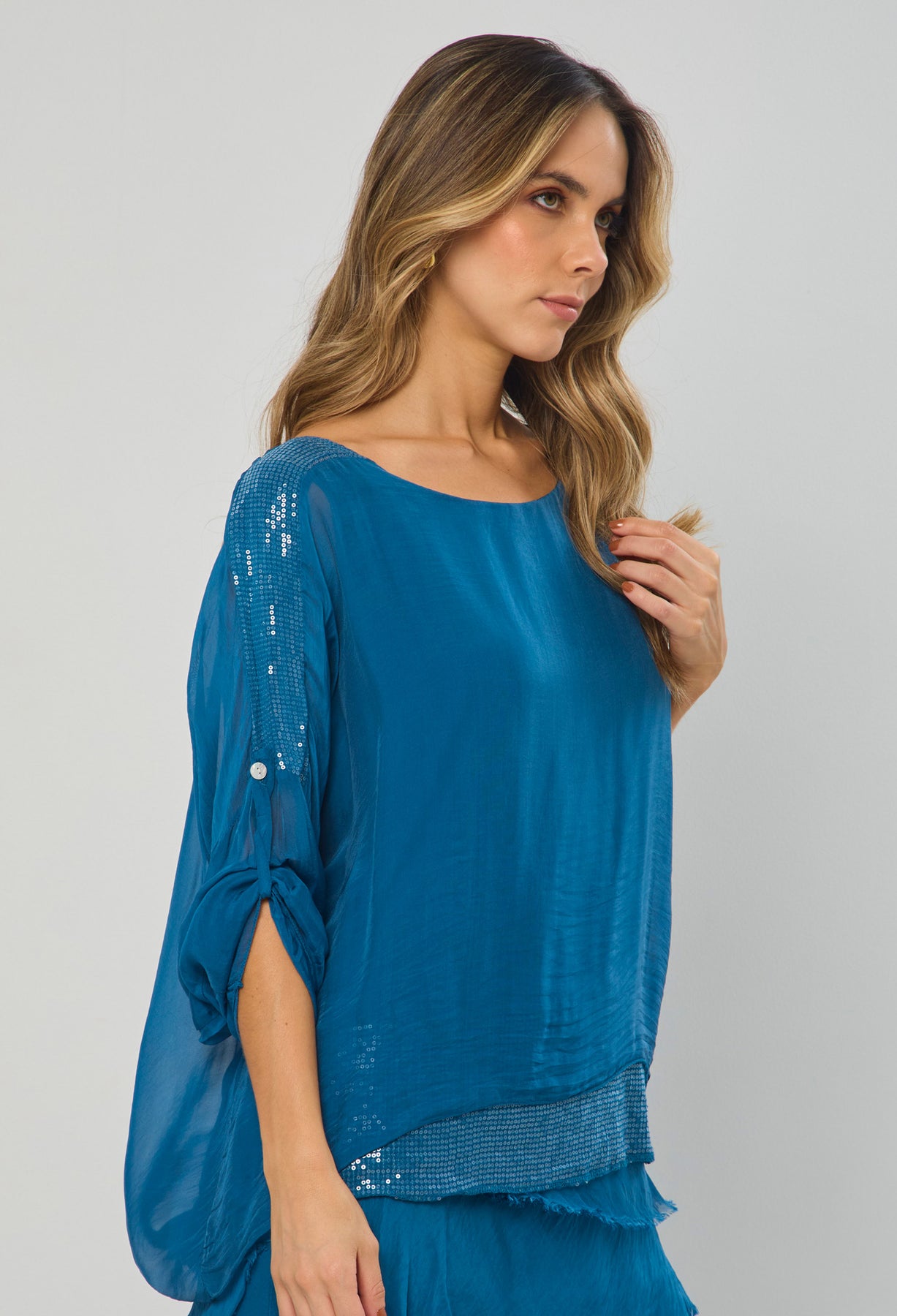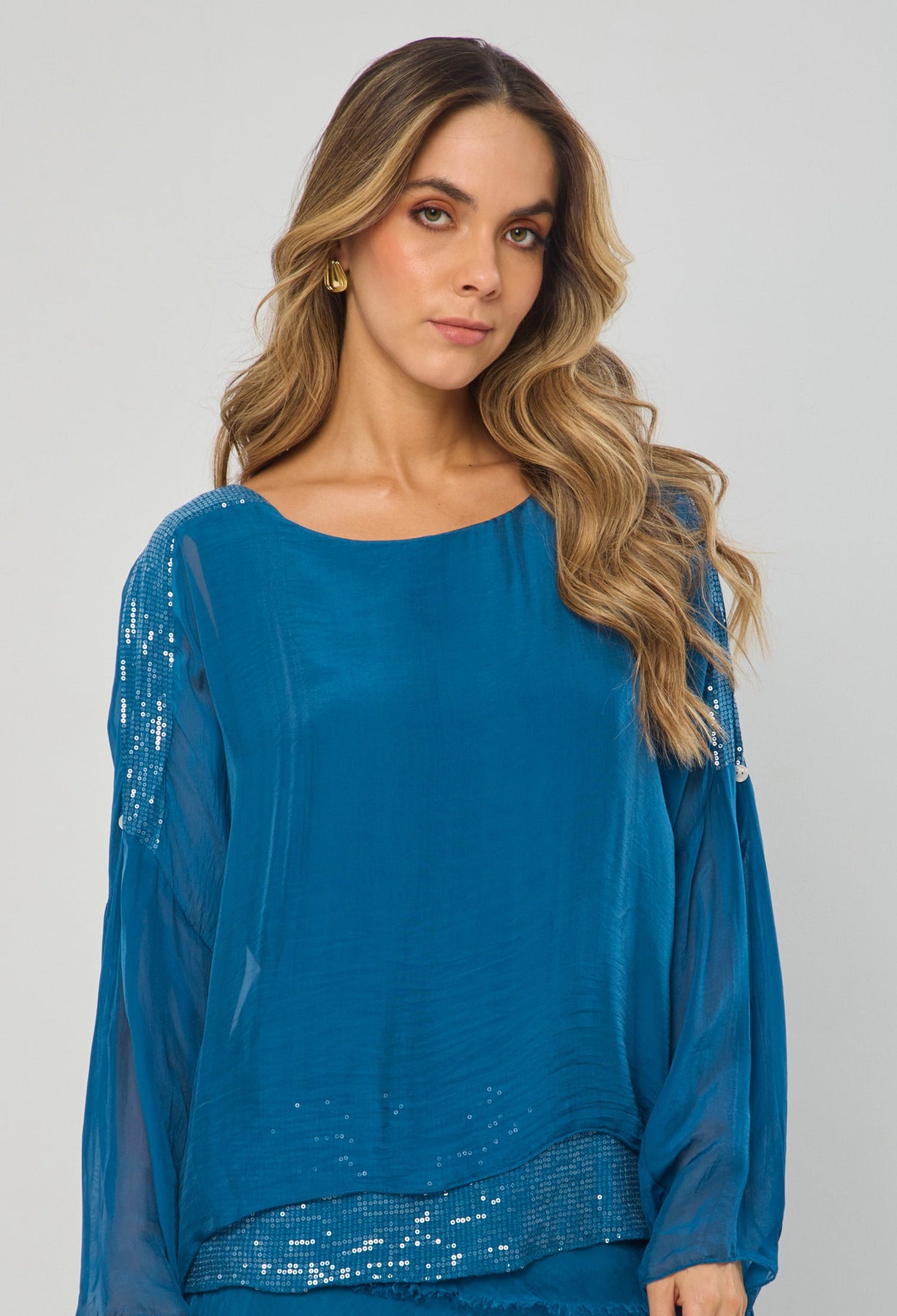 Blusa de seda, manga larga con puño enresortado, detalle de lentejuelas en top parte inferior. Silueta amplia, corte asimétrico. La modelo mide 1.70 m y lleva puesta la talla ÚNICA.