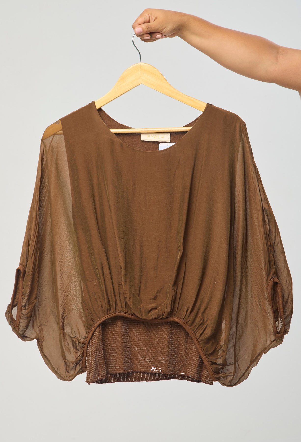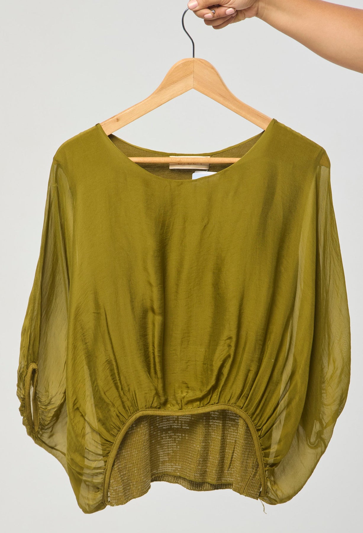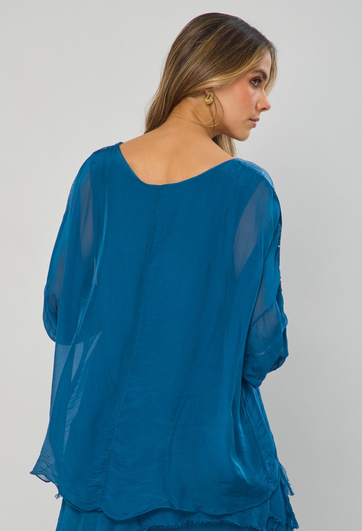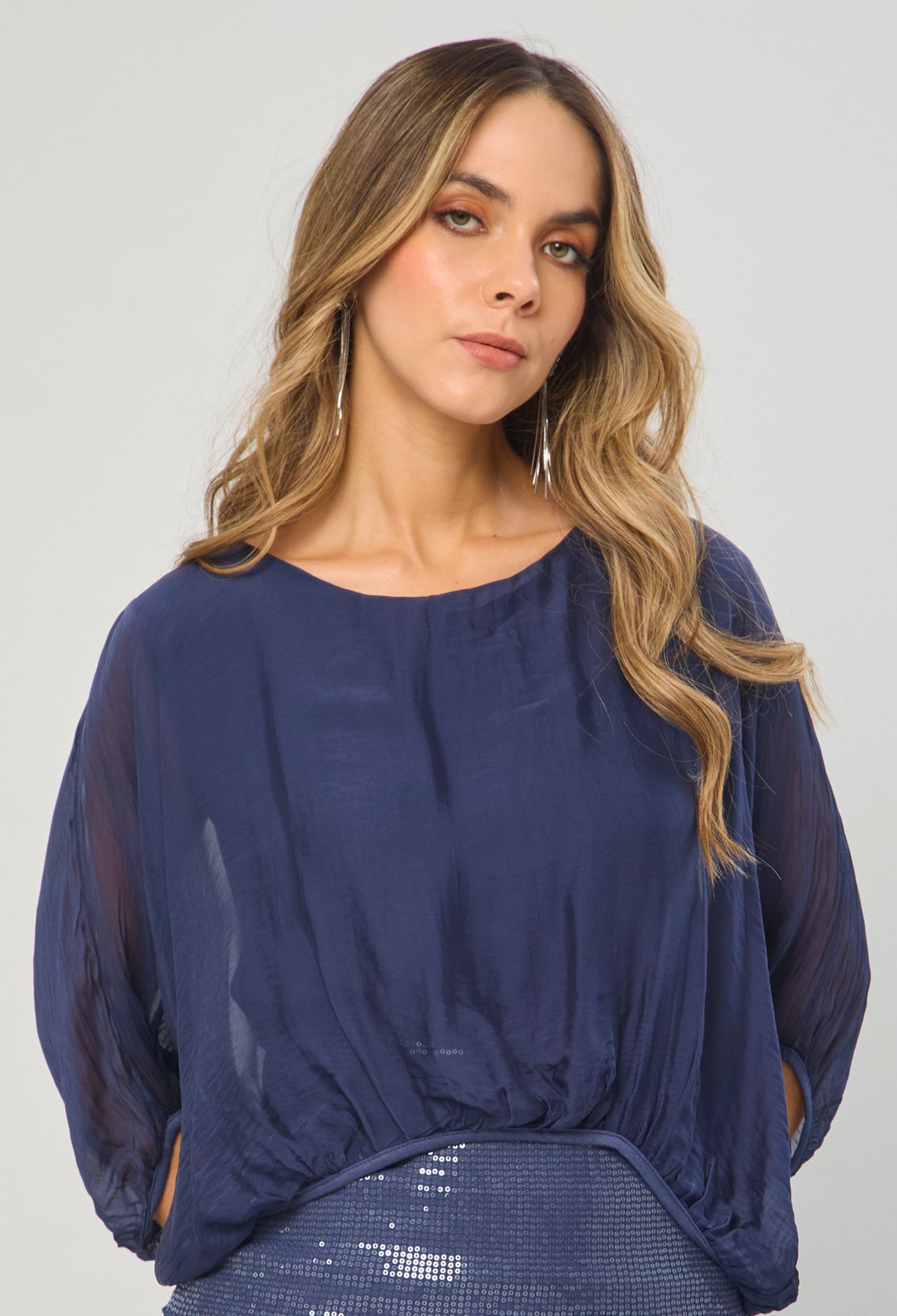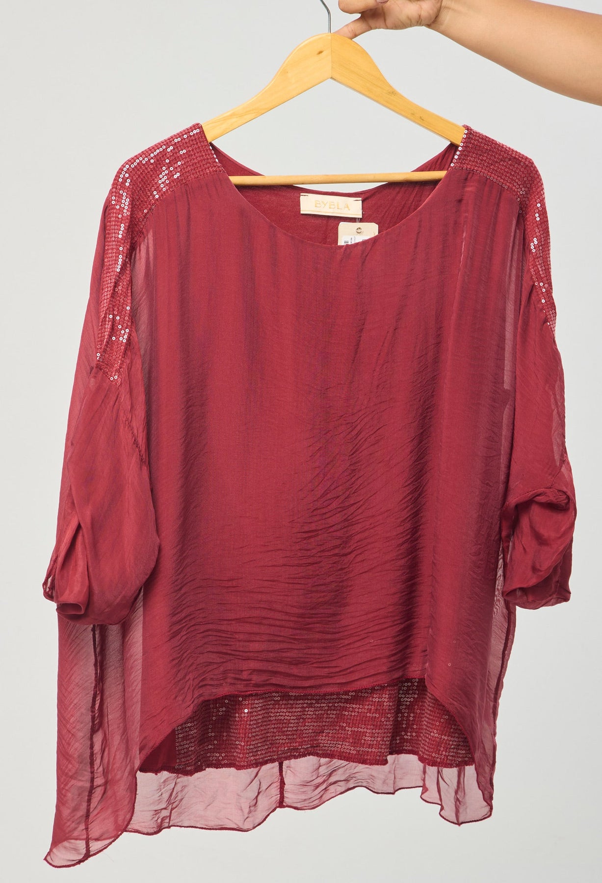Blusa de seda, manga larga con puño enresortado, detalle de lentejuelas en top parte inferior. Silueta amplia, corte asimétrico. La modelo mide 1.70 m y lleva puesta la talla ÚNICA.