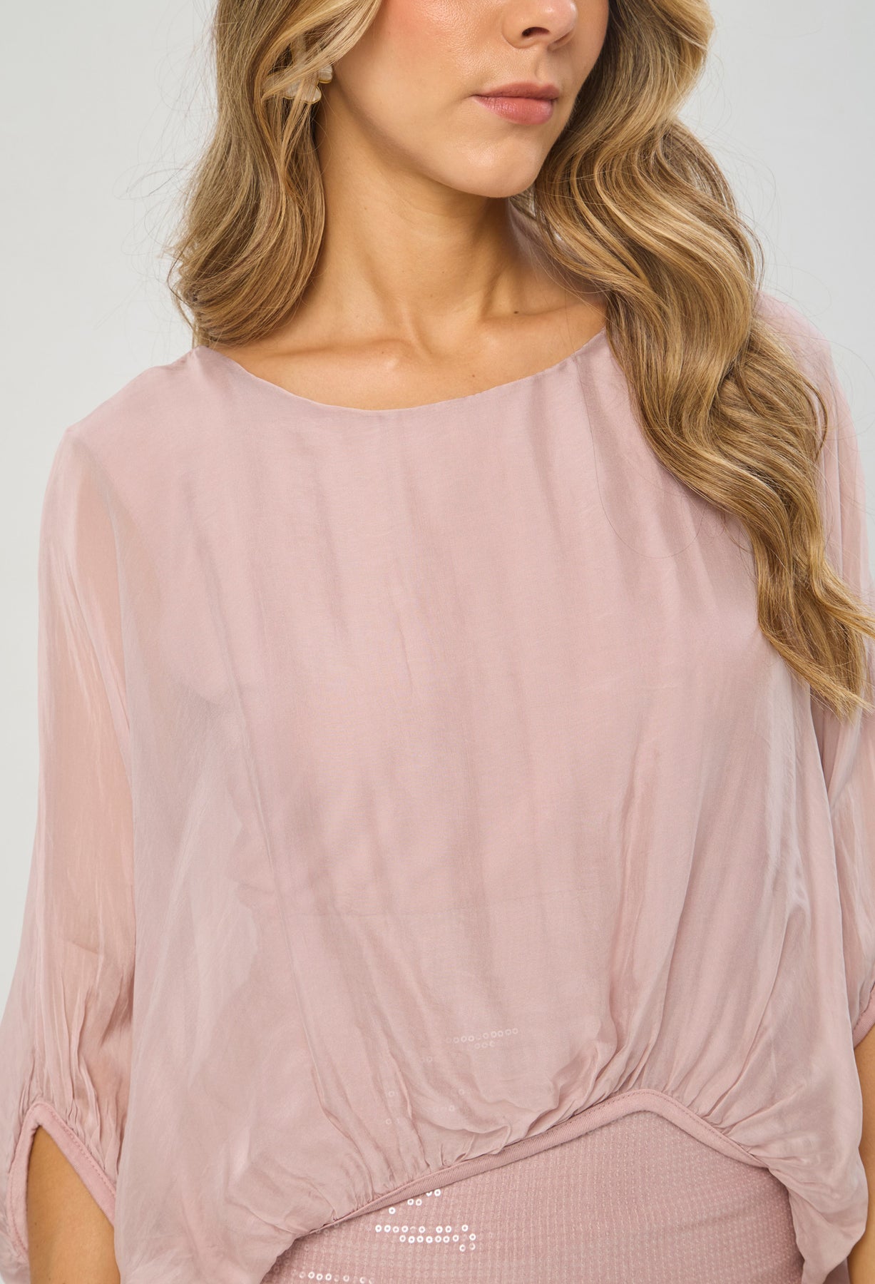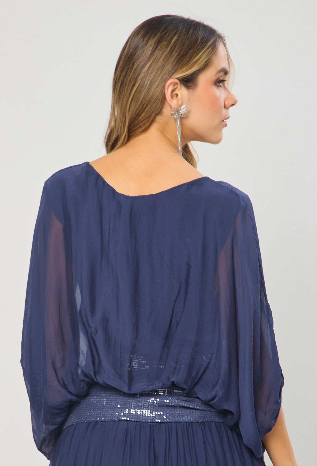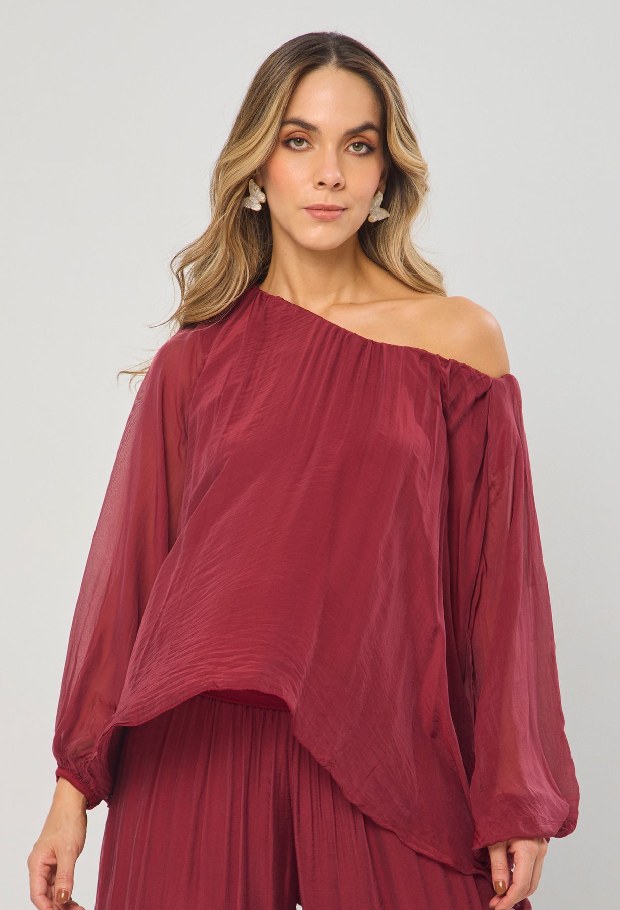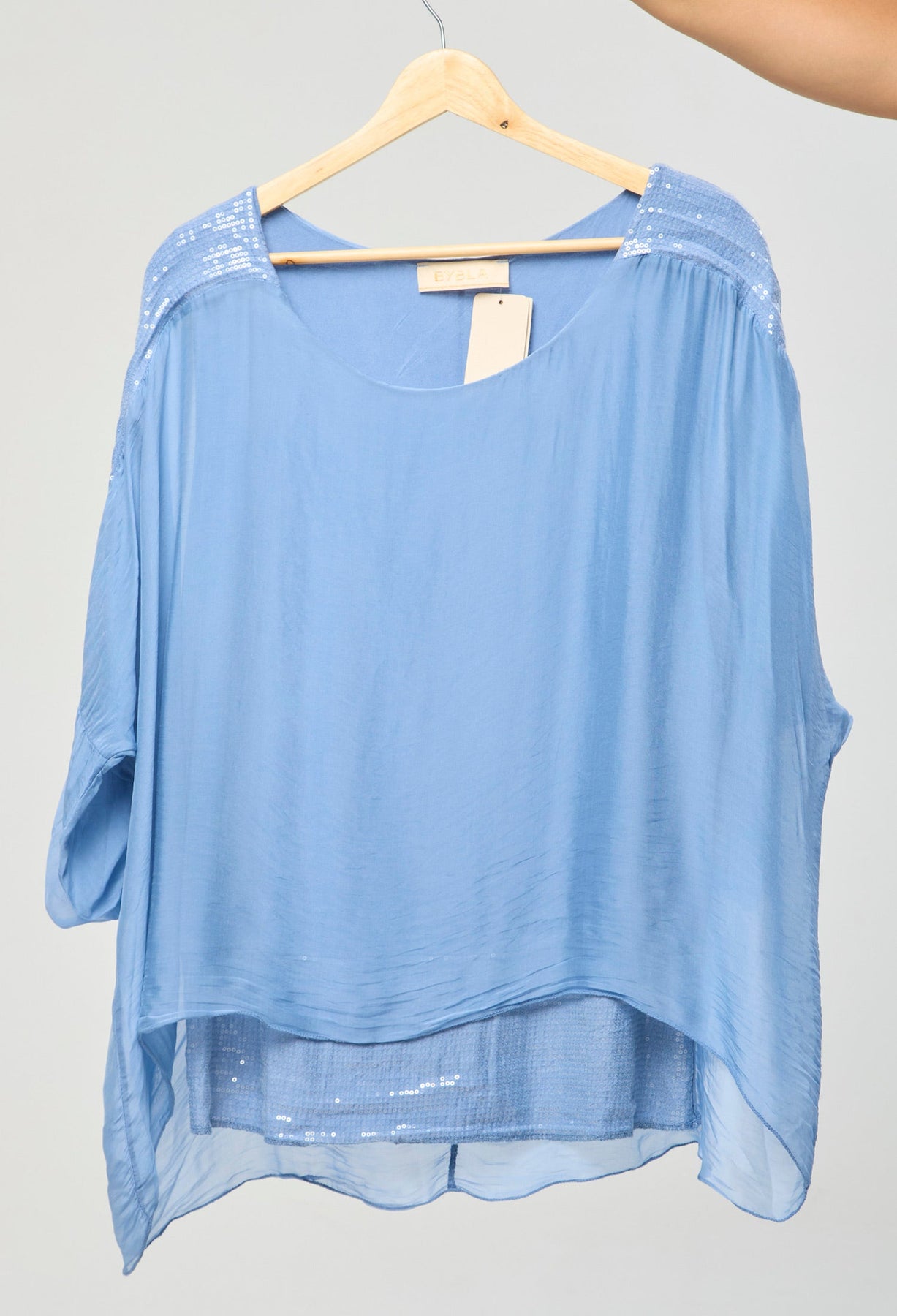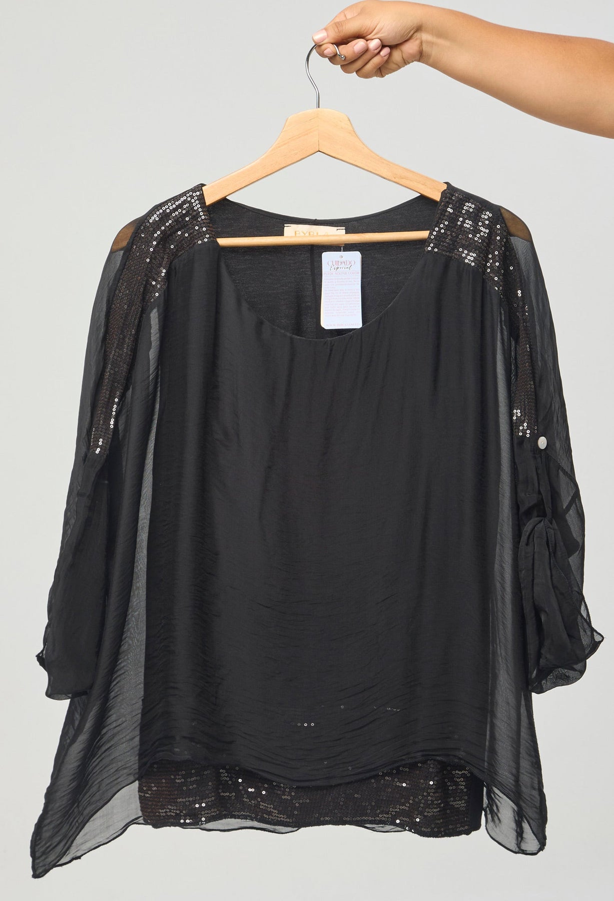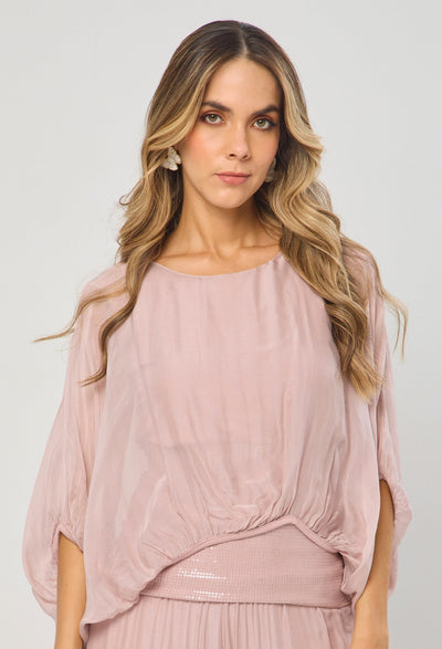 Blusa de seda, manga larga con puño enresortado, detalle de lentejuelas en top parte inferior. Silueta amplia, corte asimétrico. La modelo mide 1.70 m y lleva puesta la talla ÚNICA.