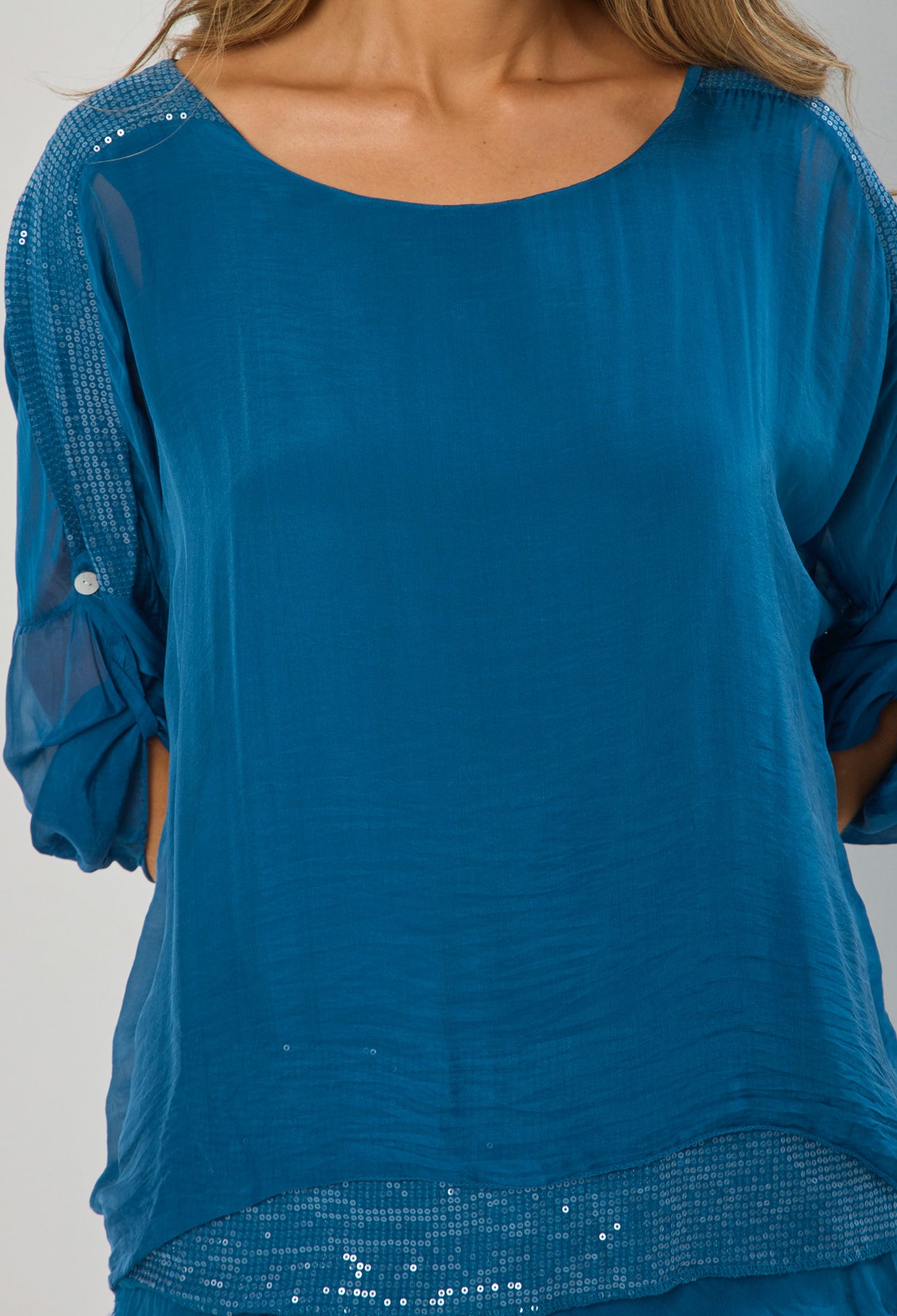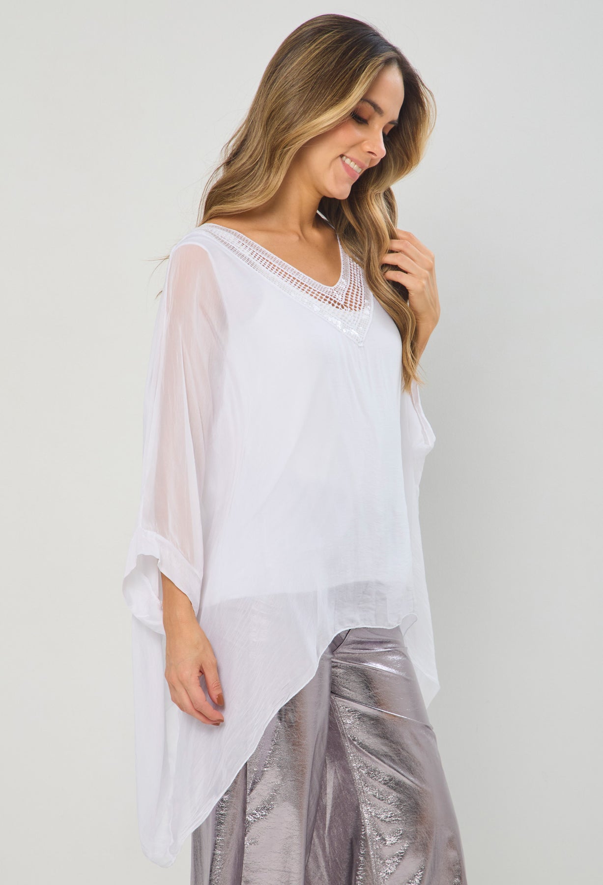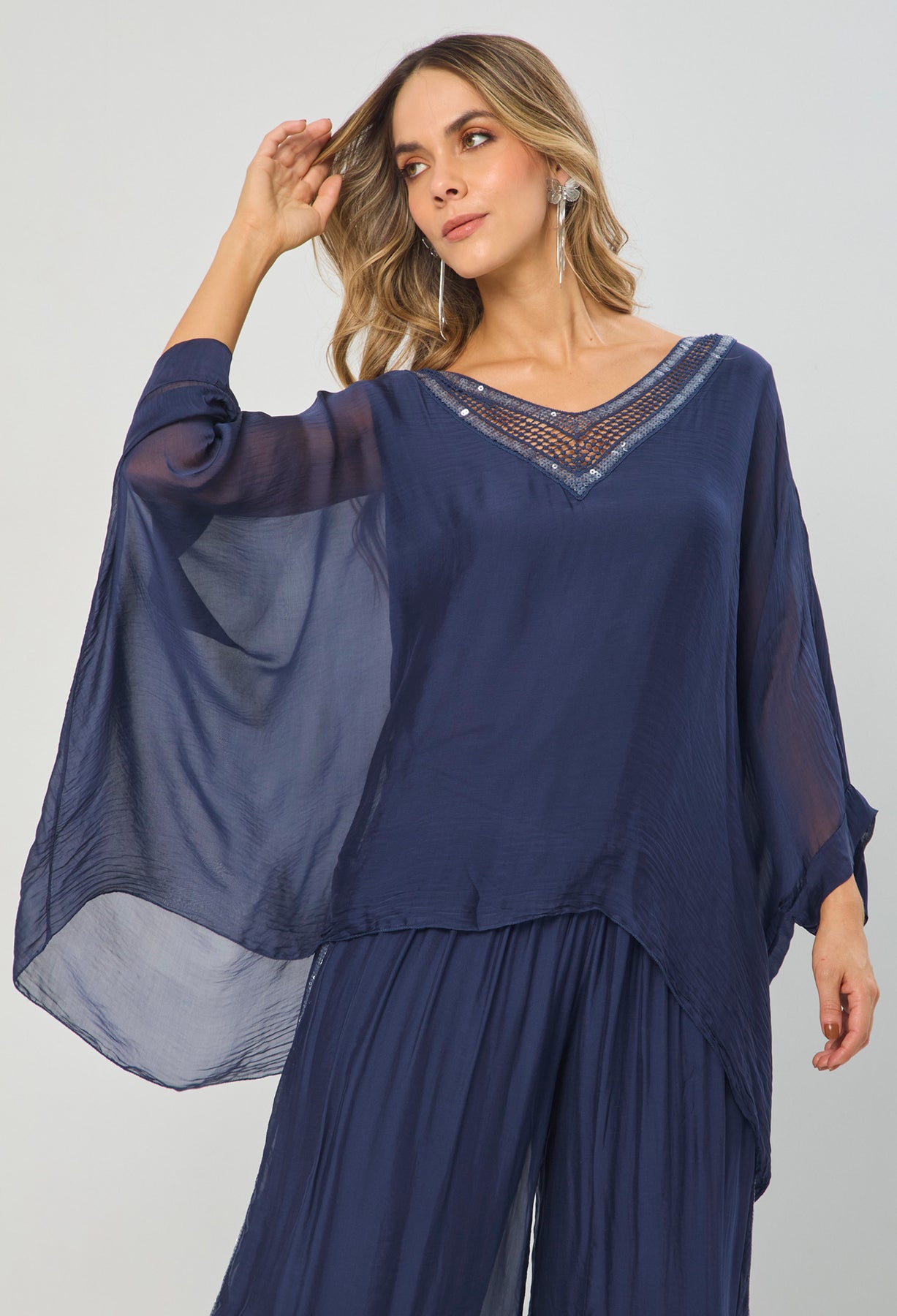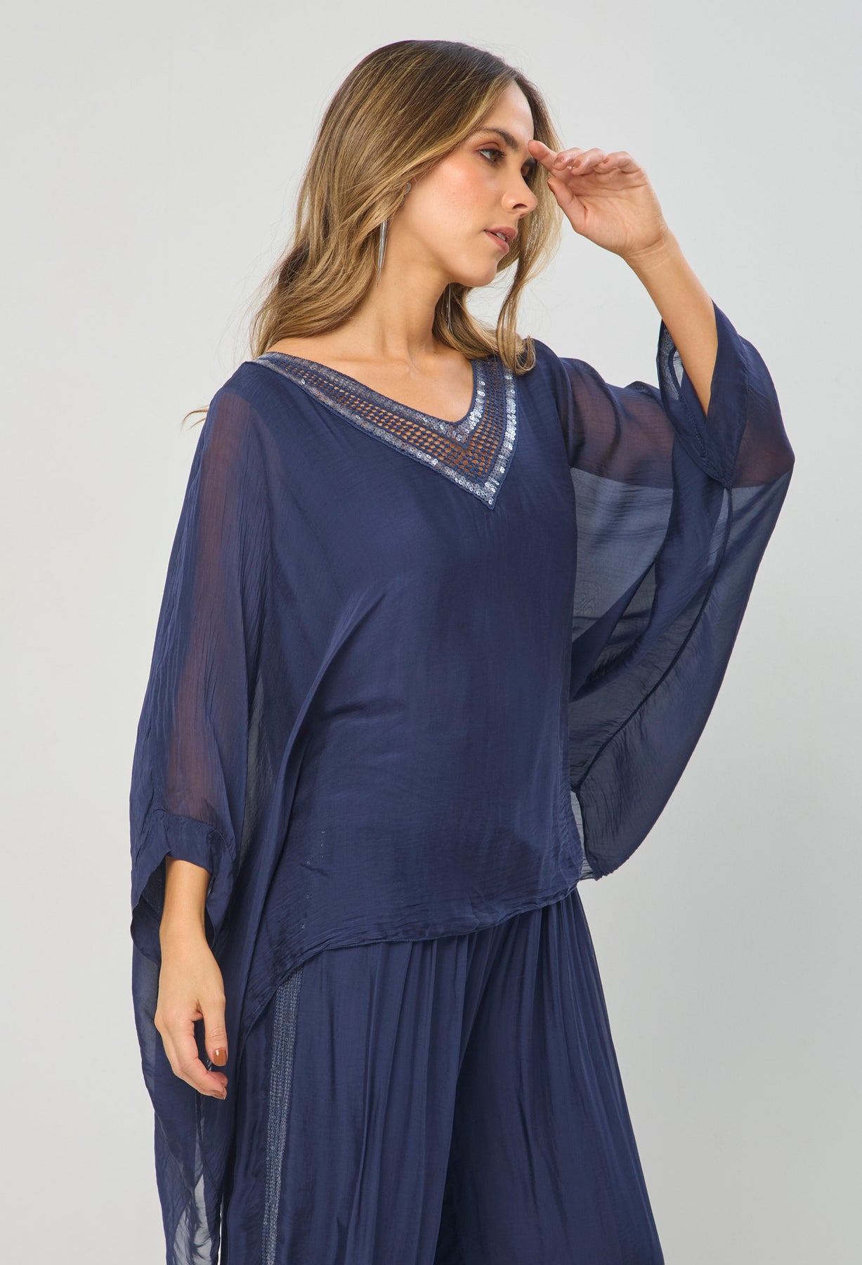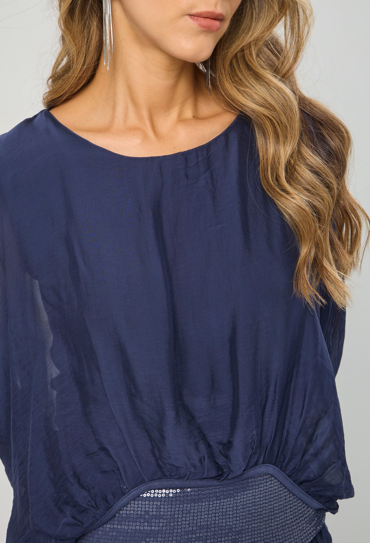 Blusa de seda, manga larga con puño enresortado, detalle de lentejuelas en top parte inferior. Silueta amplia, corte asimétrico. La modelo mide 1.70 m y lleva puesta la talla ÚNICA.