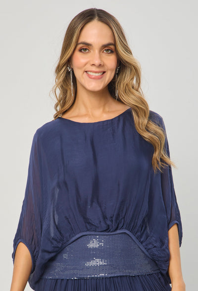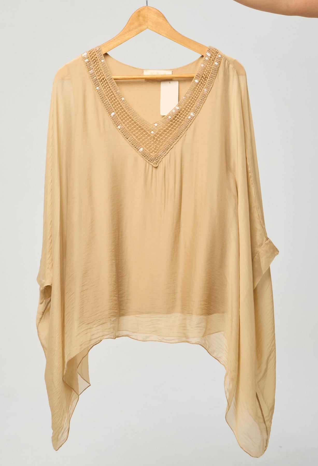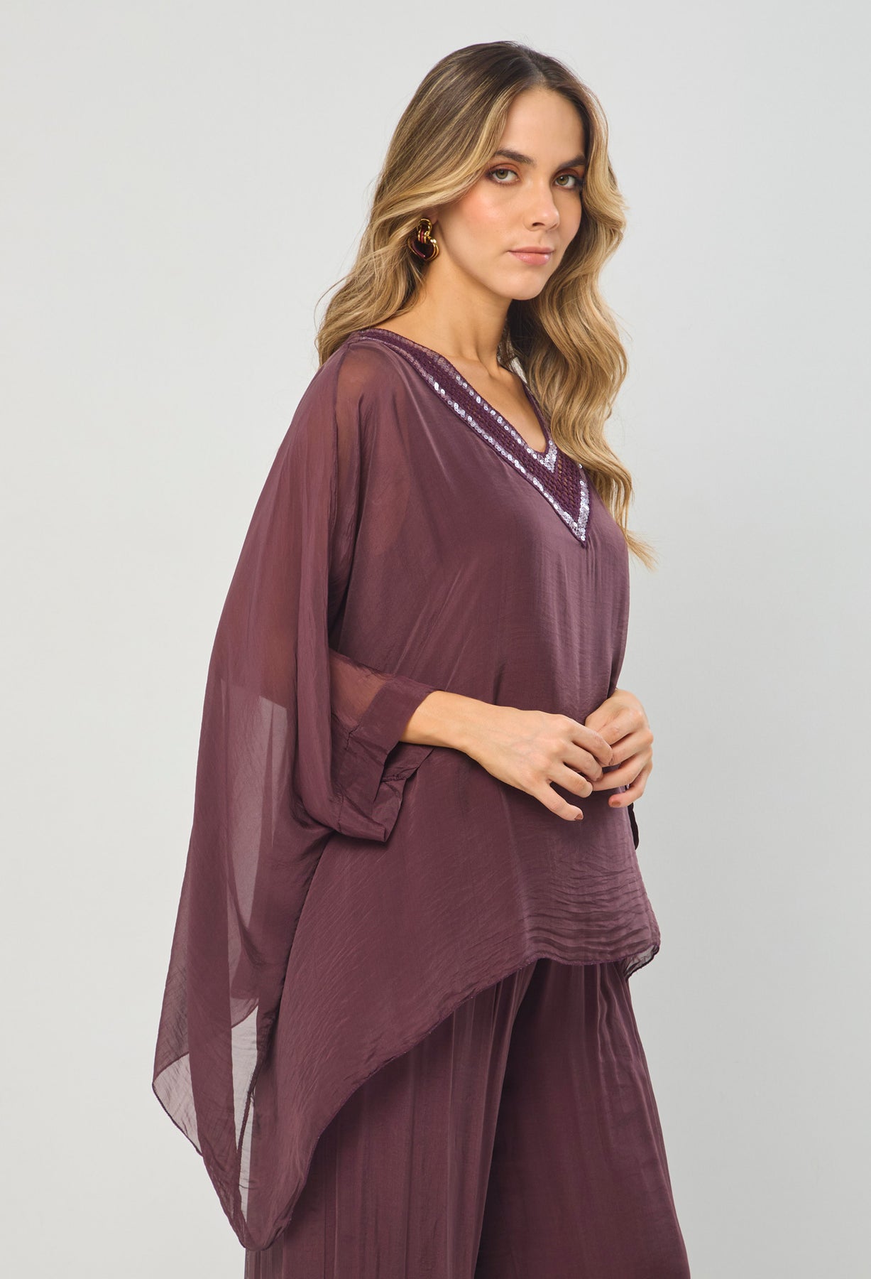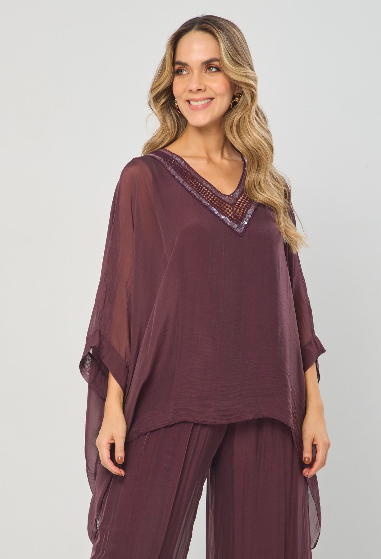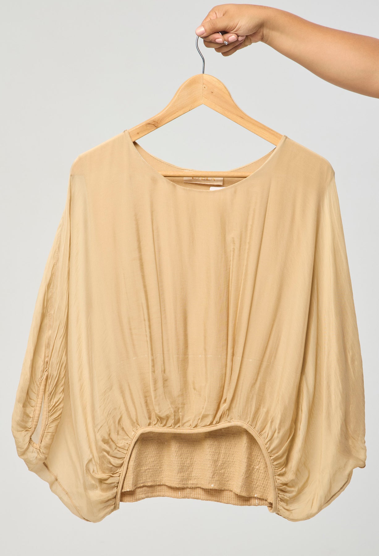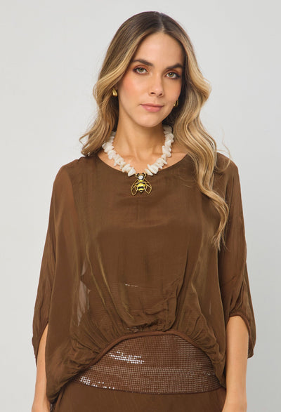 Blusa de seda, manga larga con puño enresortado, detalle de lentejuelas en top parte inferior. Silueta amplia, corte asimétrico. La modelo mide 1.70 m y lleva puesta la talla ÚNICA.