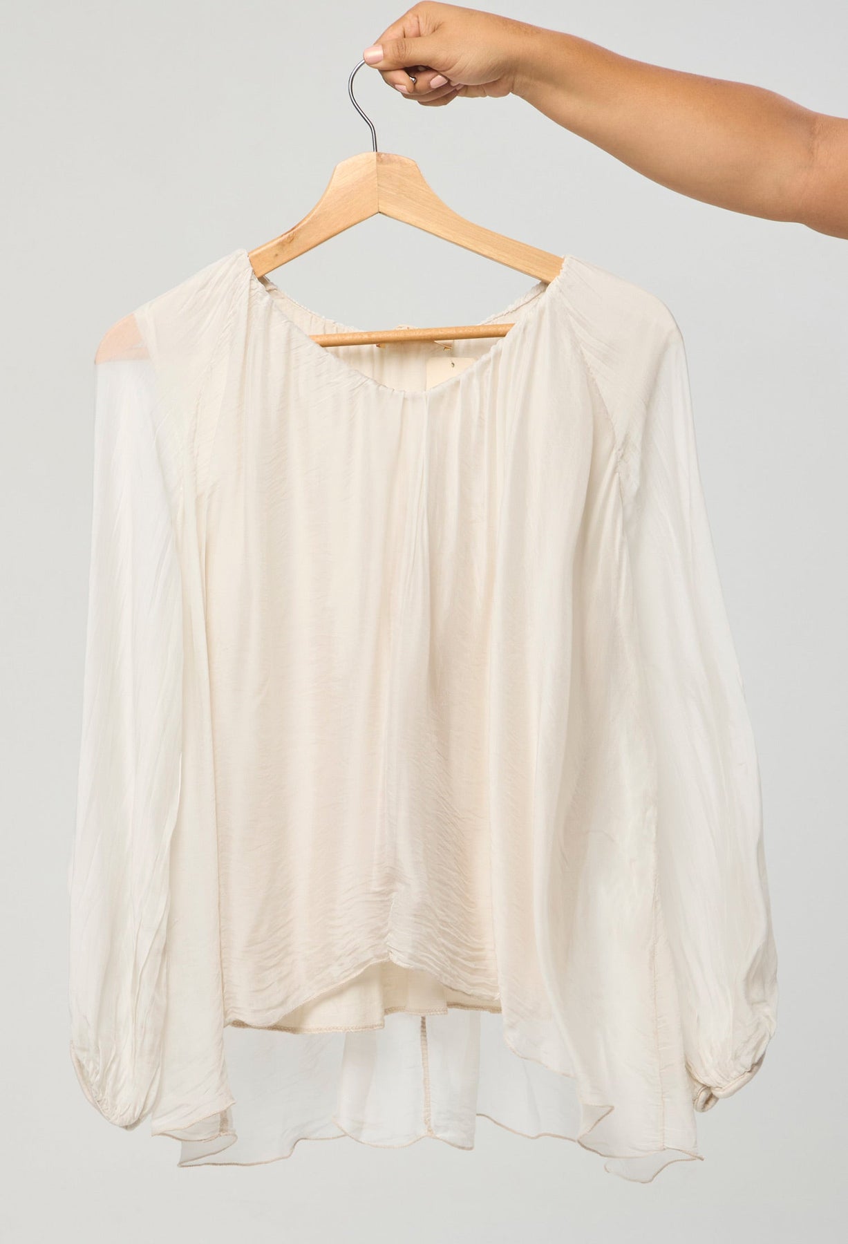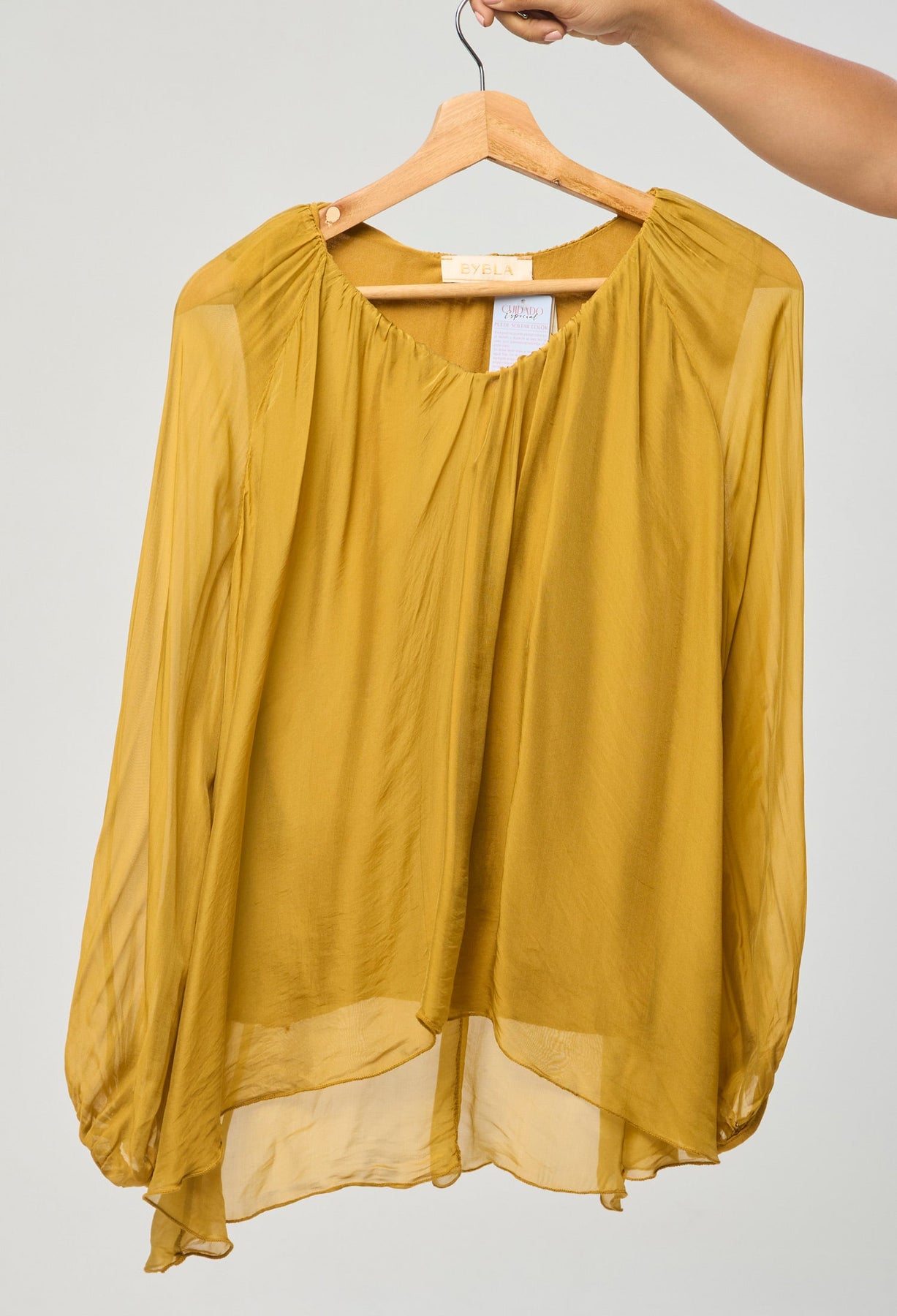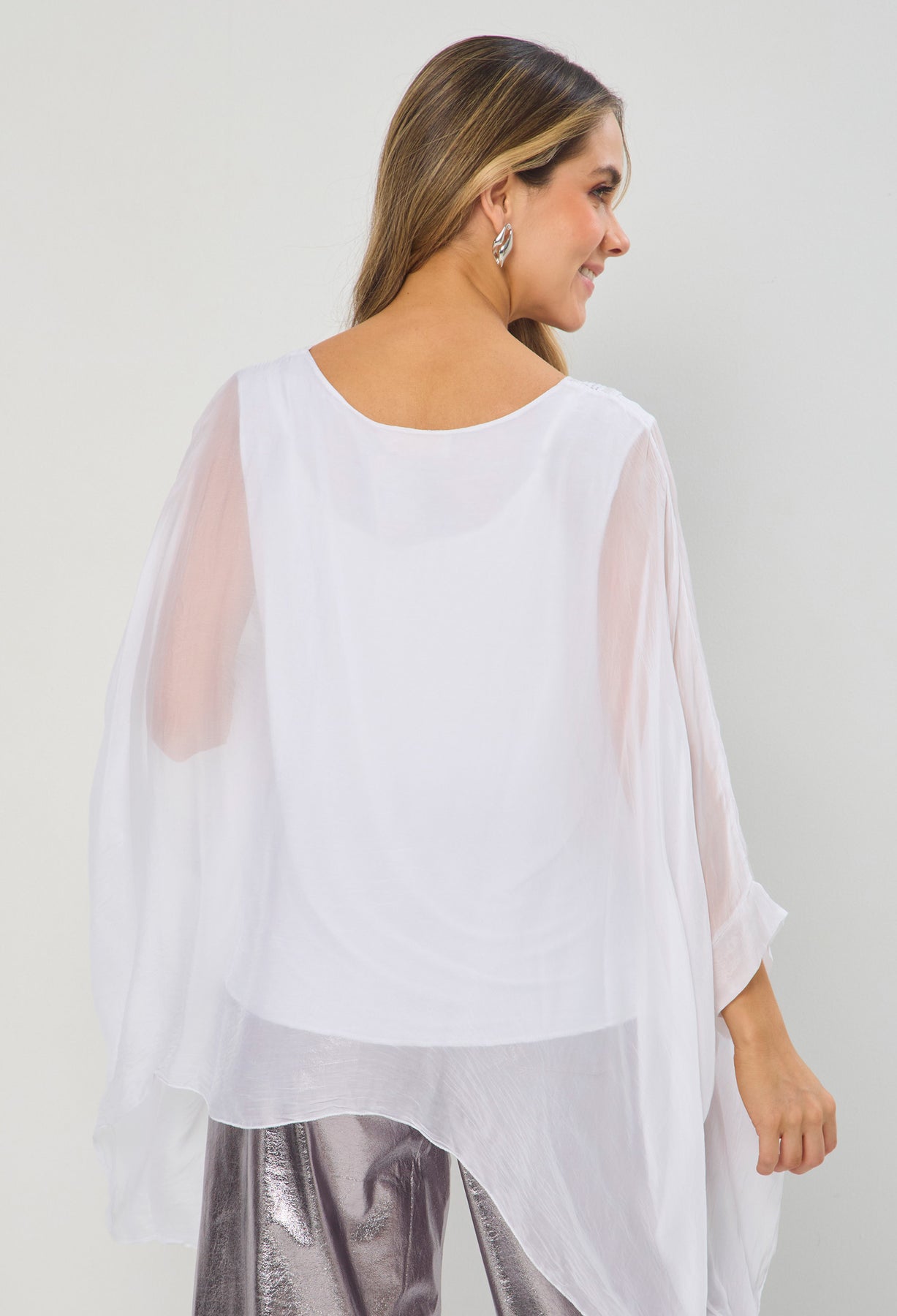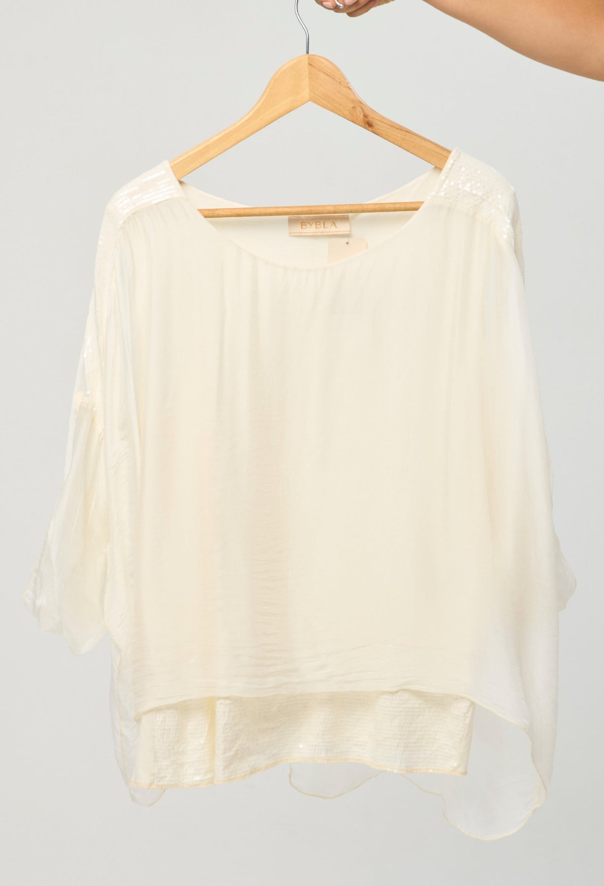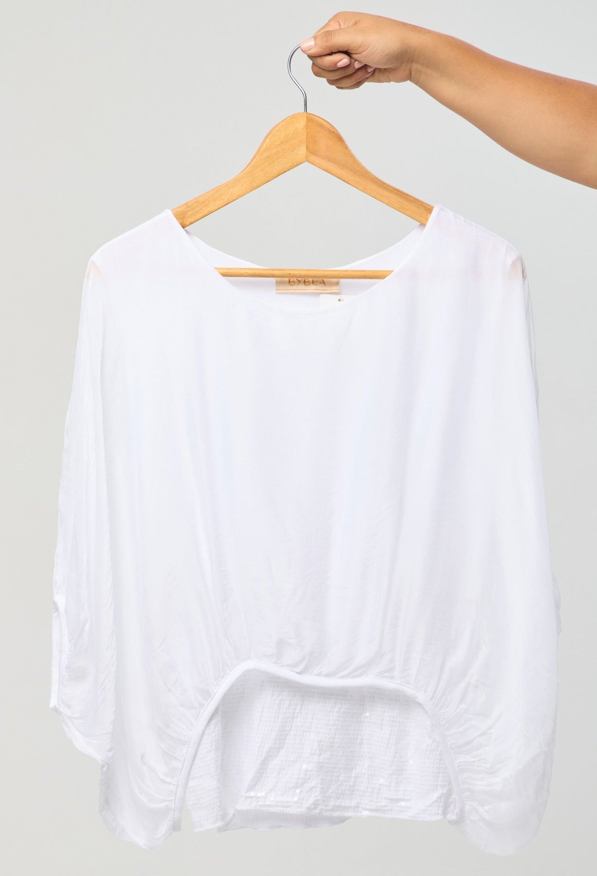 Blusa de seda, manga larga con puño enresortado, detalle de lentejuelas en top parte inferior. Silueta amplia, corte asimétrico. La modelo mide 1.70 m y lleva puesta la talla ÚNICA.