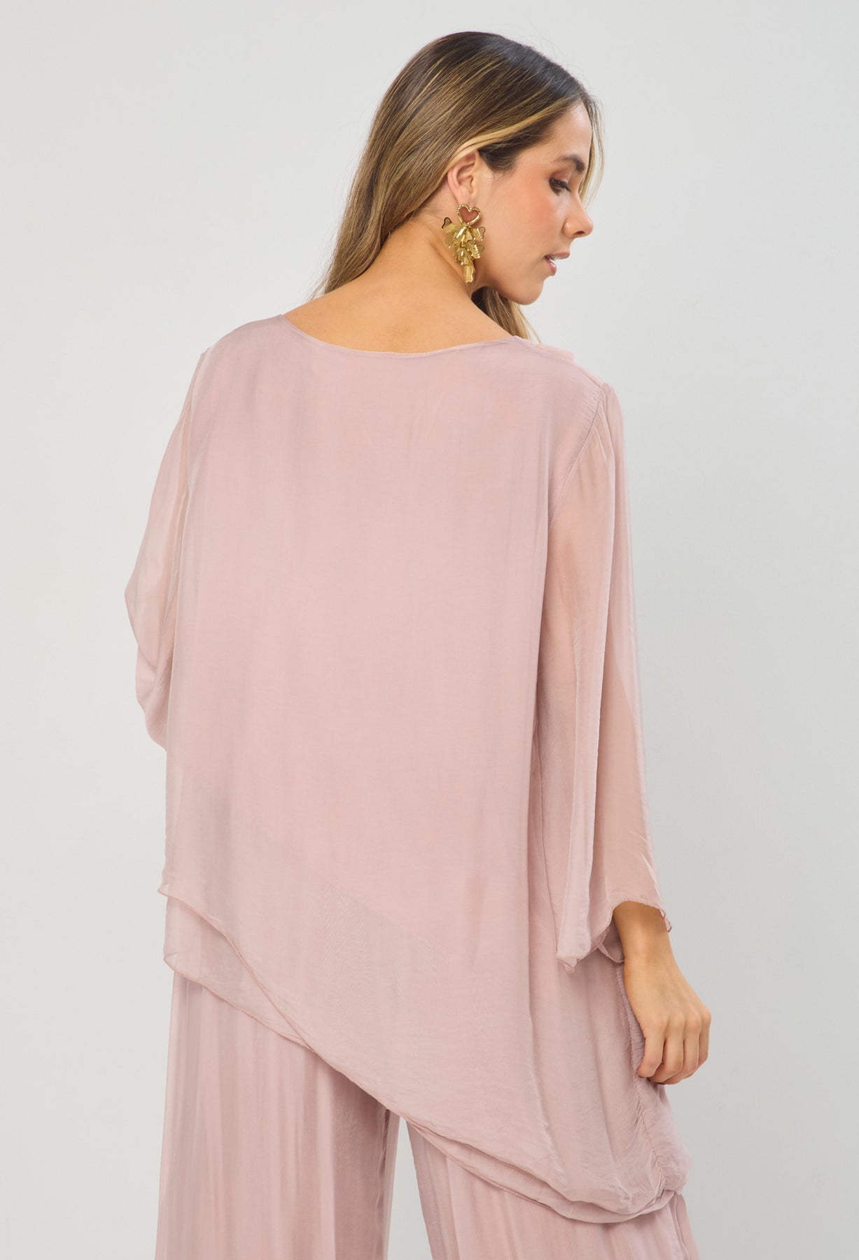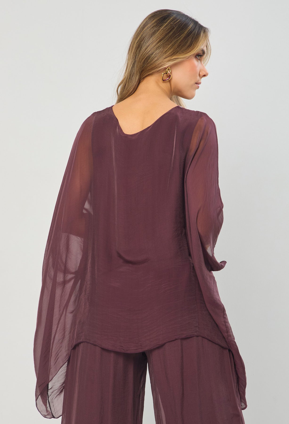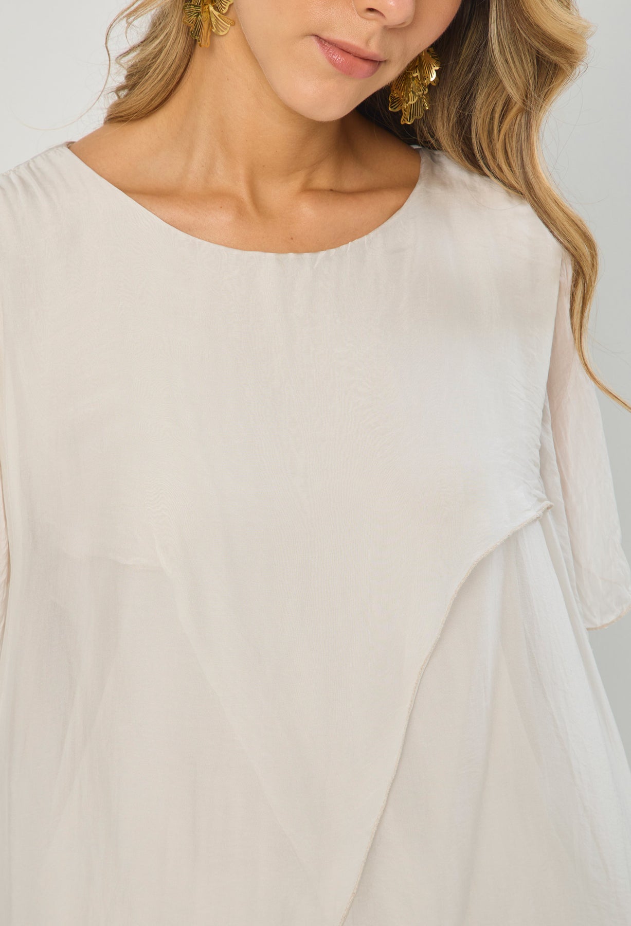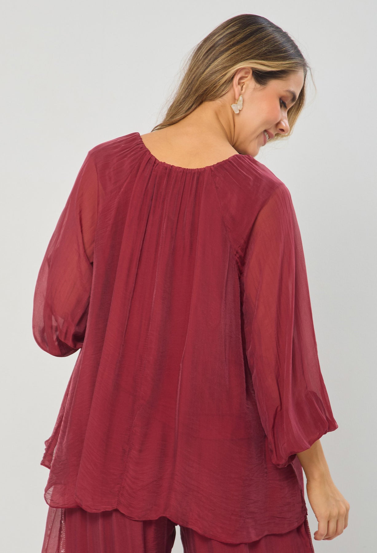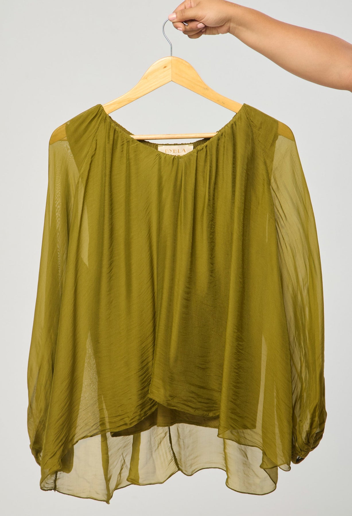 Blusa de seda, manga larga con puño enresortado, detalle de lentejuelas en top parte inferior. Silueta amplia, corte asimétrico. La modelo mide 1.70 m y lleva puesta la talla ÚNICA.