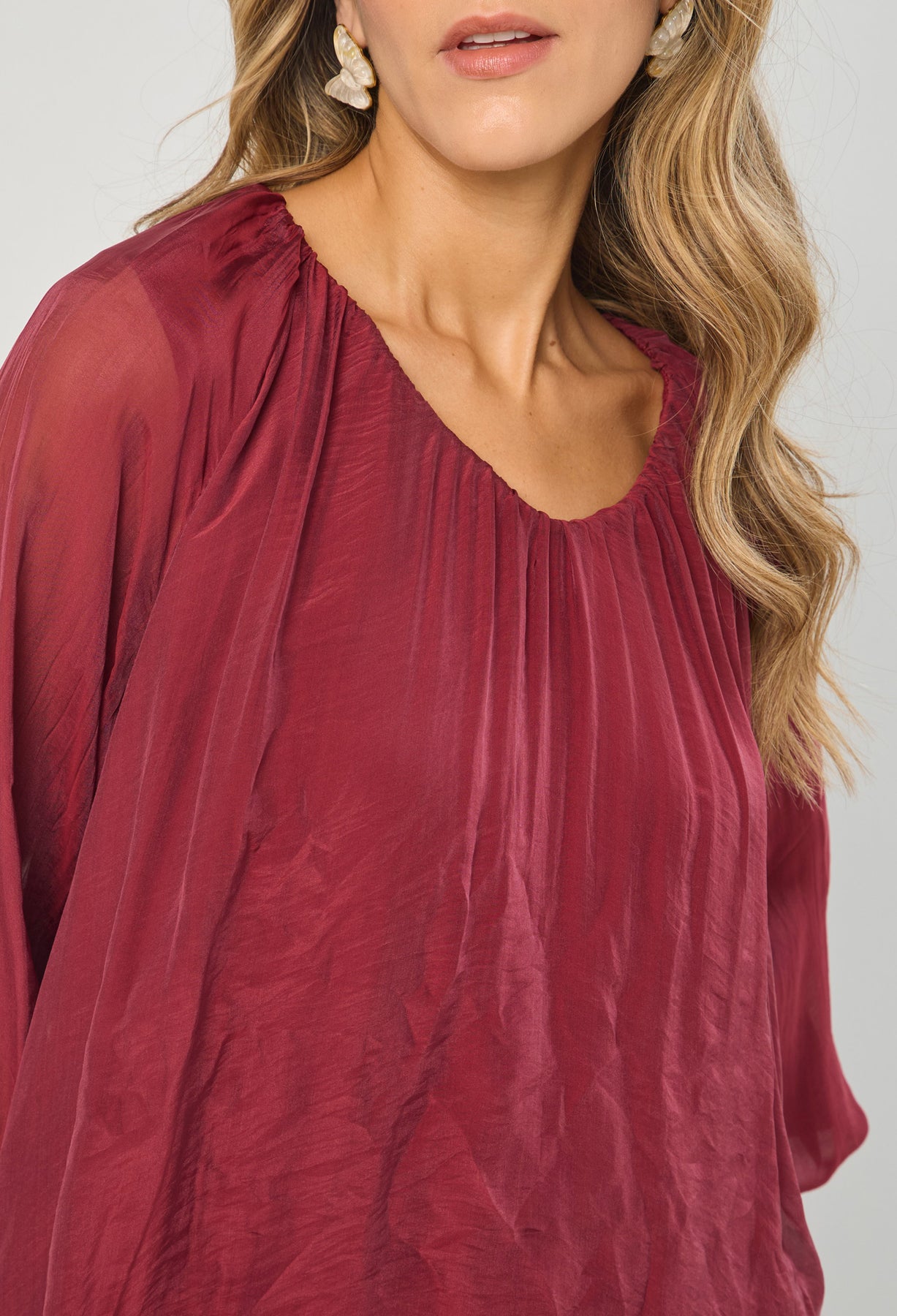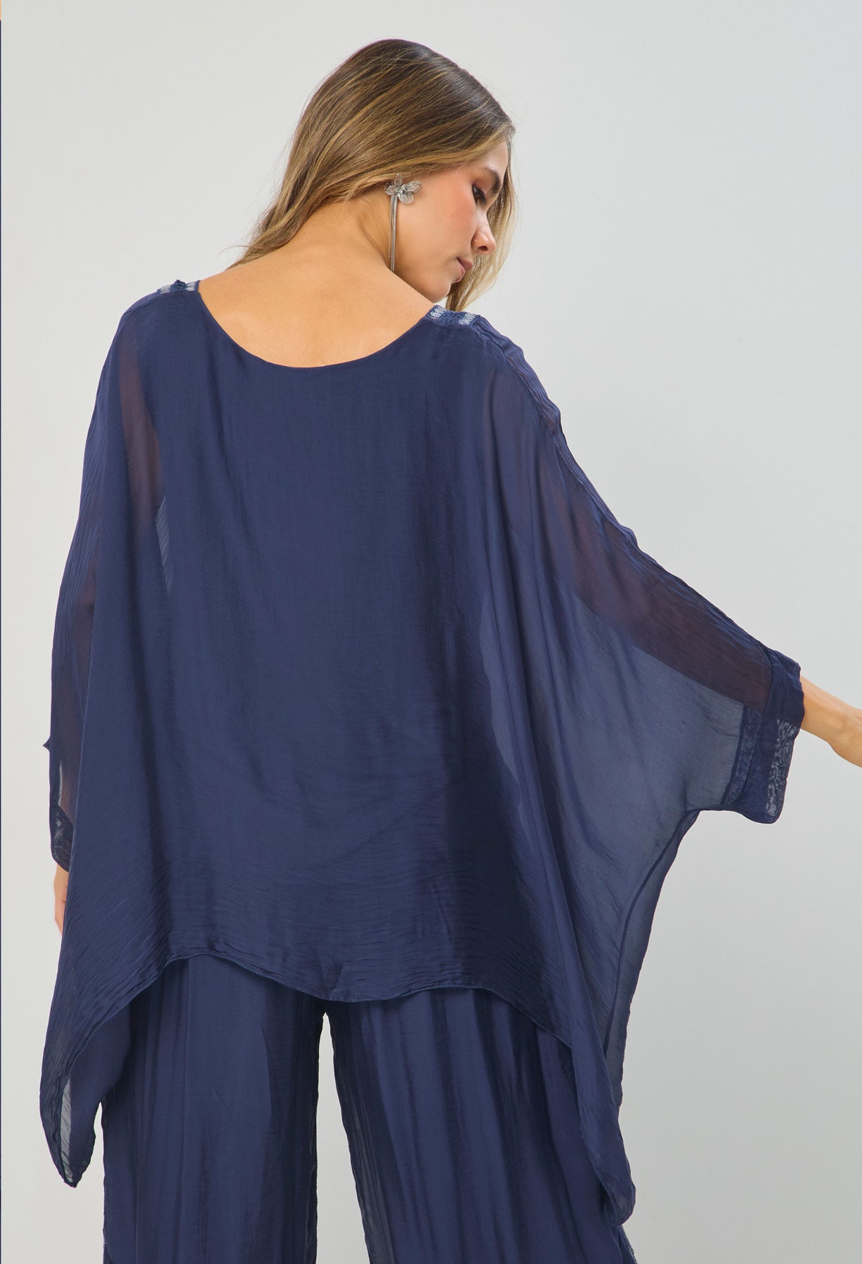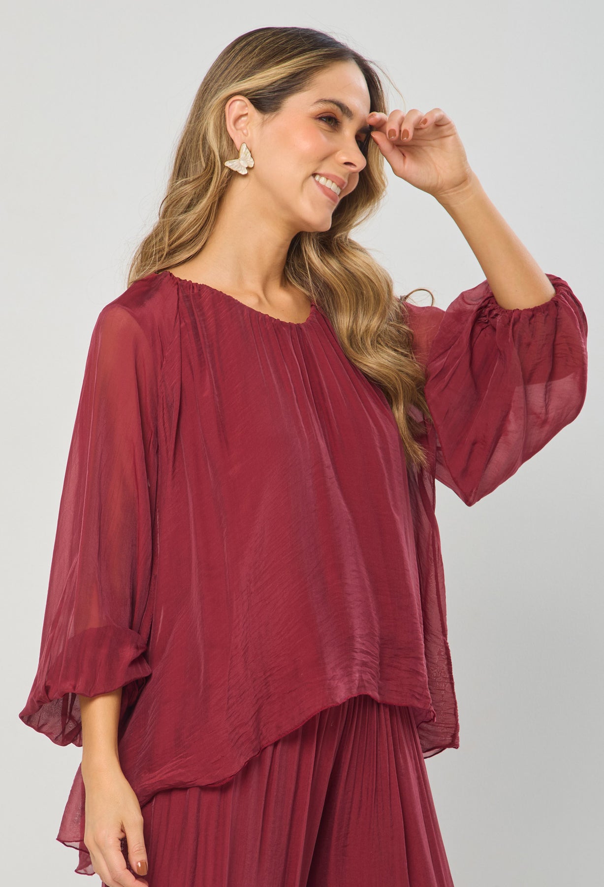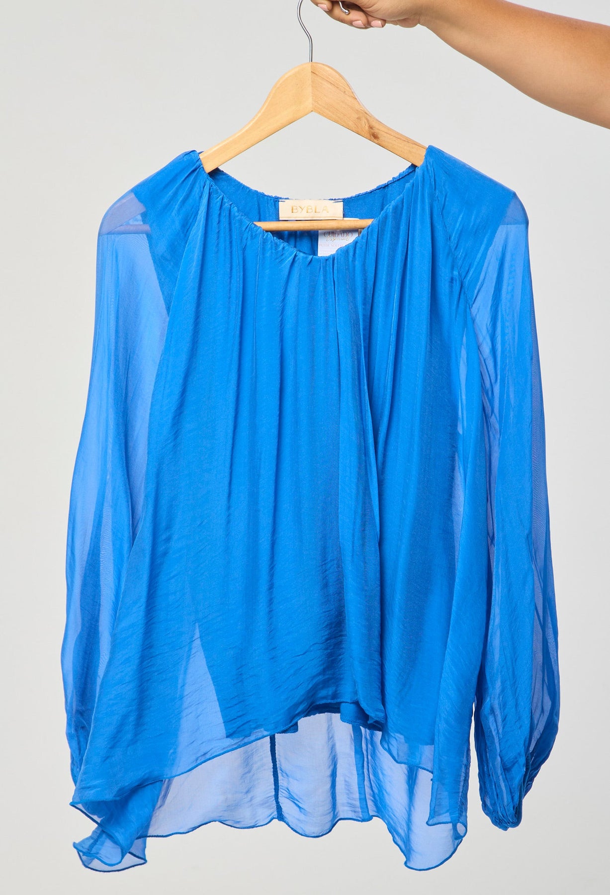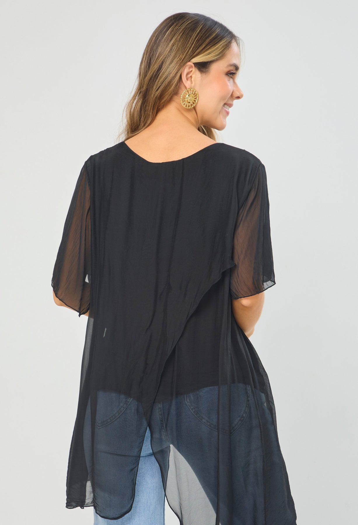 Blusa de seda, manga larga con puño enresortado, detalle de lentejuelas en top parte inferior. Silueta amplia, corte asimétrico. La modelo mide 1.70 m y lleva puesta la talla ÚNICA.