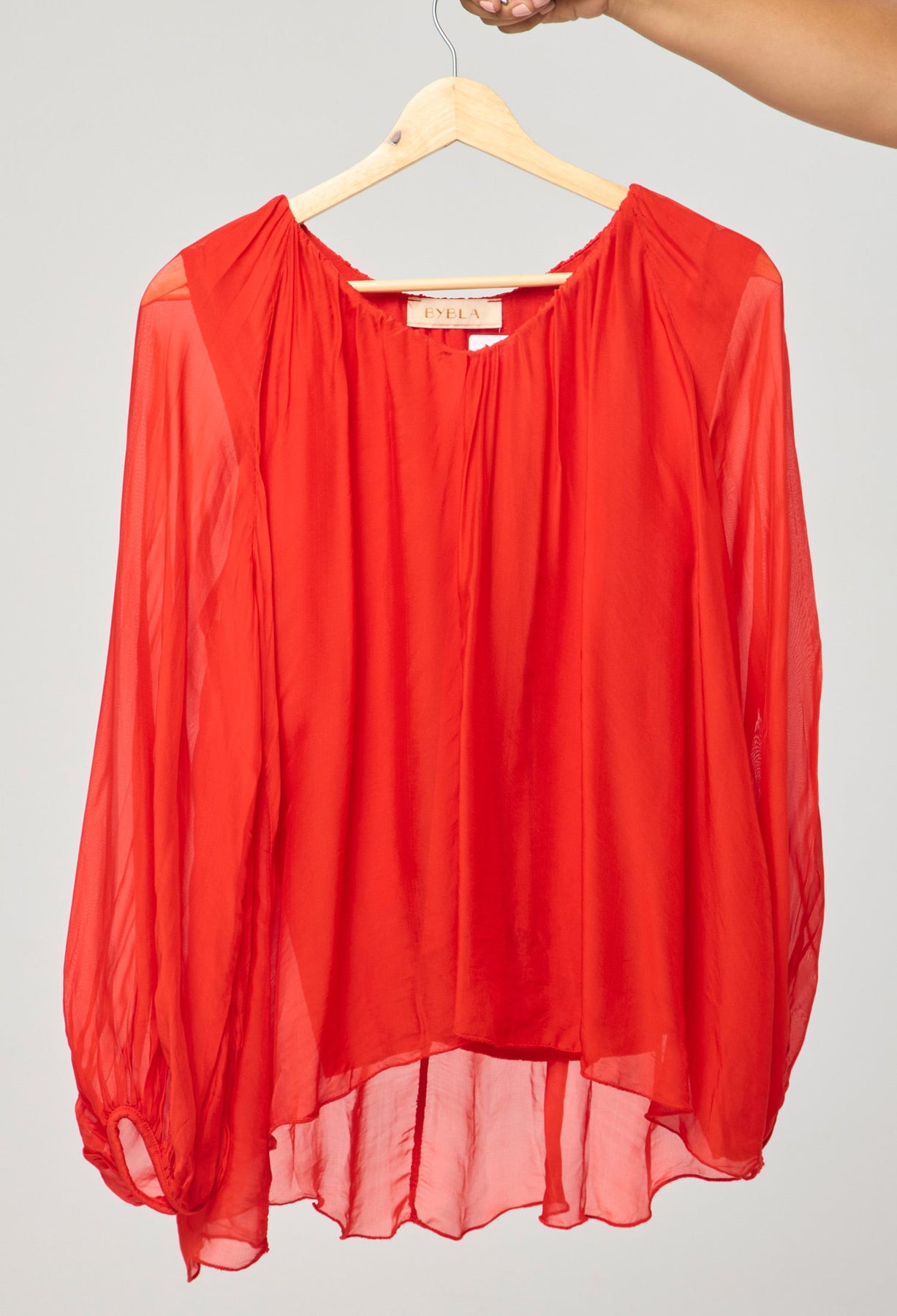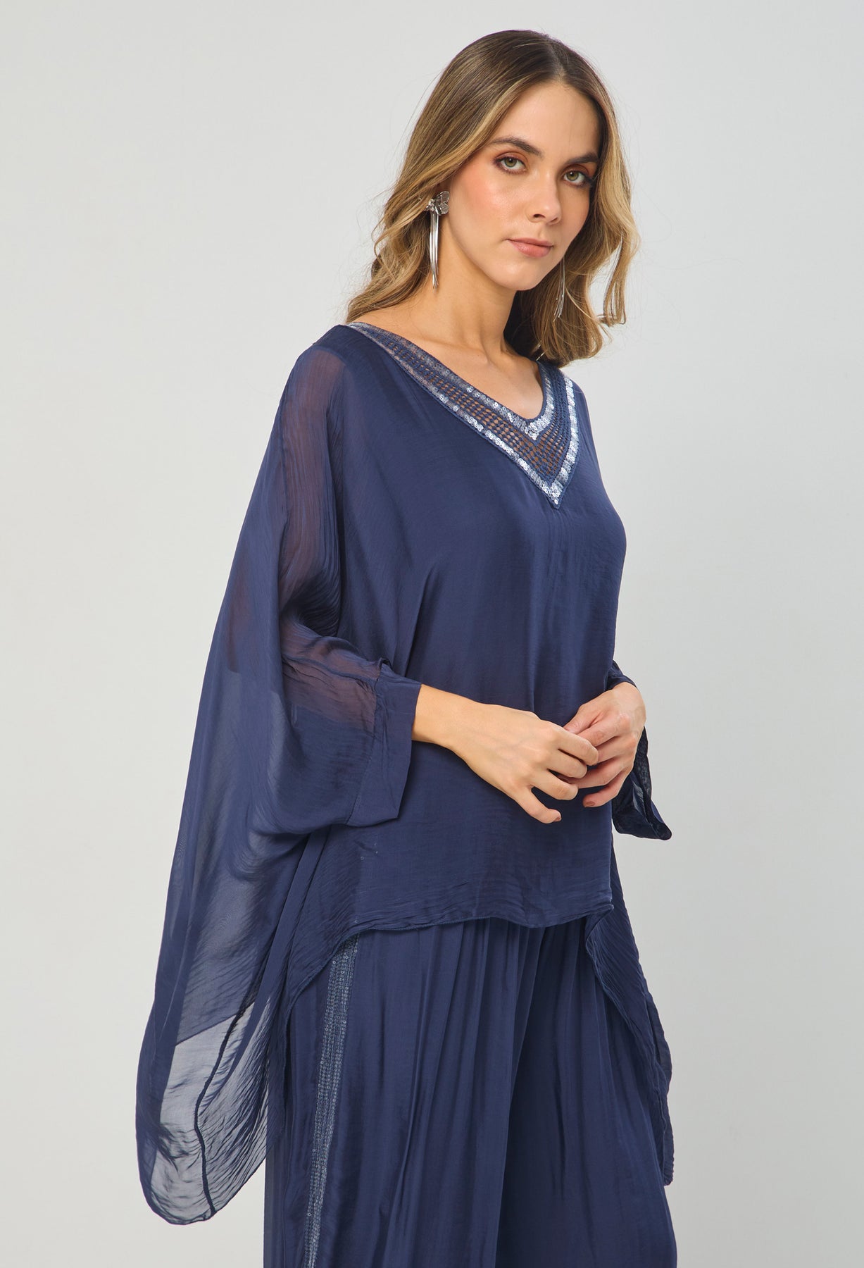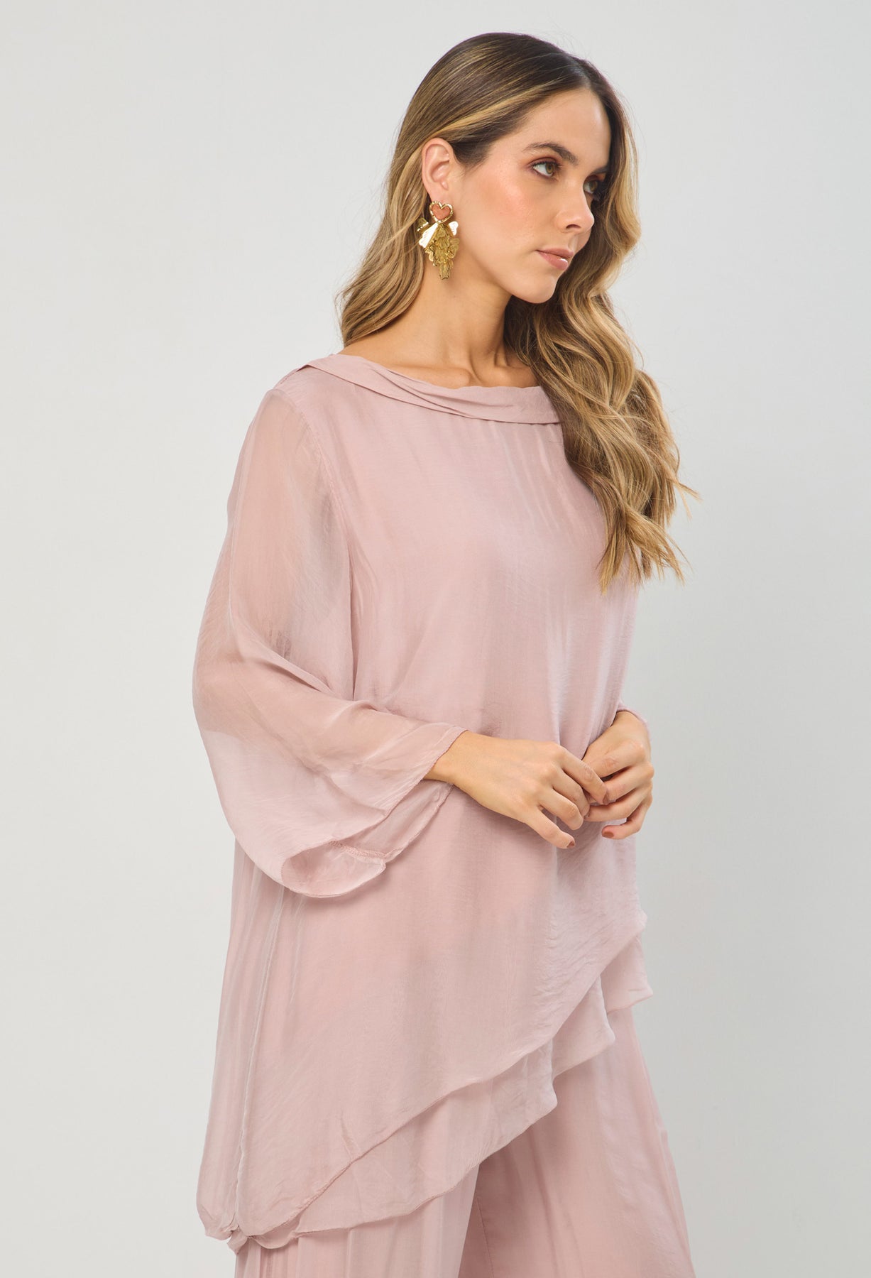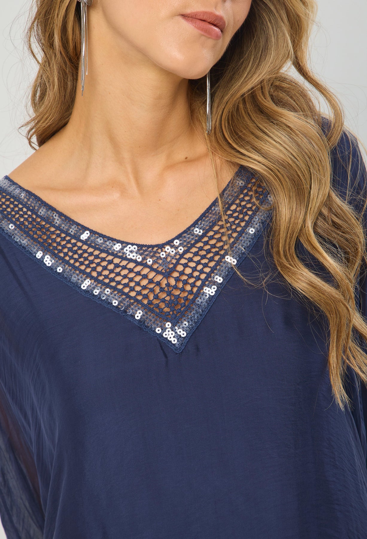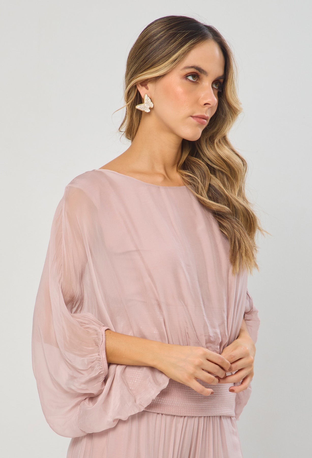 Blusa de seda, manga larga con puño enresortado, detalle de lentejuelas en top parte inferior. Silueta amplia, corte asimétrico. La modelo mide 1.70 m y lleva puesta la talla ÚNICA.