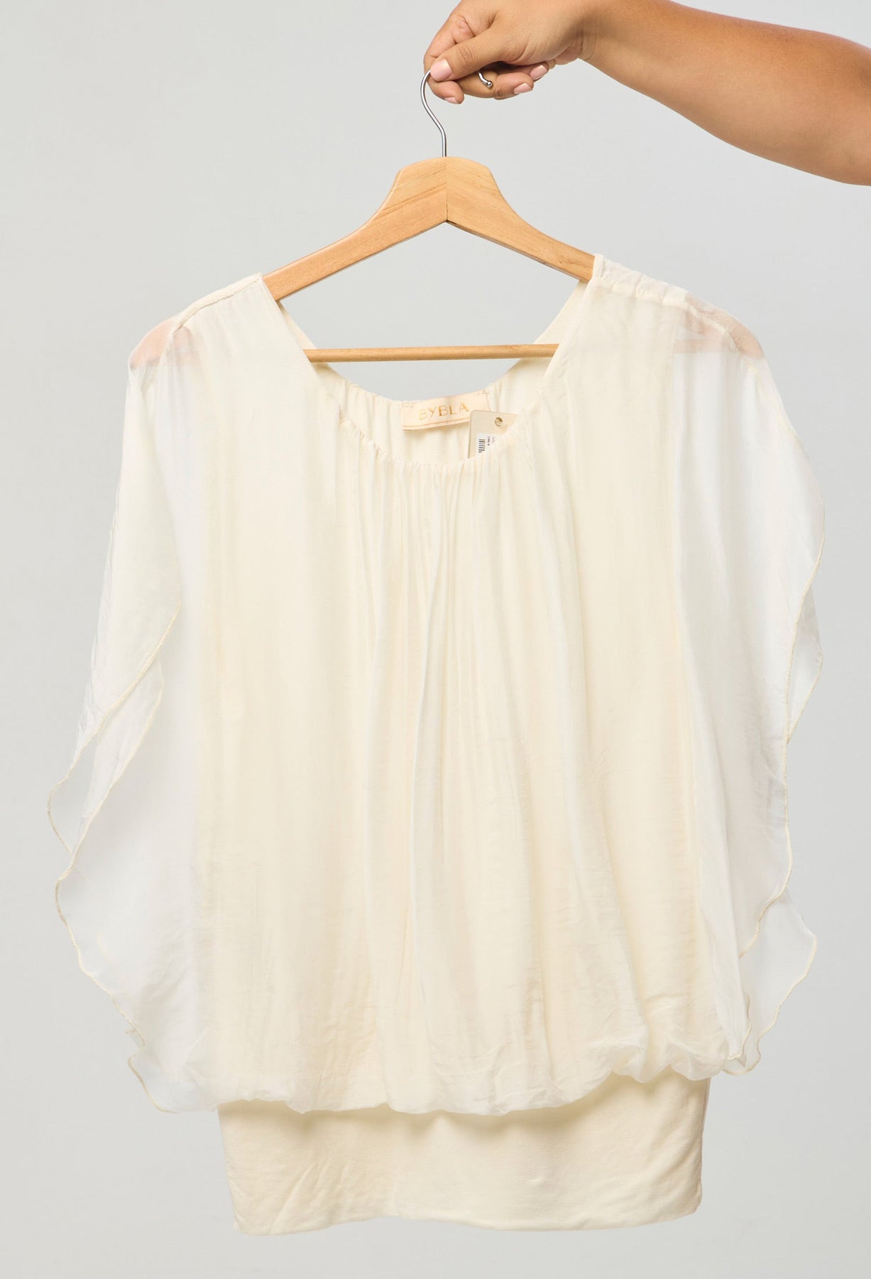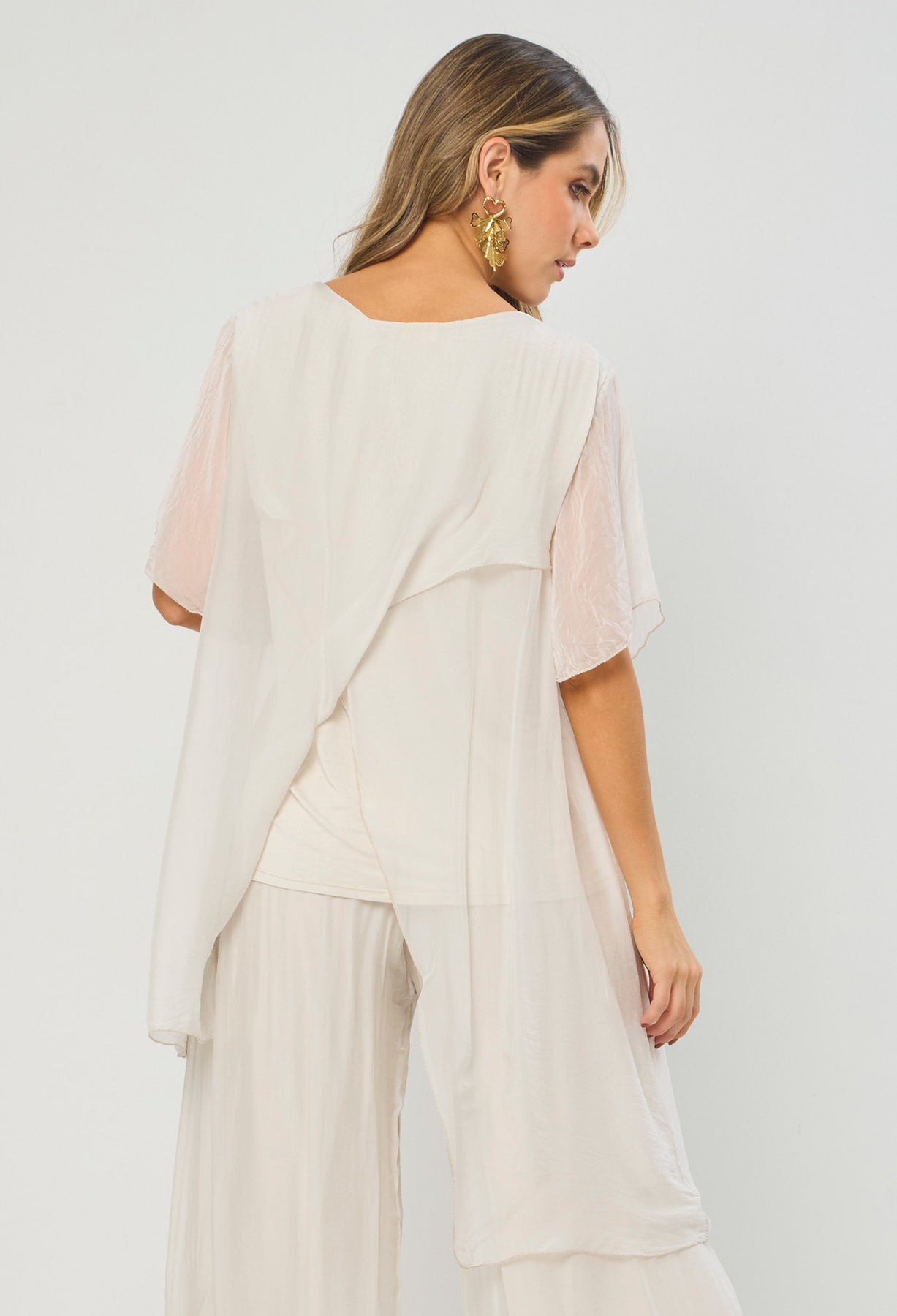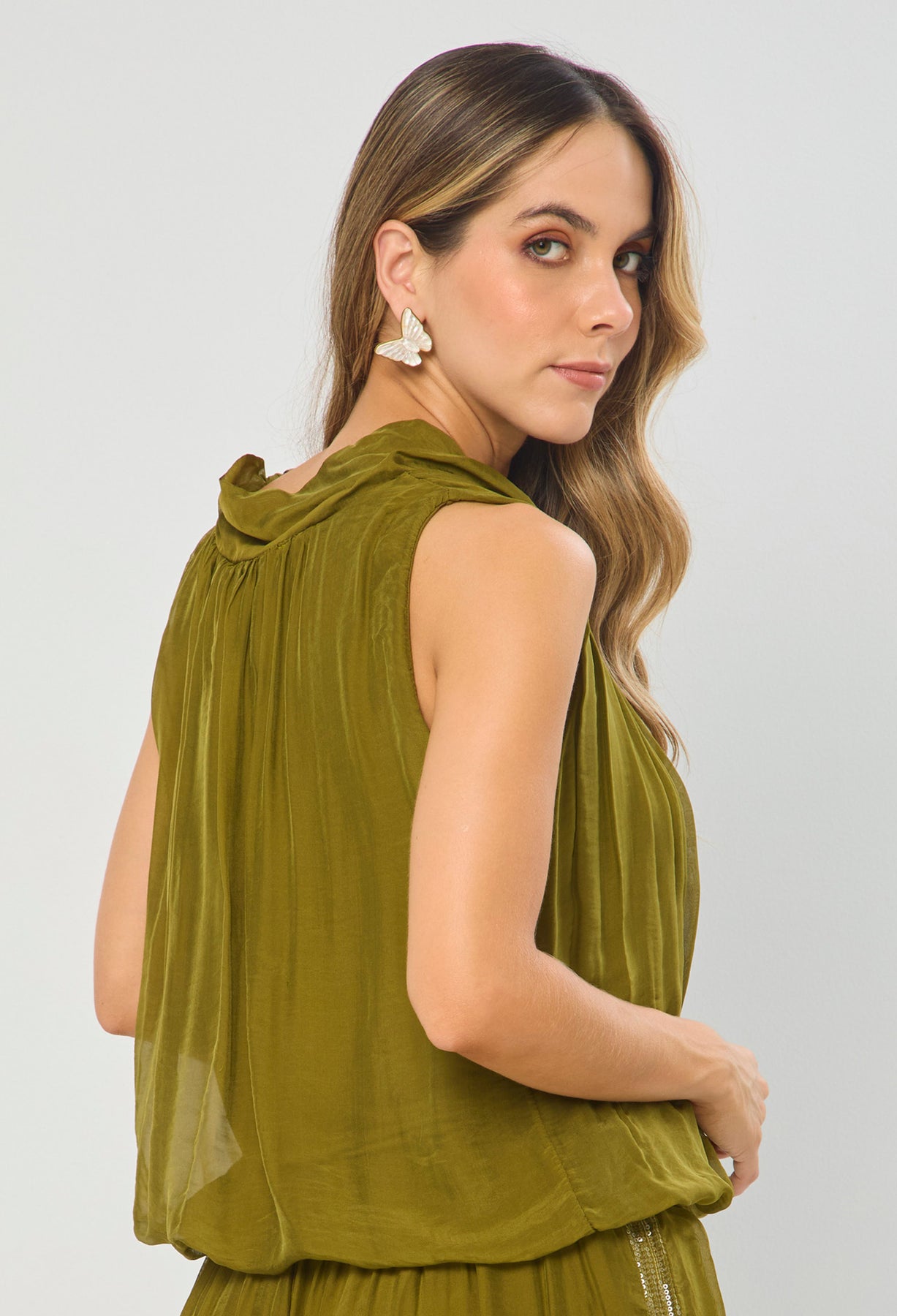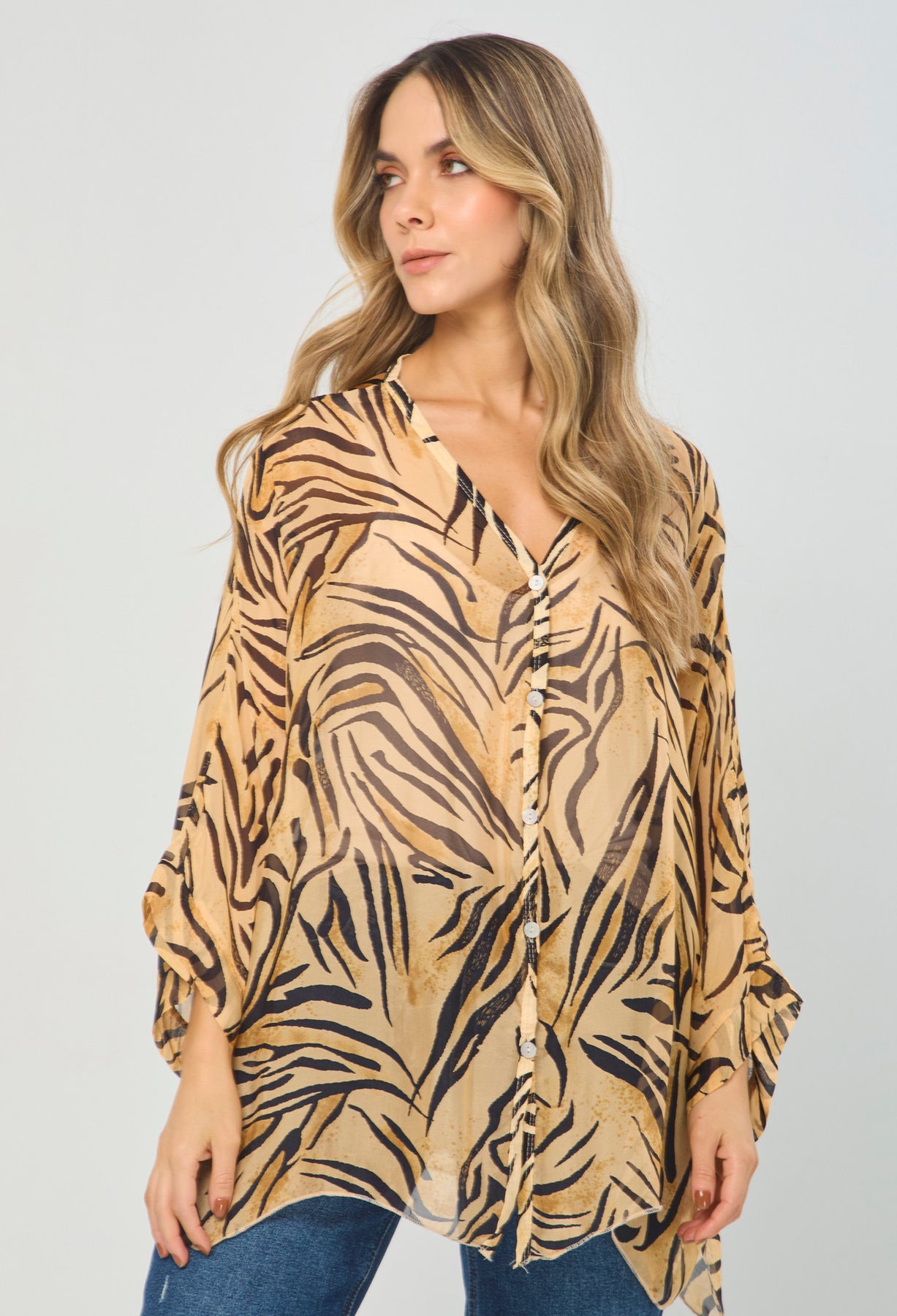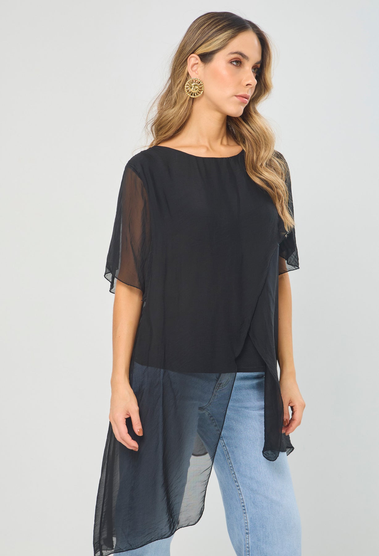Blusa de seda, manga larga con puño enresortado, detalle de lentejuelas en top parte inferior. Silueta amplia, corte asimétrico. La modelo mide 1.70 m y lleva puesta la talla ÚNICA.