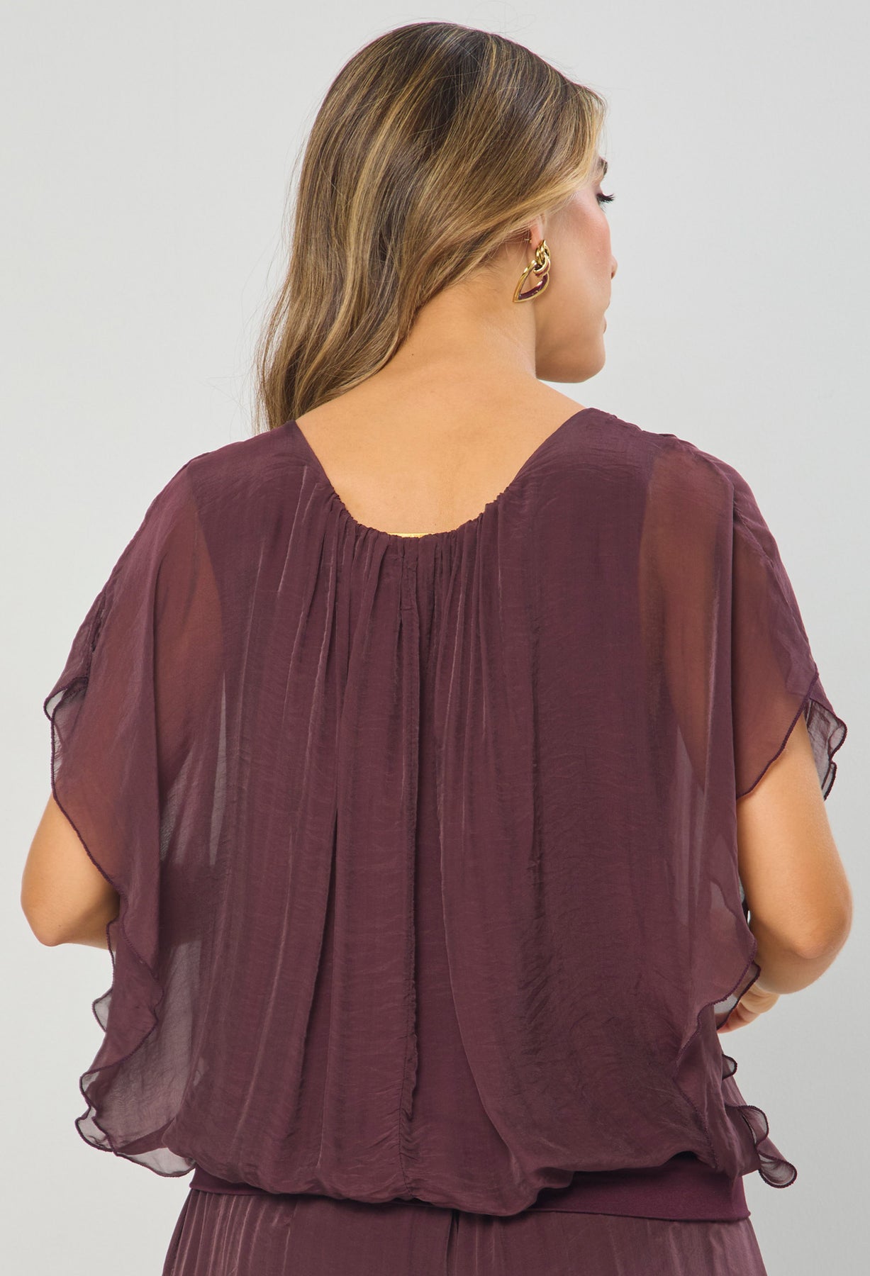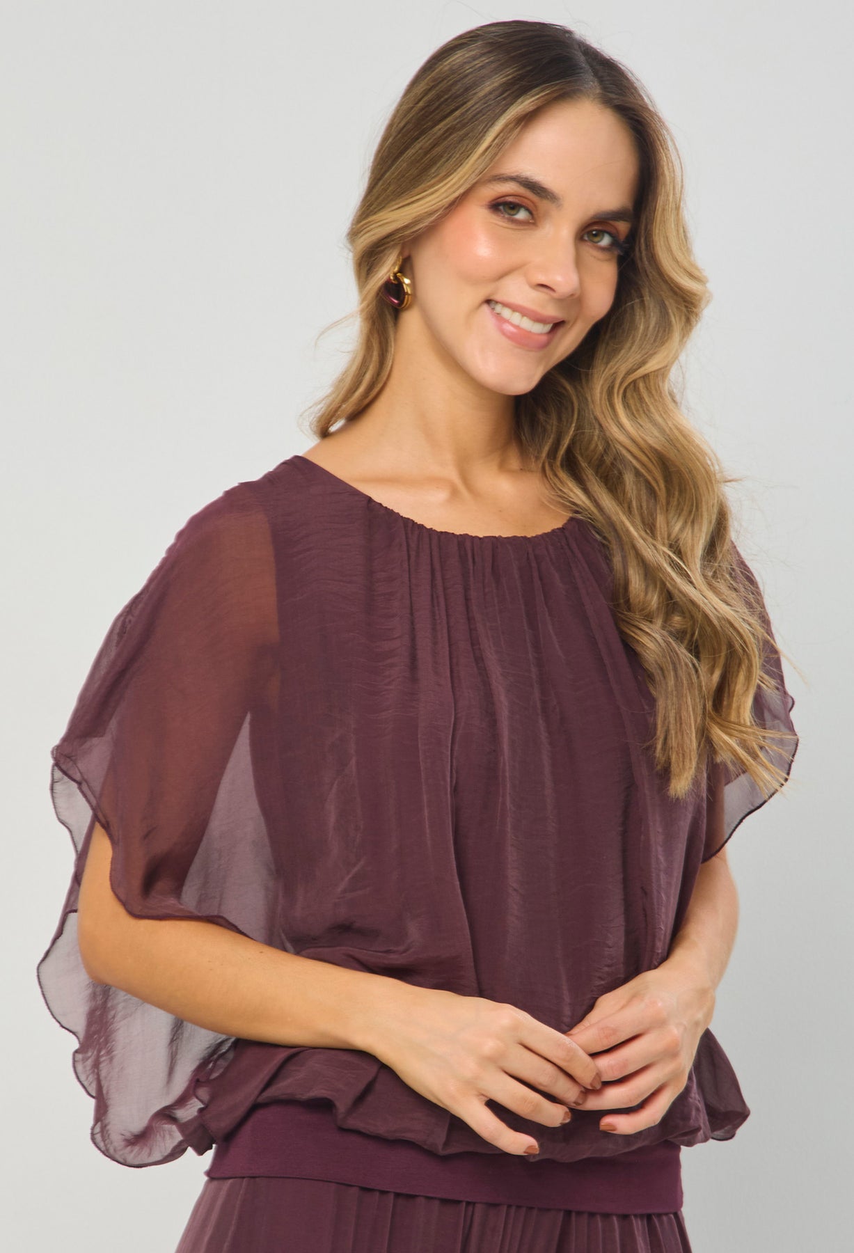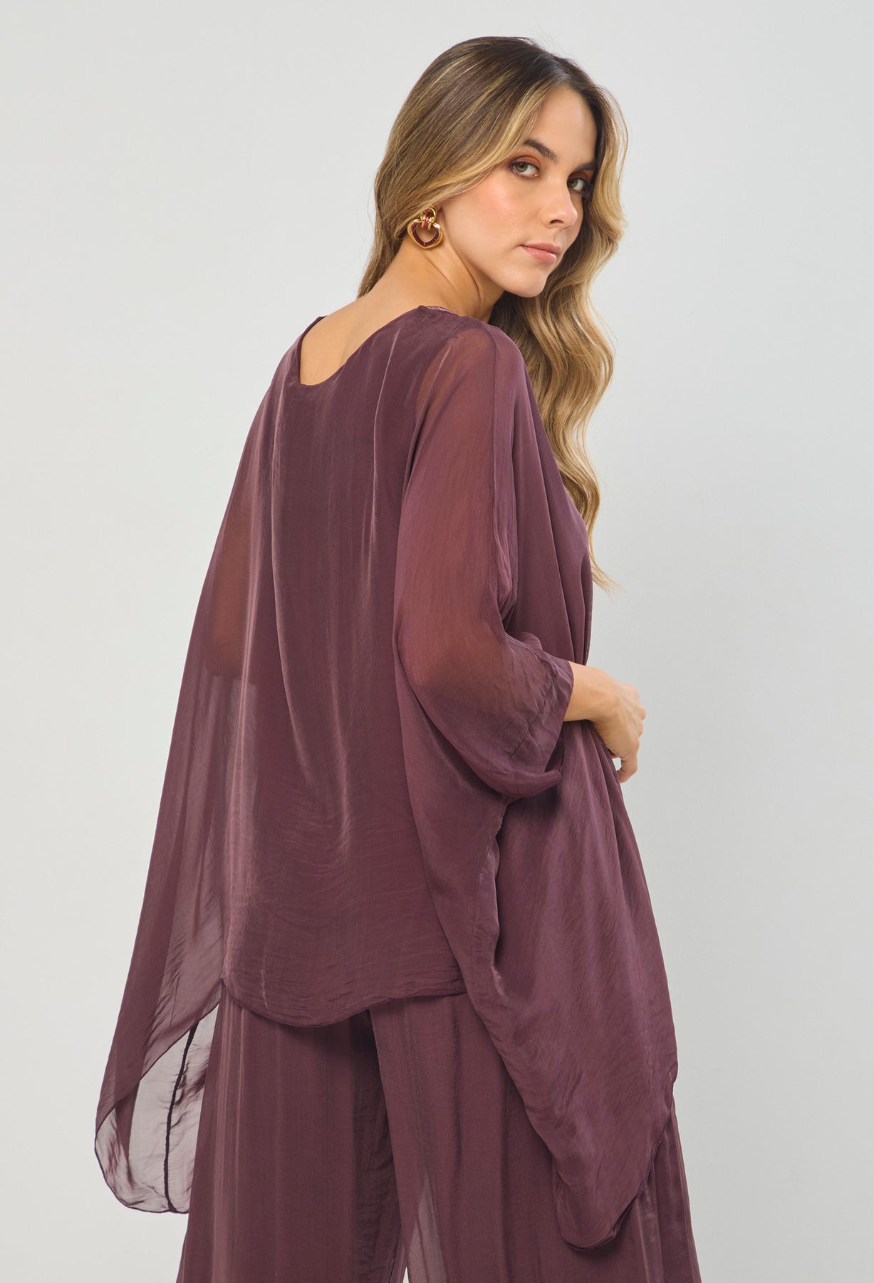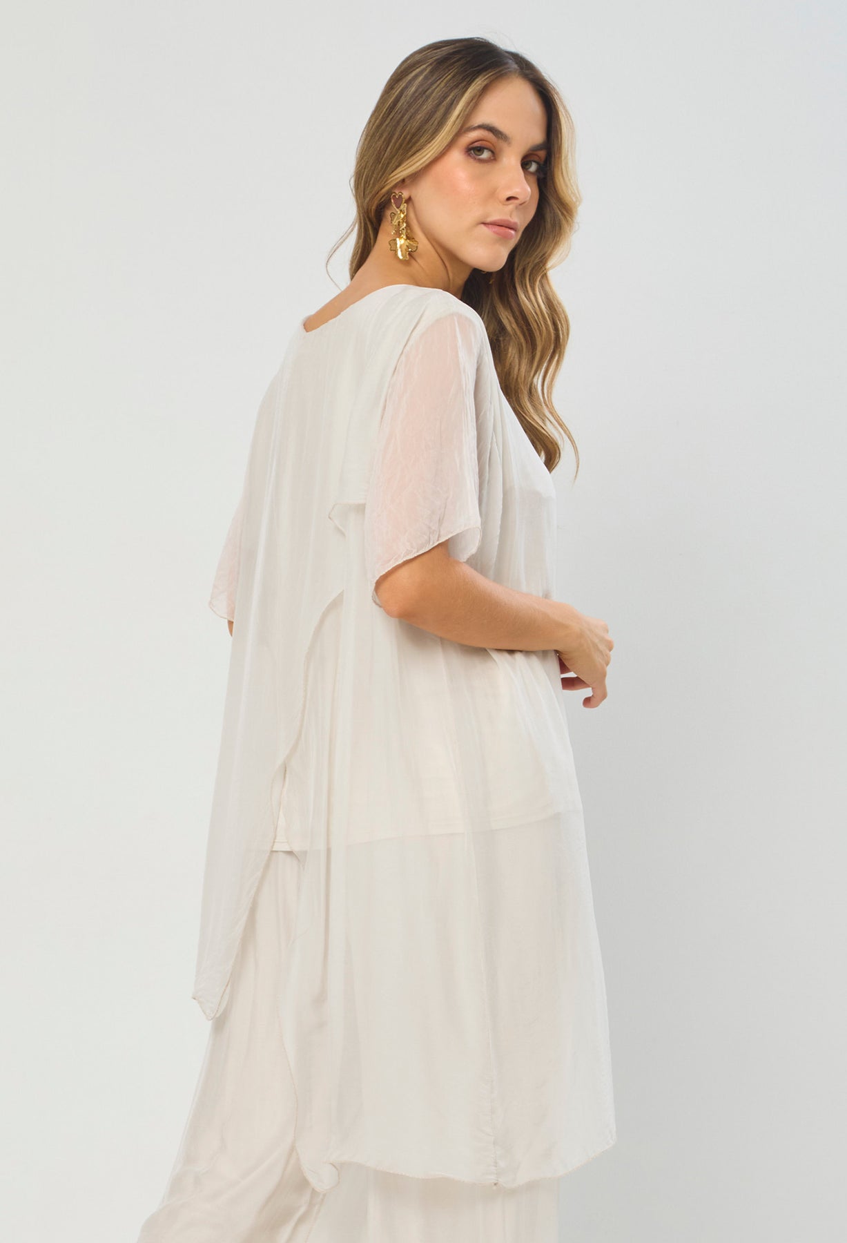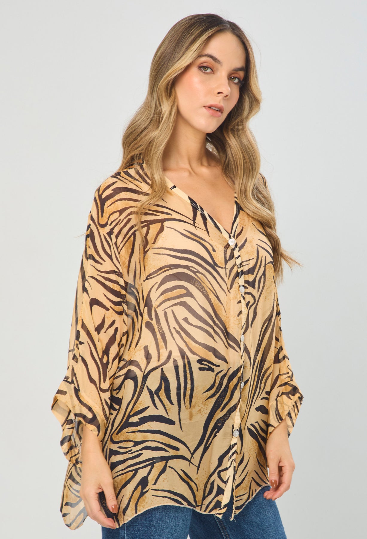 Blusa de seda, manga larga con puño enresortado, detalle de lentejuelas en top parte inferior. Silueta amplia, corte asimétrico. La modelo mide 1.70 m y lleva puesta la talla ÚNICA.