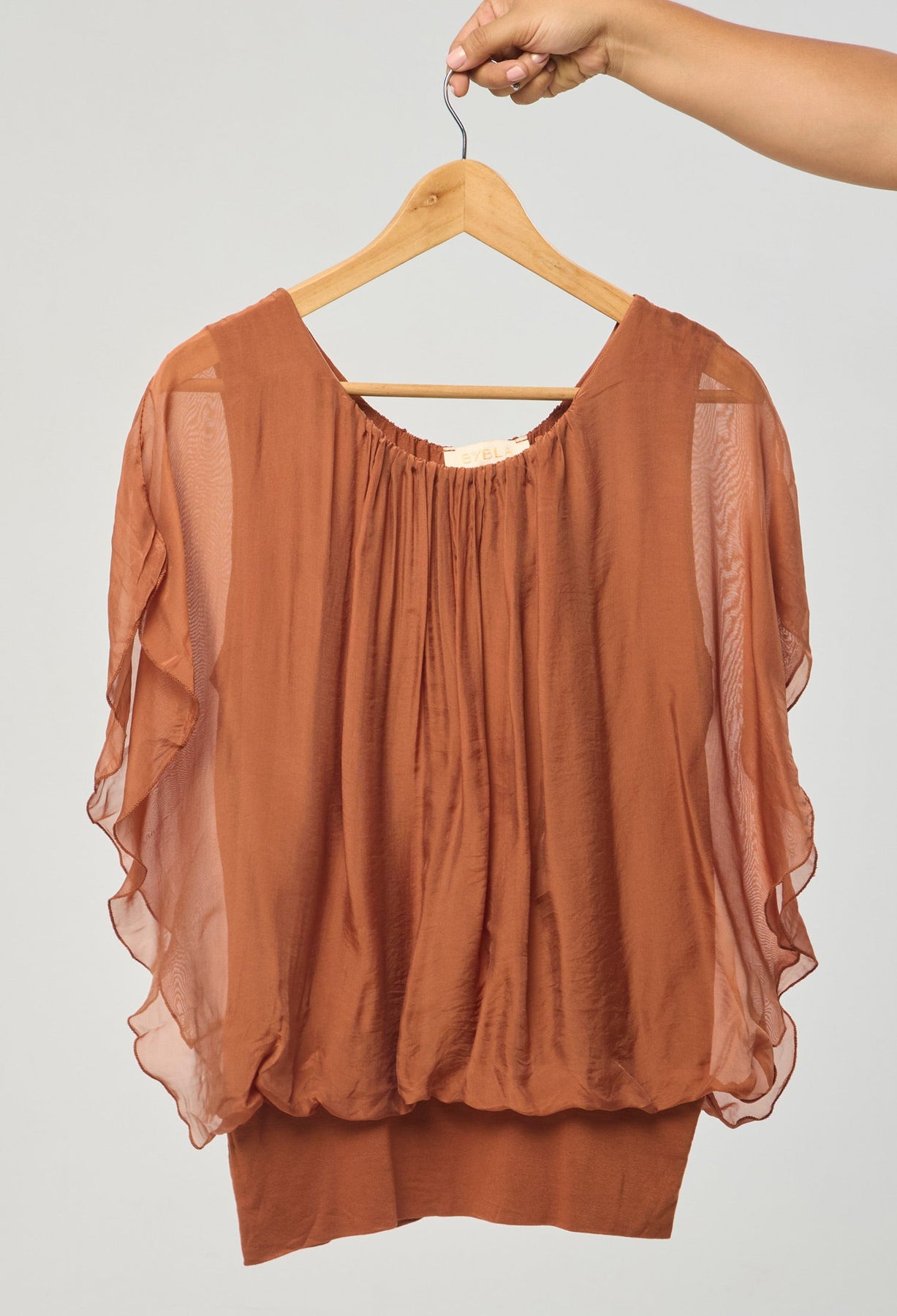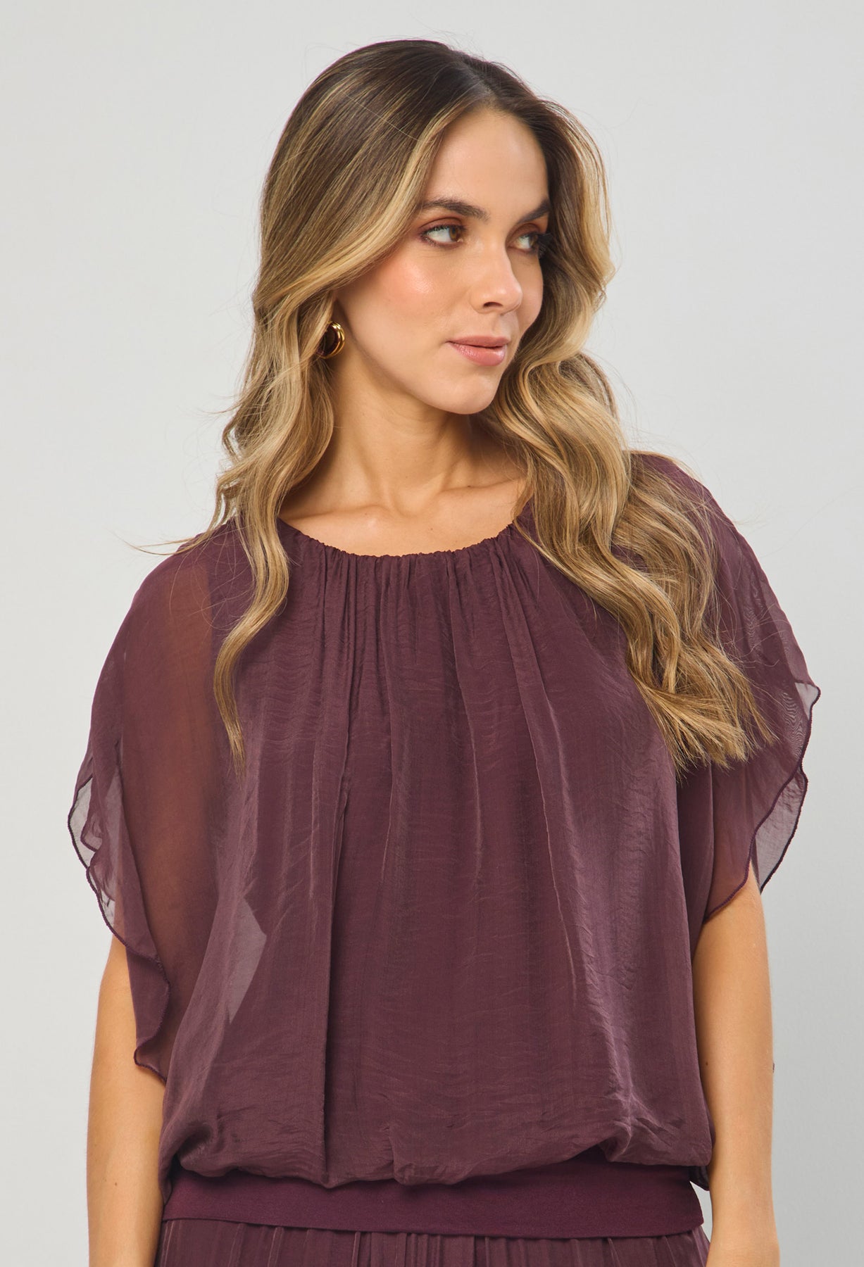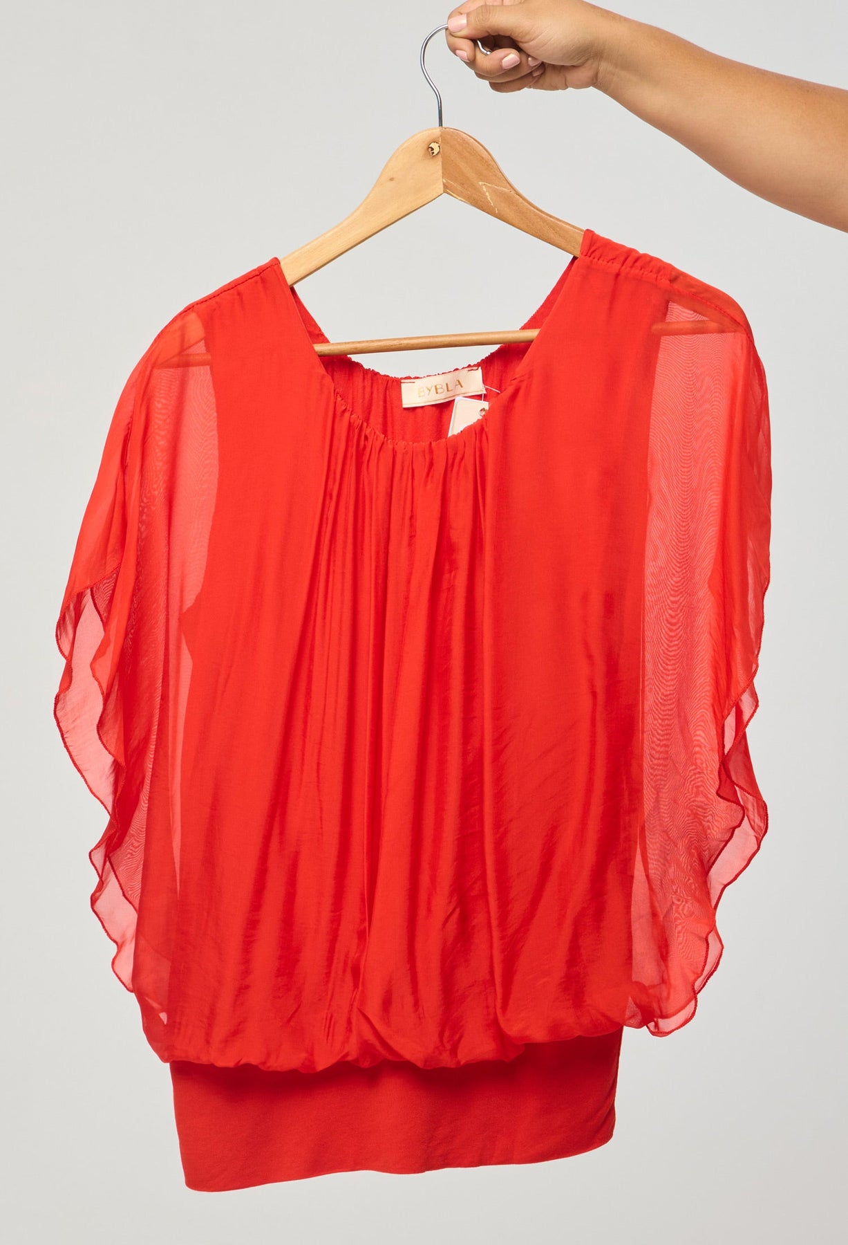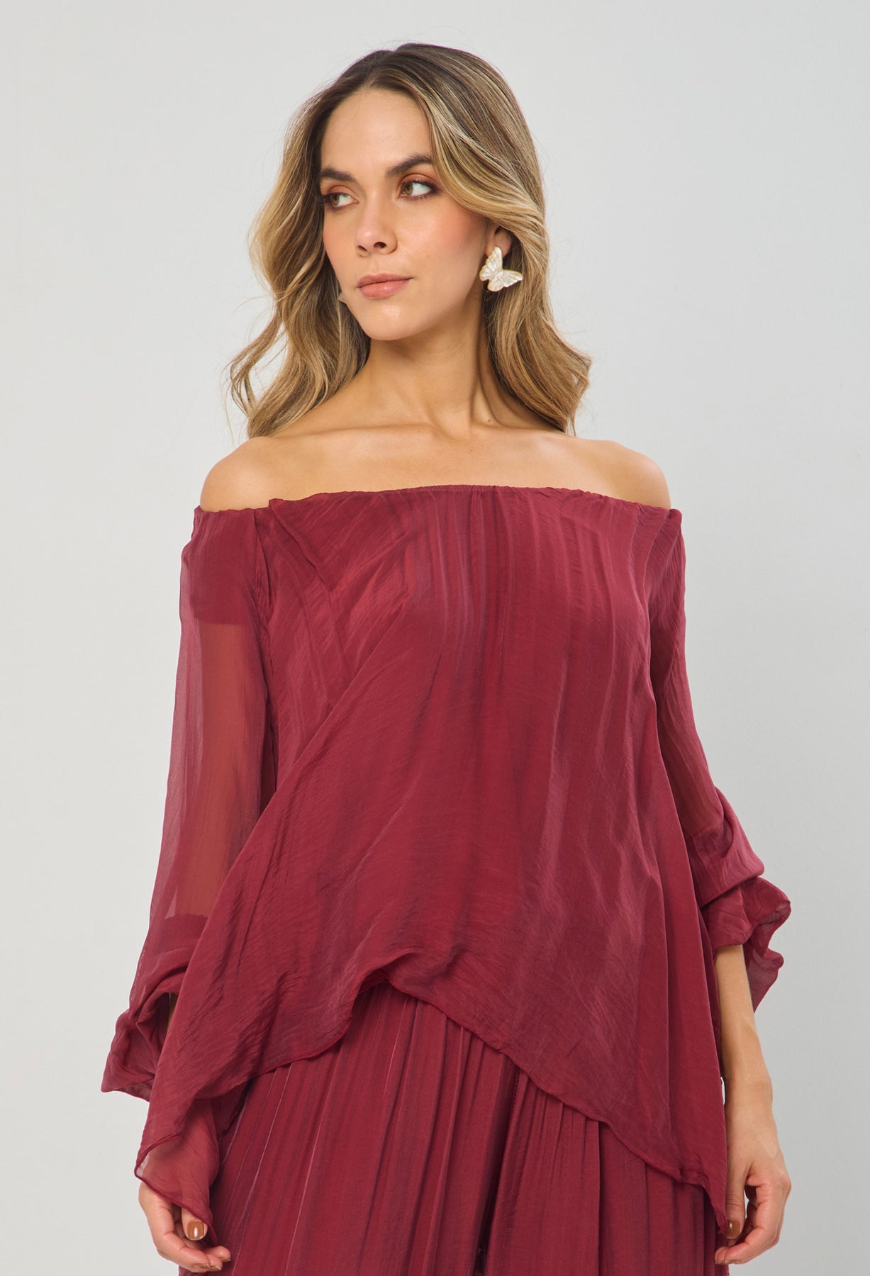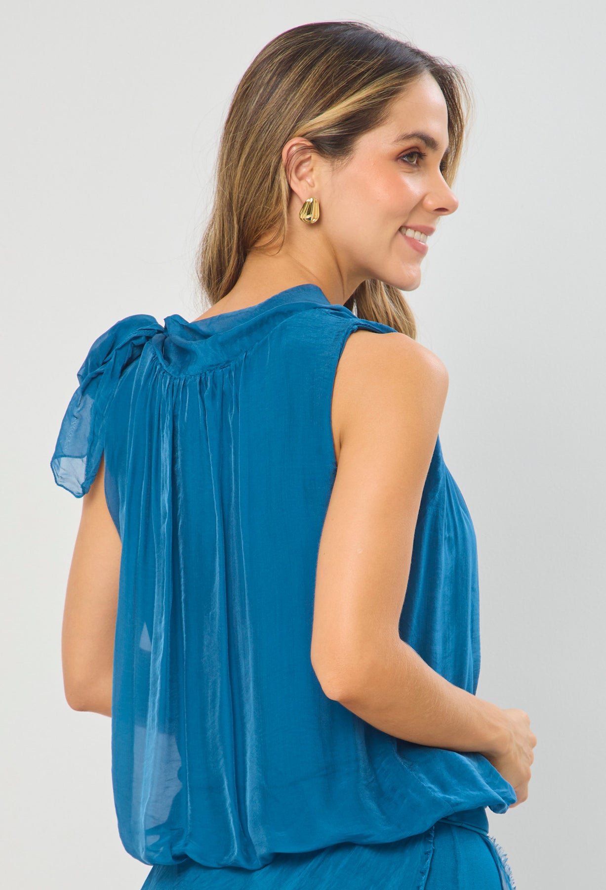 Blusa de seda, manga larga con puño enresortado, detalle de lentejuelas en top parte inferior. Silueta amplia, corte asimétrico. La modelo mide 1.70 m y lleva puesta la talla ÚNICA.