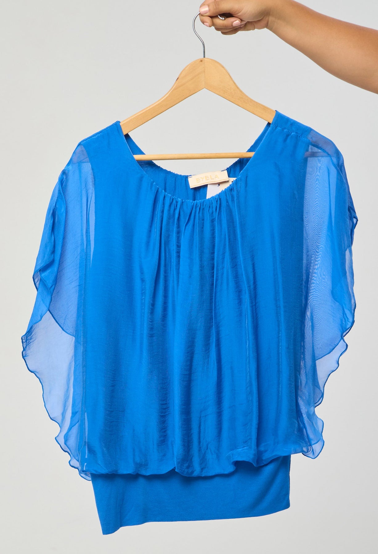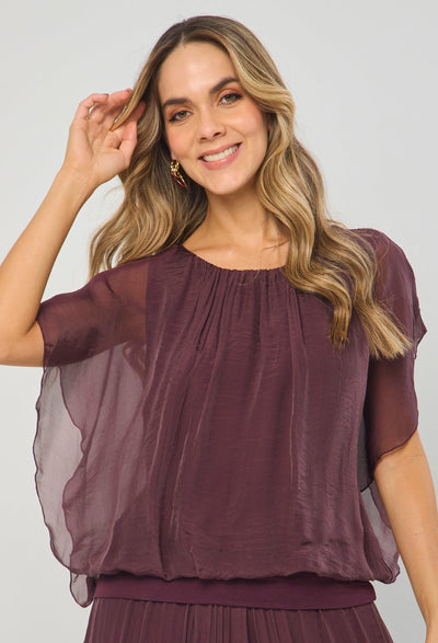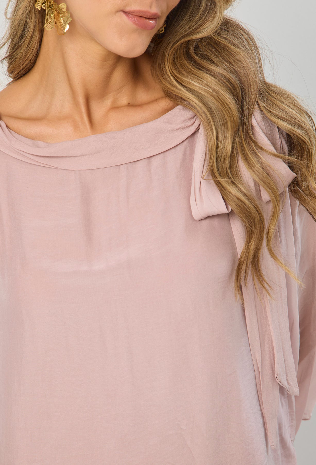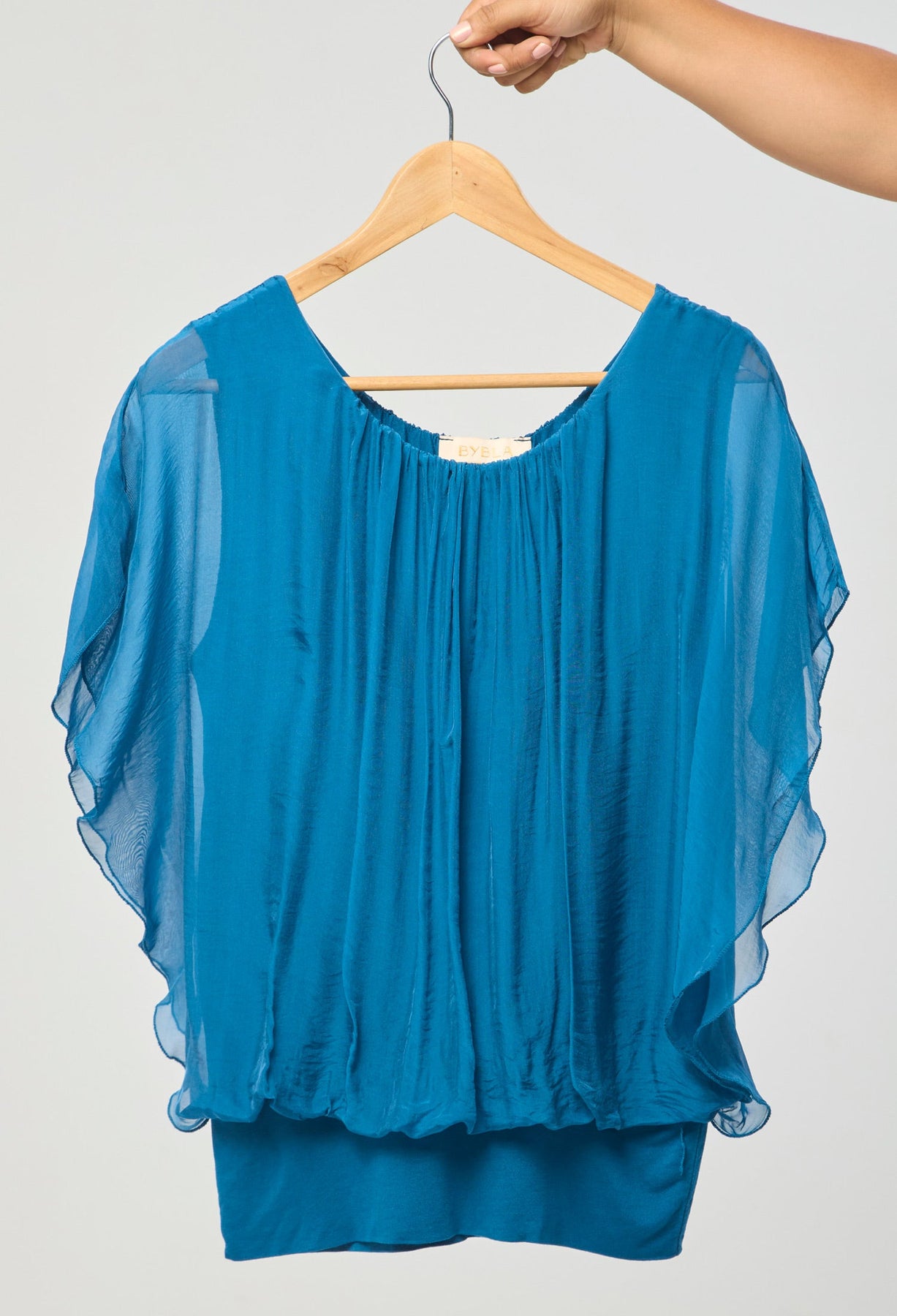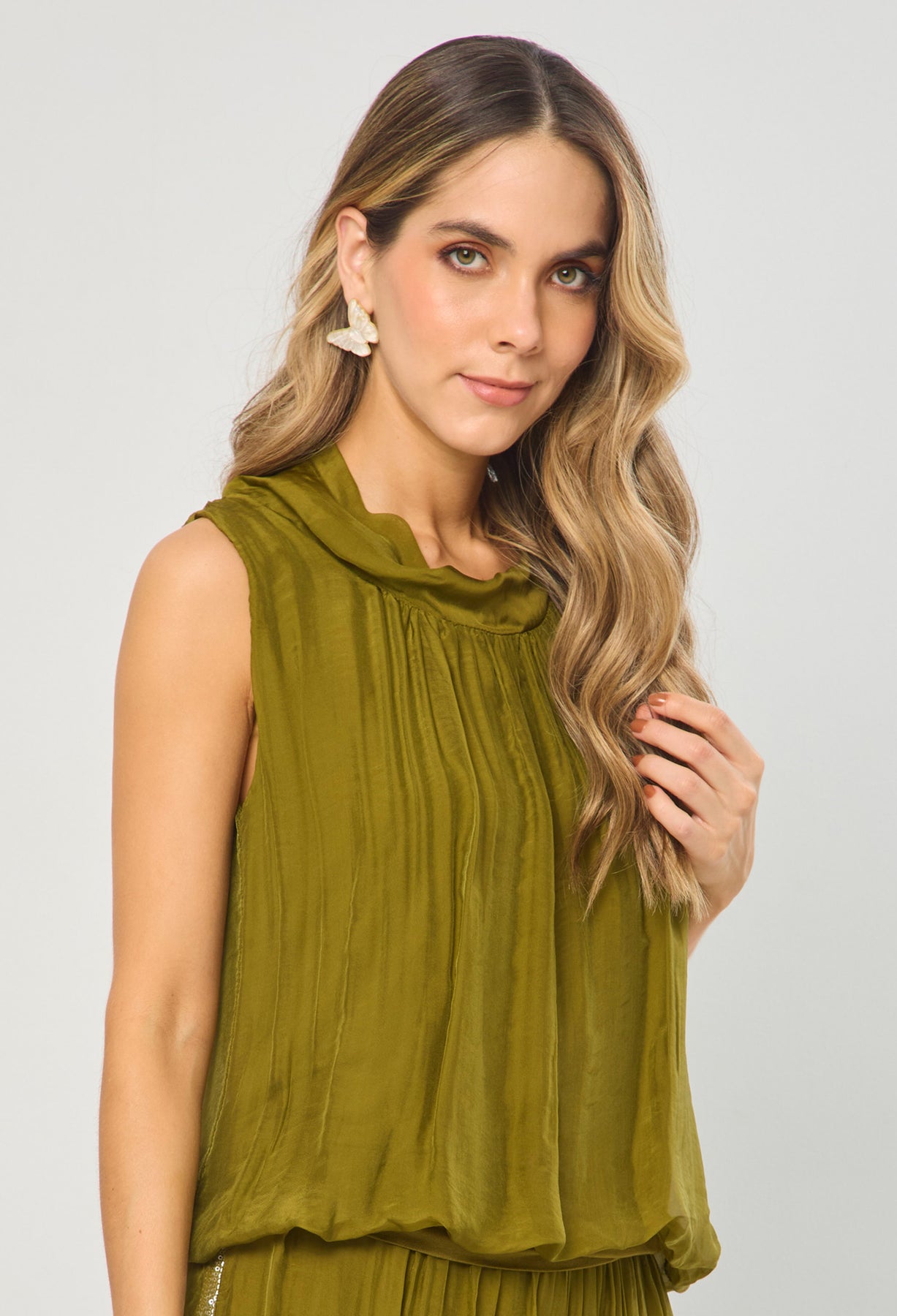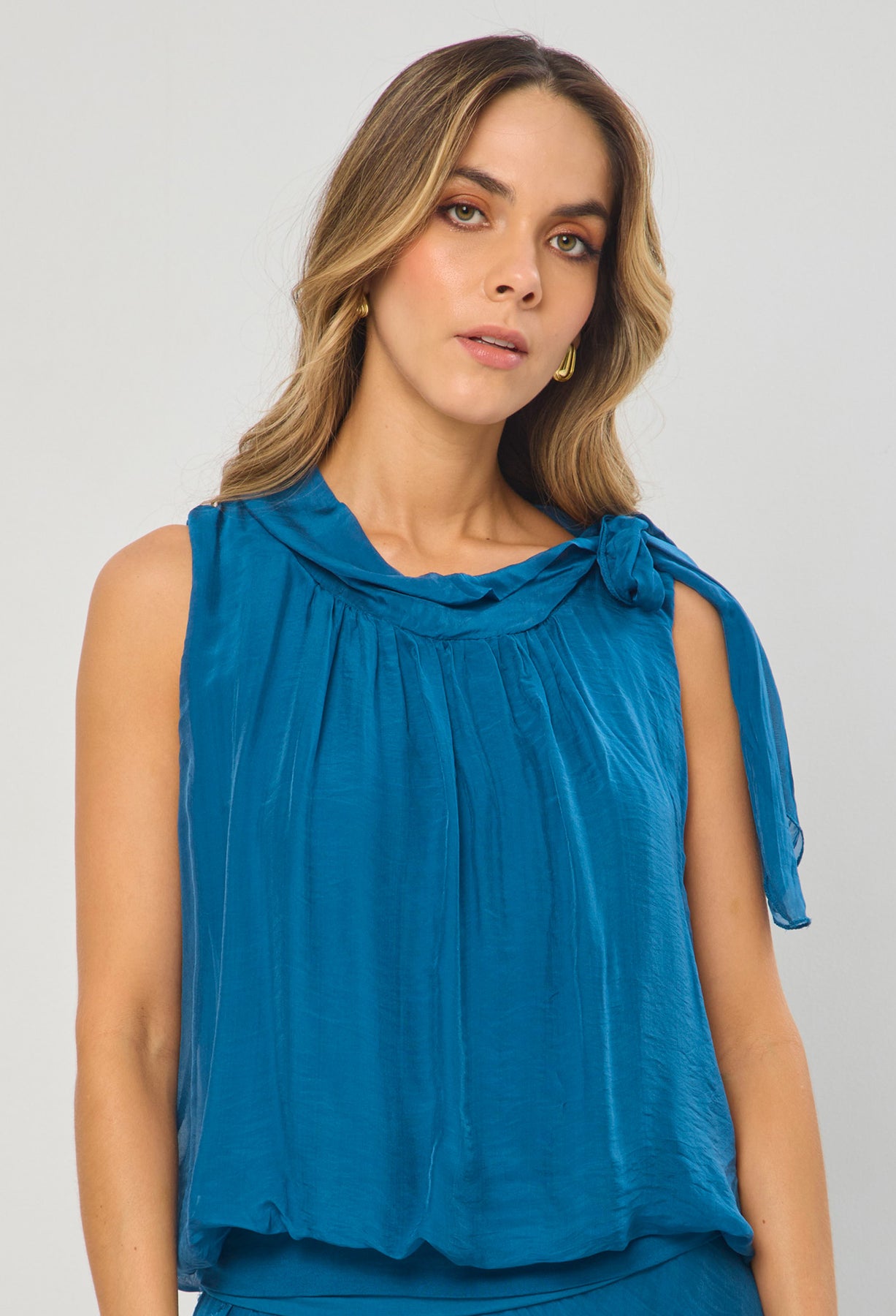 Blusa de seda, manga larga con puño enresortado, detalle de lentejuelas en top parte inferior. Silueta amplia, corte asimétrico. La modelo mide 1.70 m y lleva puesta la talla ÚNICA.