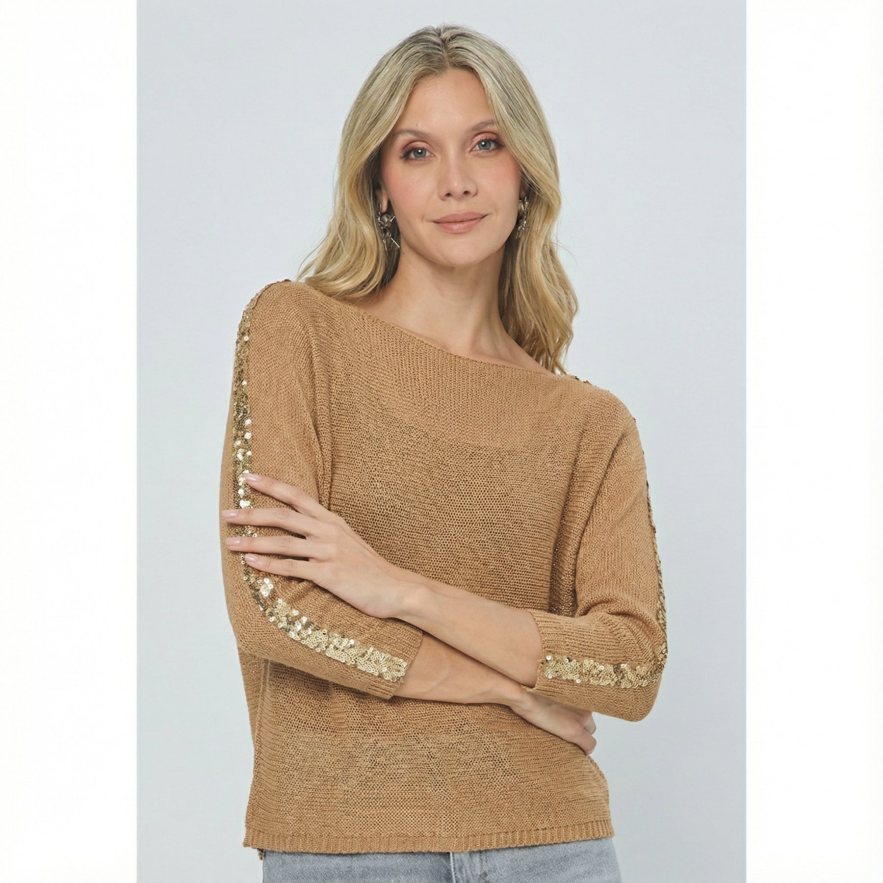 Precio habitual $189.900 Precio de oferta $142.425 Ahorro de 25%Blusa tejida, detalle con lentejuelas en hombro y mangas, cuello redondo. La prenda que tiene puesta la modelo es talla UNICA. La altura de la modelo es de 1.75m. Los accesorios de esta foto no vienen con la prenda.