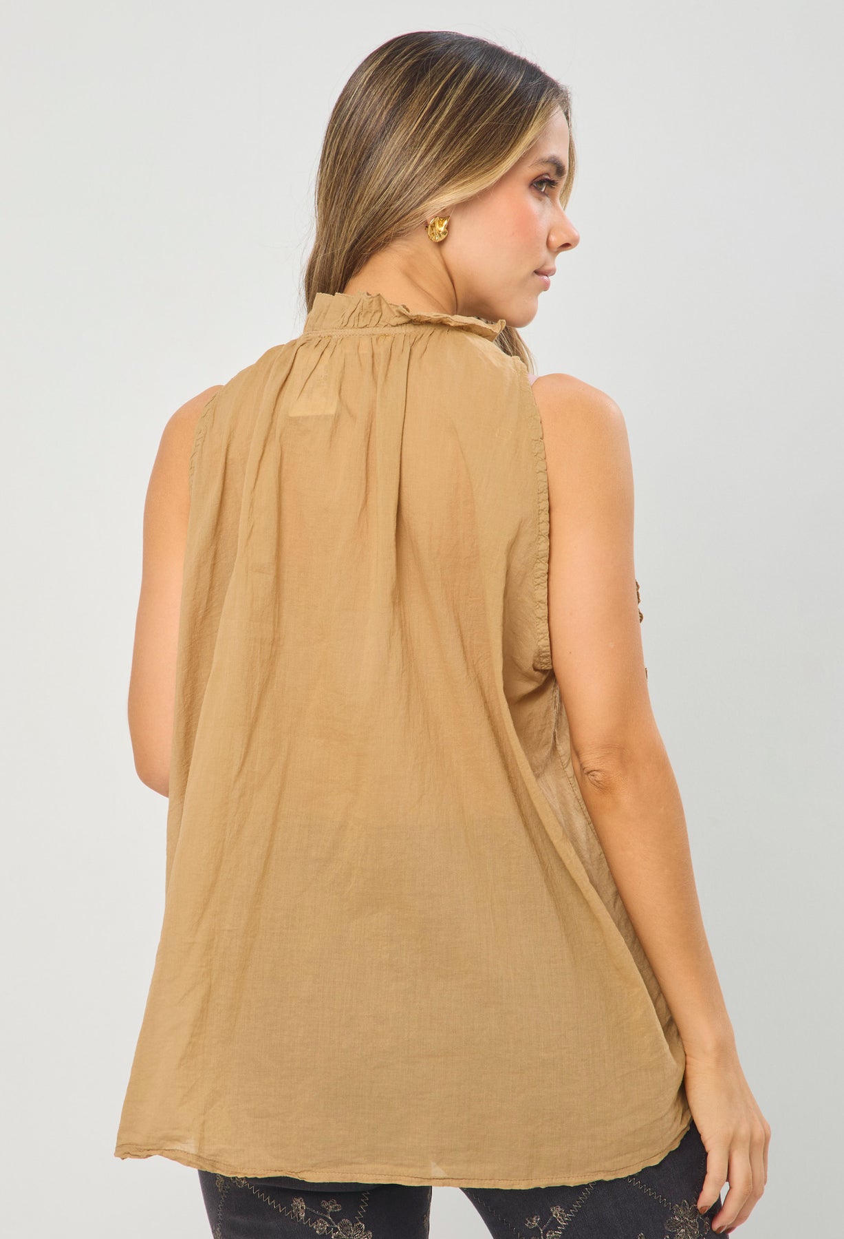 Blusa en seda, manga sisa, con cuello alto y detalle ajustable como pequeña pashmina; con cinturon en ruedo con elongación. La modelo mide 1.63 m y lleva puesta la talla ÚNICA.