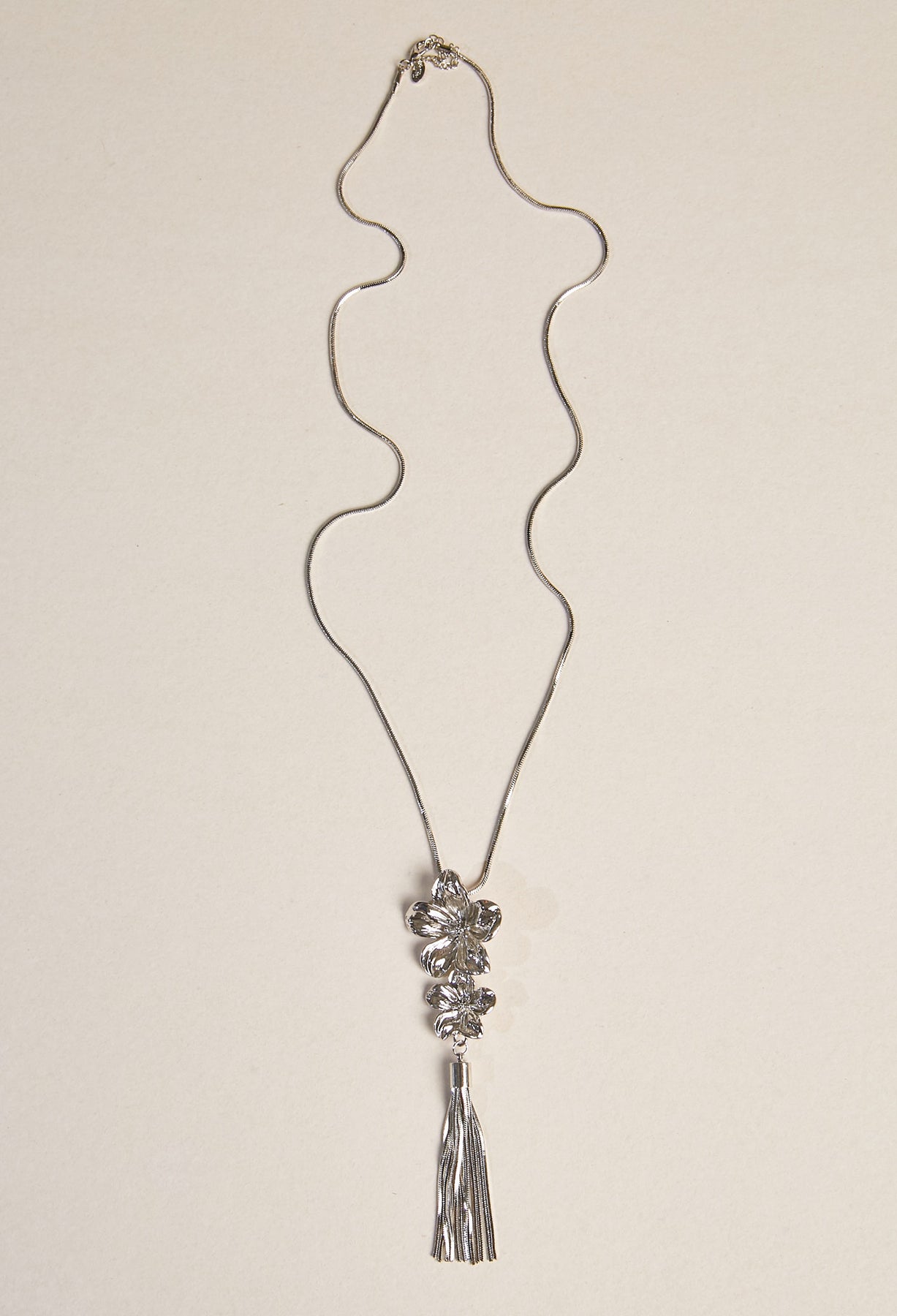 Precio habitual $69.900Collar largo cadena con dije de flores de cinco pétalos y detalle de borlas. Medida Aprox. 65cm
