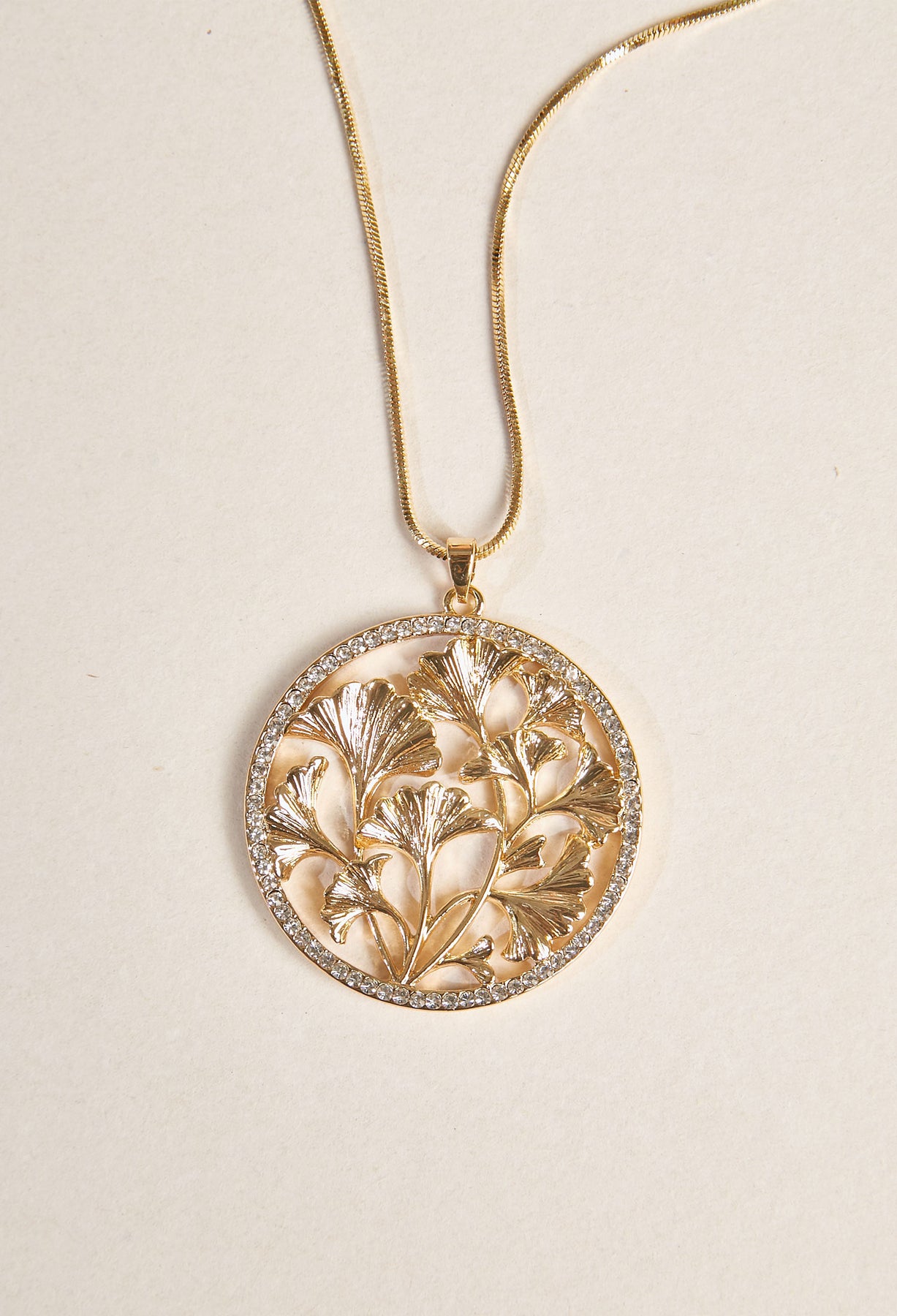 Precio habitual $69.900Collar largo cadena dorado con dije diseño de hojas Ginko.