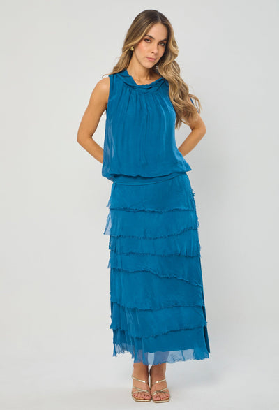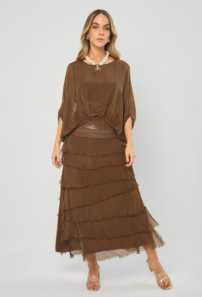 Falda larga con transparencia y forro, ajuste en pretina enresortada, su textil cuenta con un diseño en flores tipo bordado guipur con elongación. La altura de la modelo es 1.76cm y esta usando una talla S.