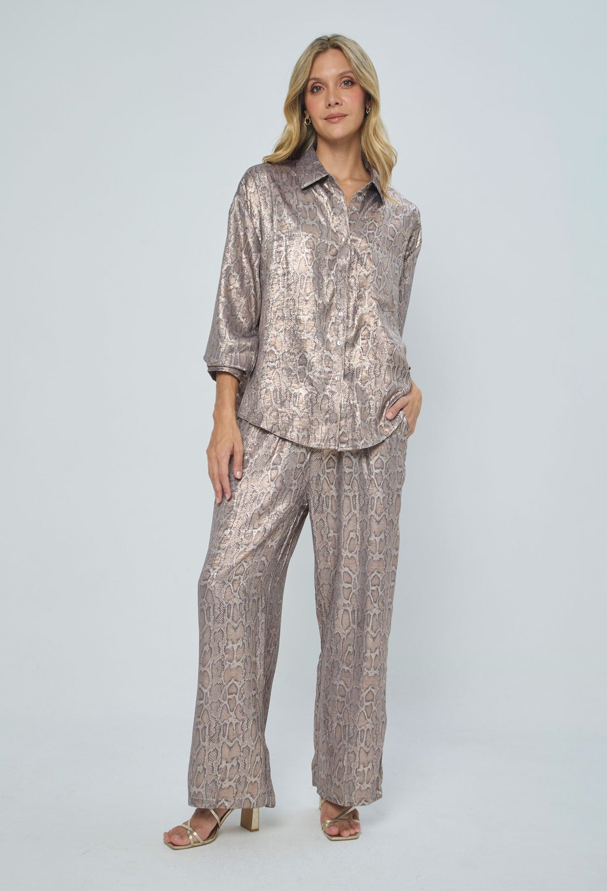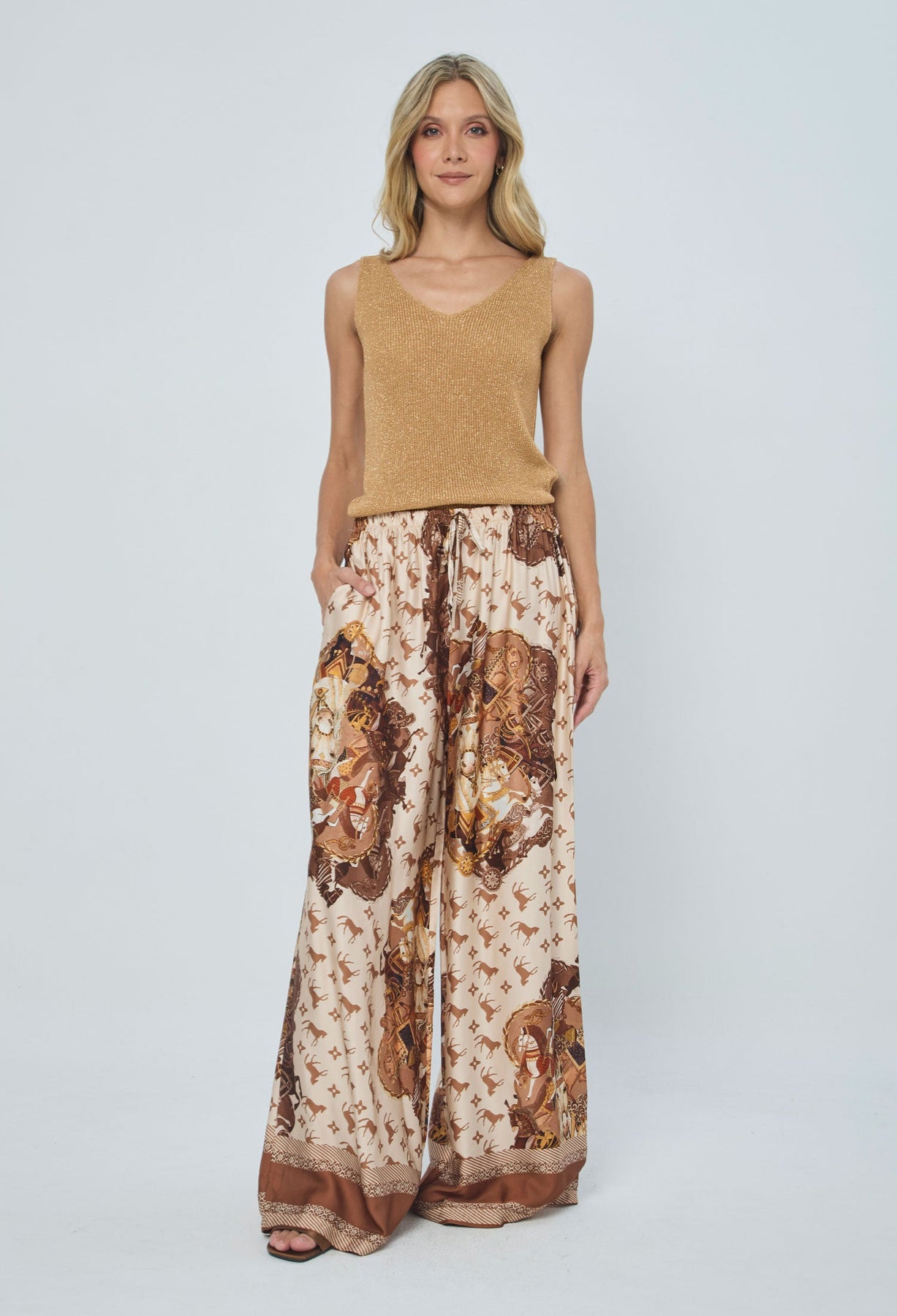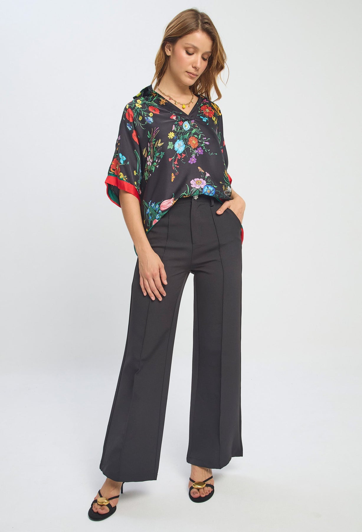 Pantalón bota campana, estampado de cebra, tiro alto, bolsillos y botones delanteros. La prenda que tiene puesta la modelo es talla XS. La altura de la modelo es de 1.75. Los accesorios de esta foto no vienen con la prenda.