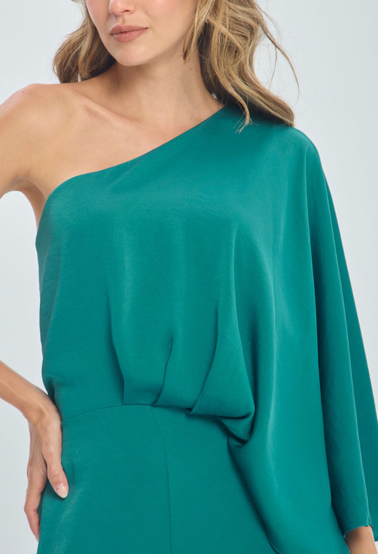 Vestido largo, drapeado en pecho, manga one-shoulder, corte sirena. La prenda que tiene puesta la modelo es talla S. La altura de la modelo es de 1.75. Los accesorios de esta foto no vienen con la prenda.