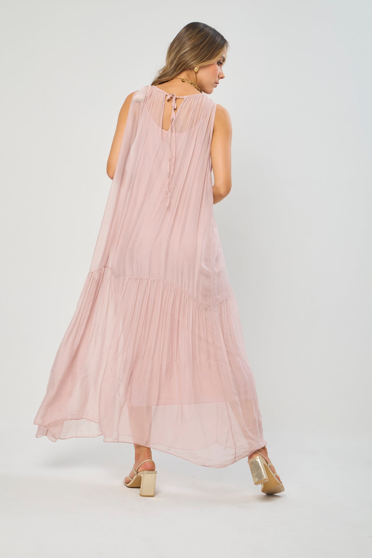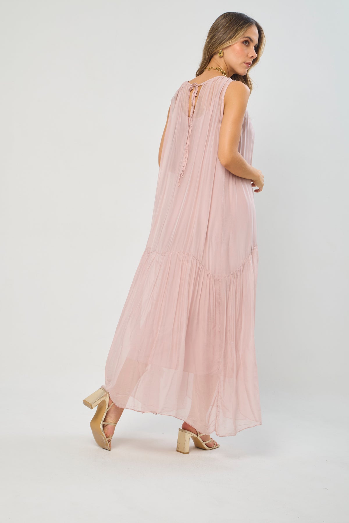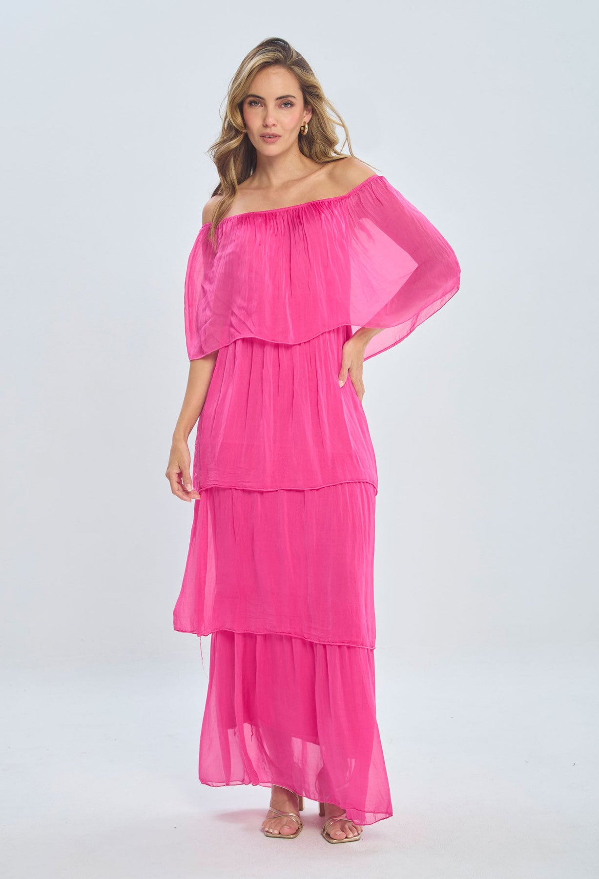 Vestido largo, drapeado en pecho, manga one-shoulder, corte sirena. La prenda que tiene puesta la modelo es talla S. La altura de la modelo es de 1.75. Los accesorios de esta foto no vienen con la prenda.