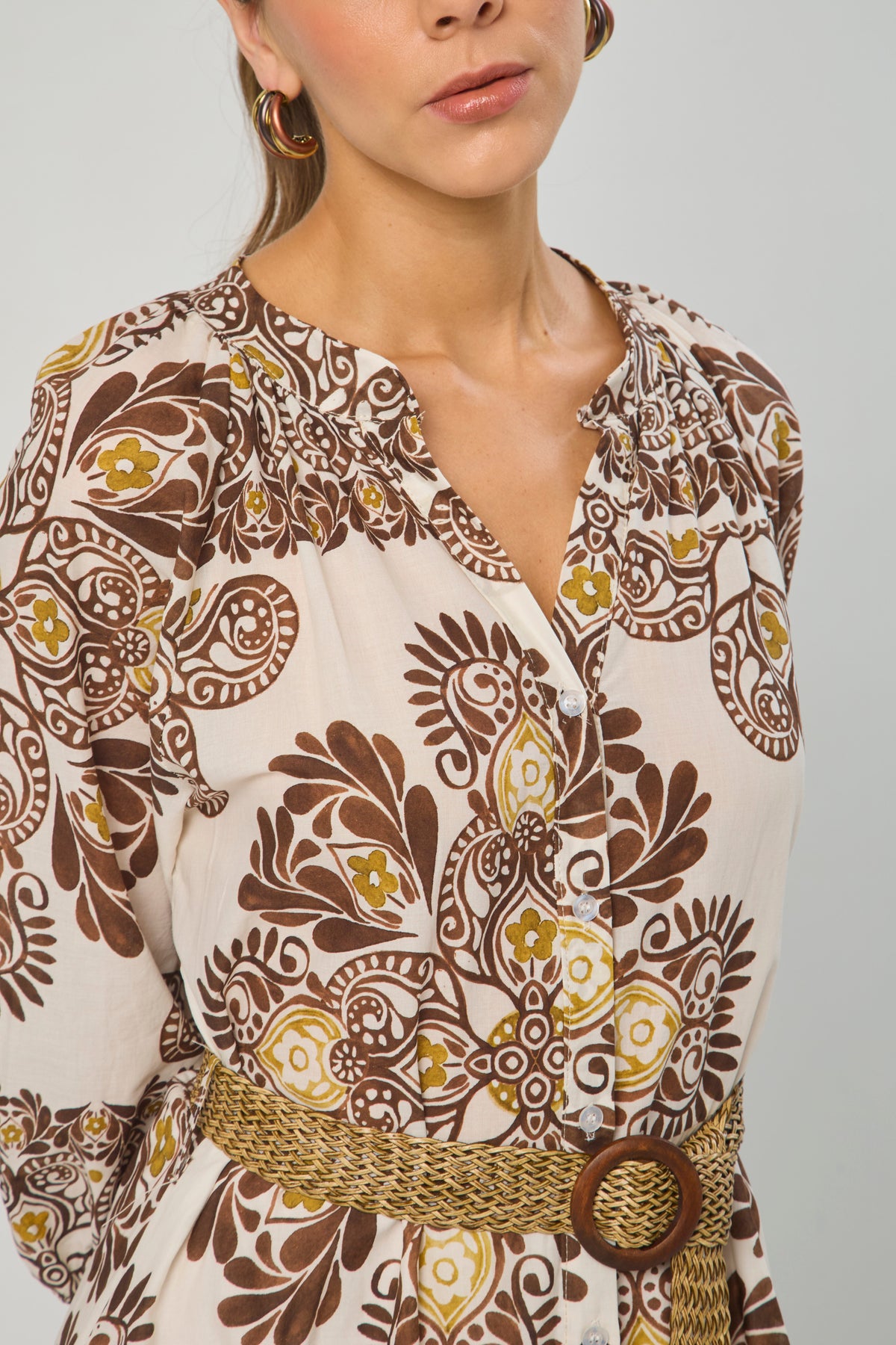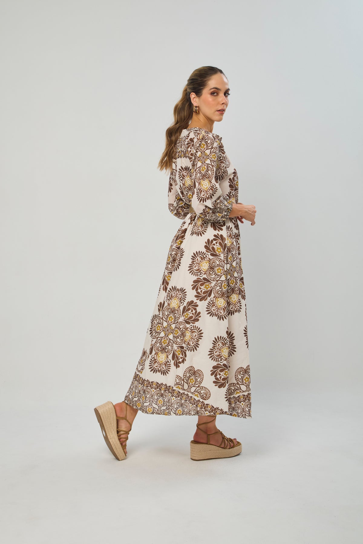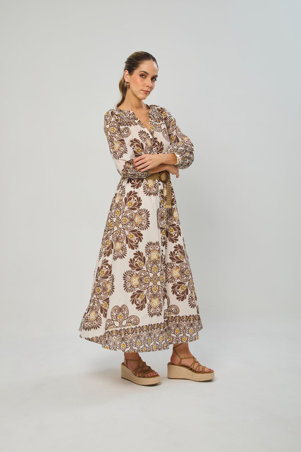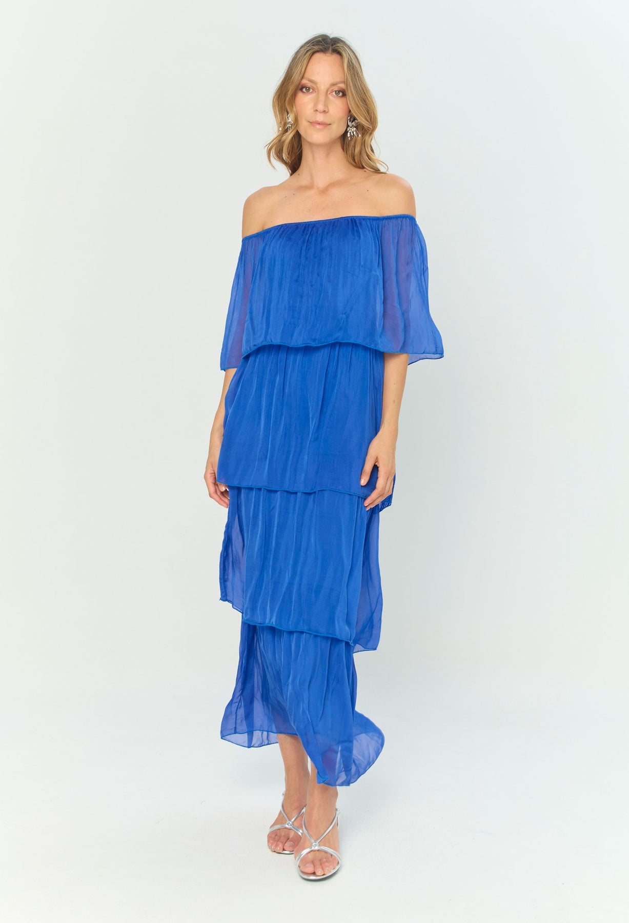 Vestido largo, drapeado en pecho, manga one-shoulder, corte sirena. La prenda que tiene puesta la modelo es talla S. La altura de la modelo es de 1.75. Los accesorios de esta foto no vienen con la prenda.