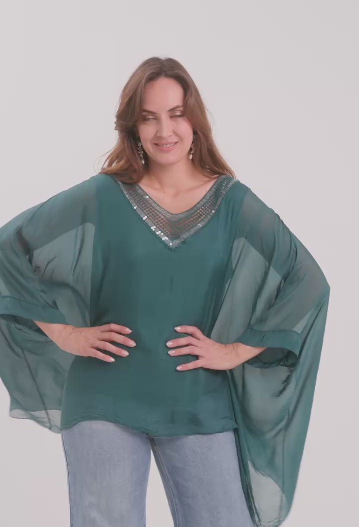Para un evento de noche, combínala con nuestro pantalón de terciopelo o una falda de satín para resaltar su brillo. Su diseño versátil también permite llevarla con jeans ajustados y sandalias de tacón para un look de coctel sofisticado. La generosa amplitud de la seda exterior asegura una silueta etérea que favorece a todos los tipos de cuerpo.