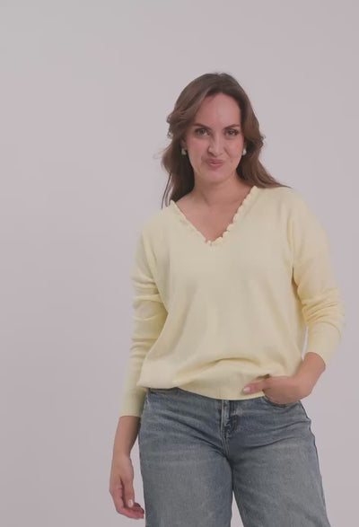 - Escote: Cuello en V con detalle de terminación tejida que aporta estructura y diseño.
