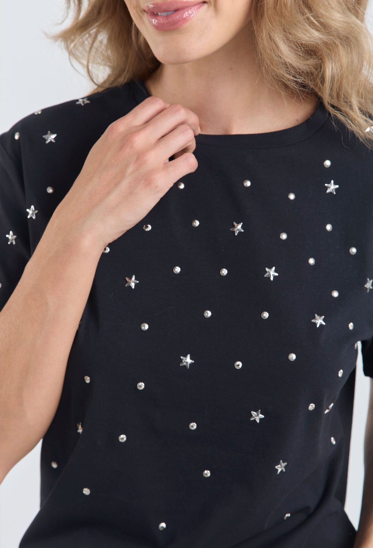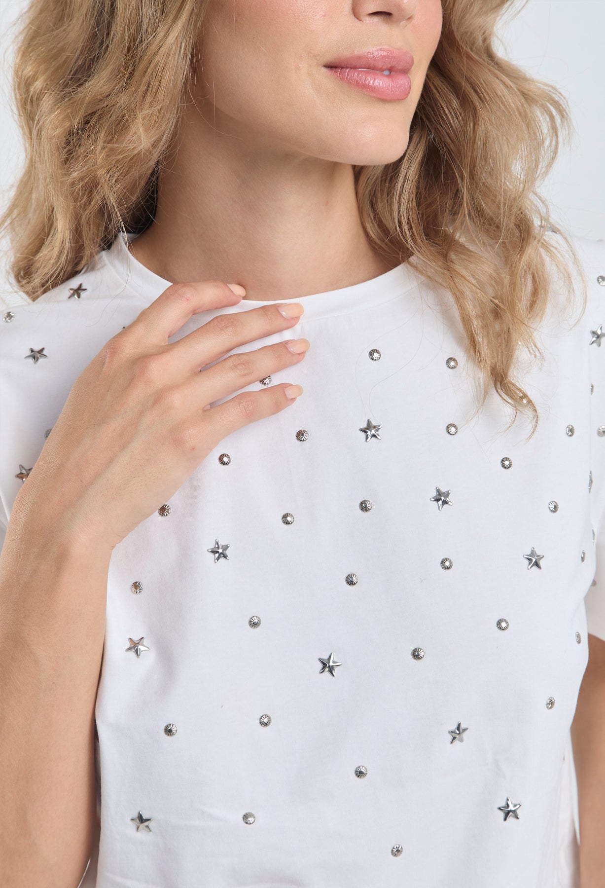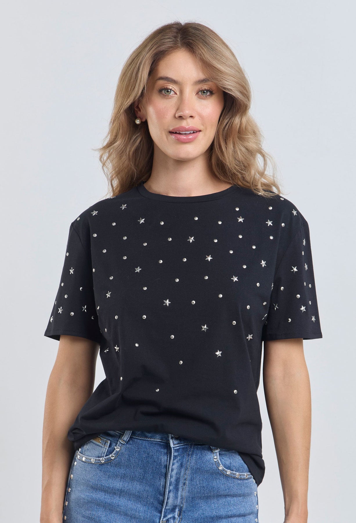 Precio habitual $189.900Camiseta con apliques metálicos de estrellas y taches en parte delantera, cuello redondo, manga corta. La modelo mide 1.74 m y lleva puesta la talla S/M