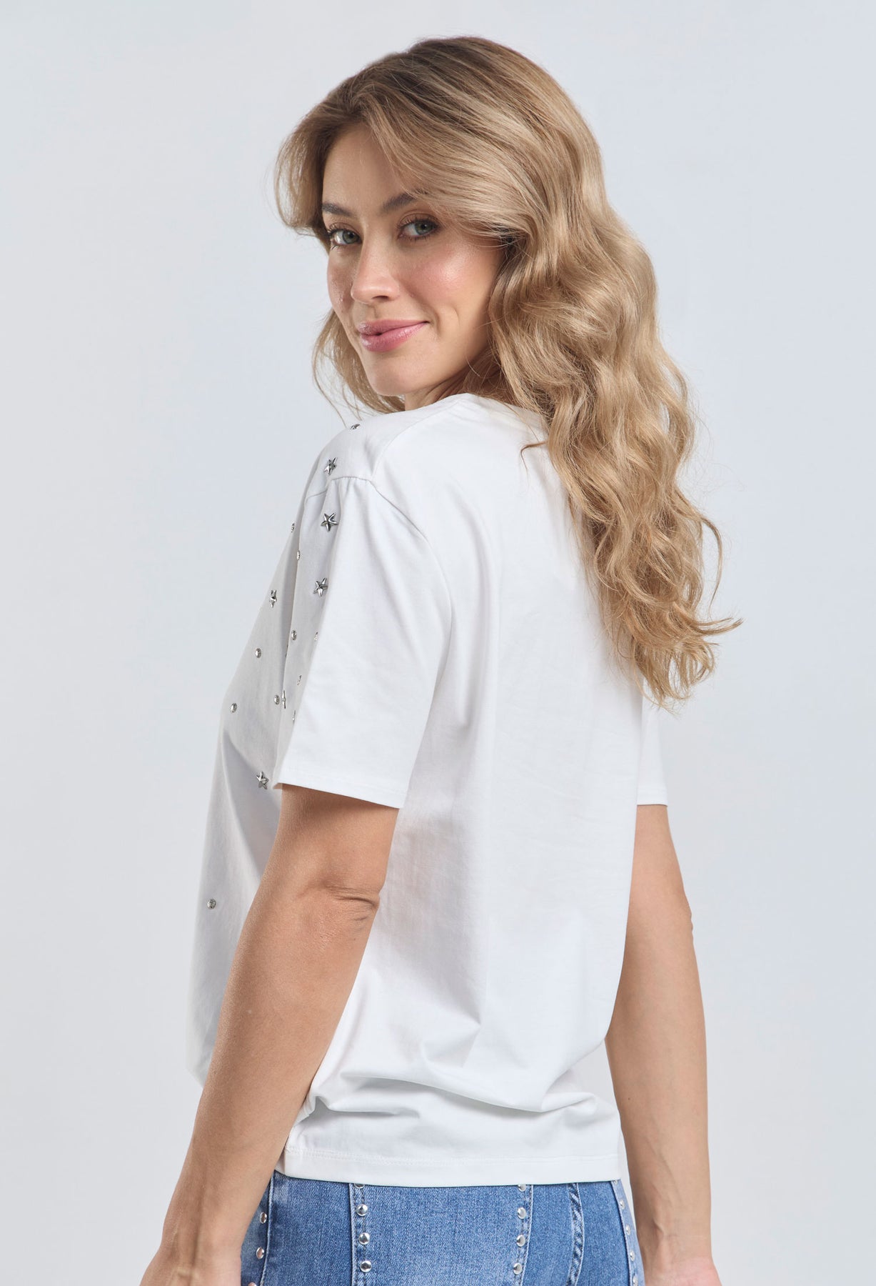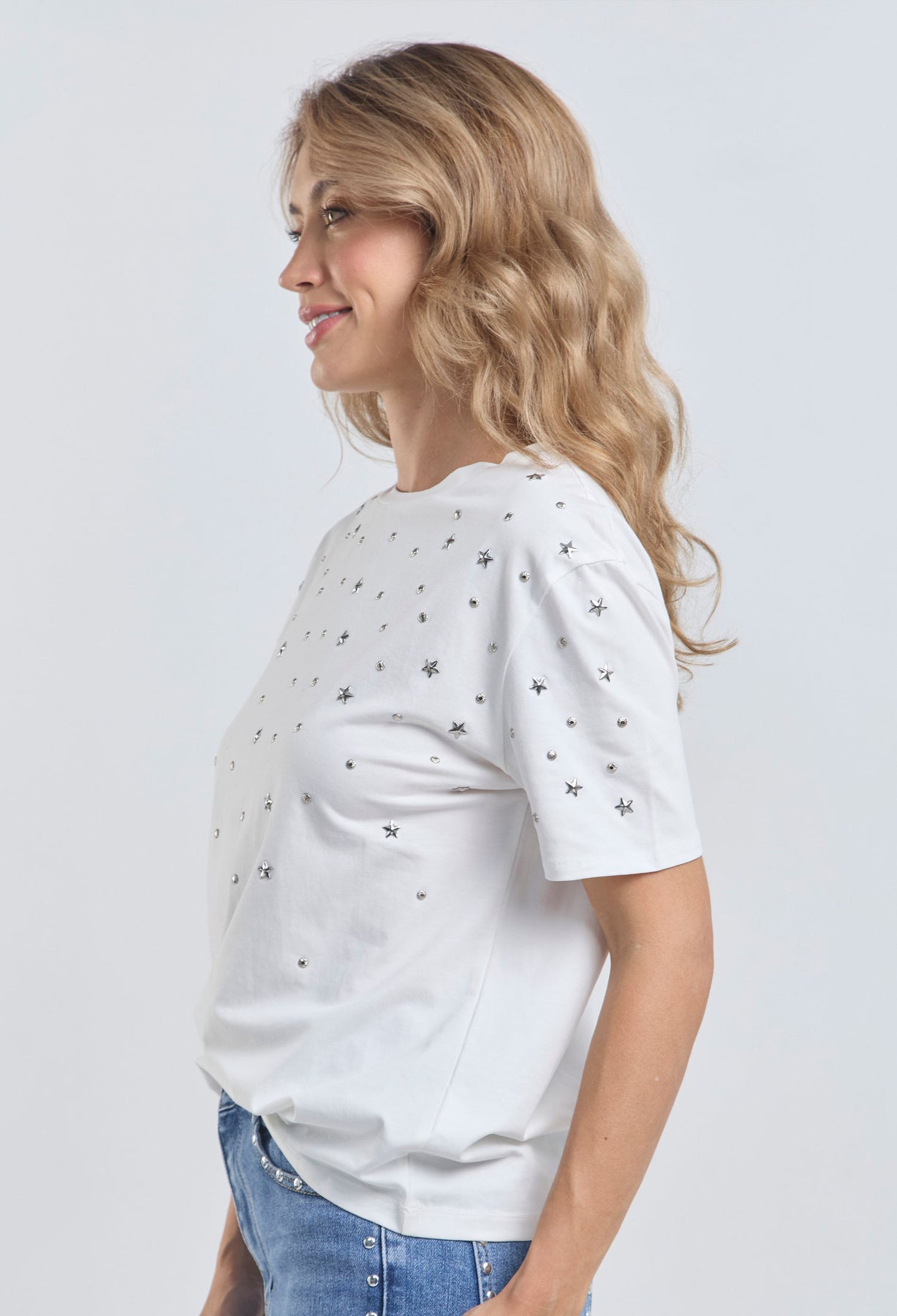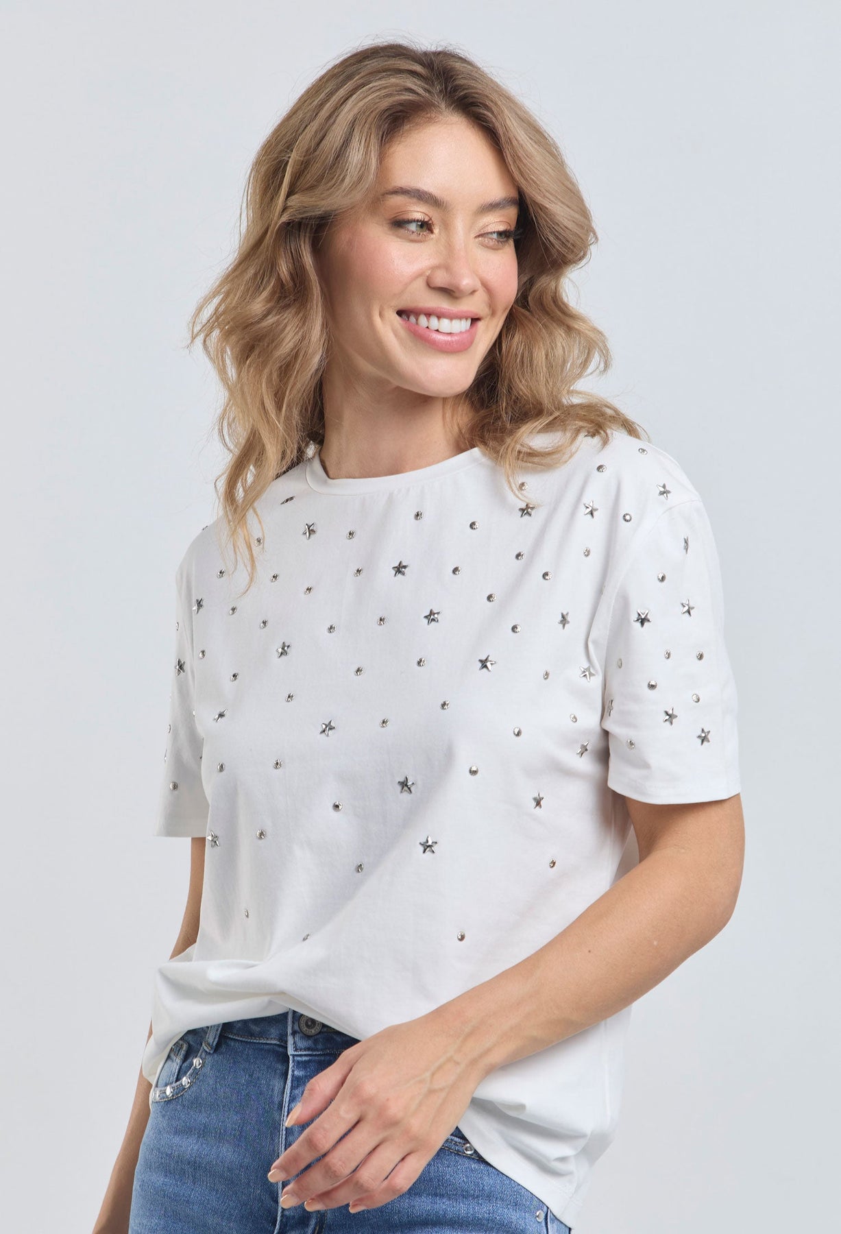 Precio habitual $189.900Camiseta con apliques metálicos de estrellas y taches en parte delantera, cuello redondo, manga corta. La modelo mide 1.74 m y lleva puesta la talla S/M