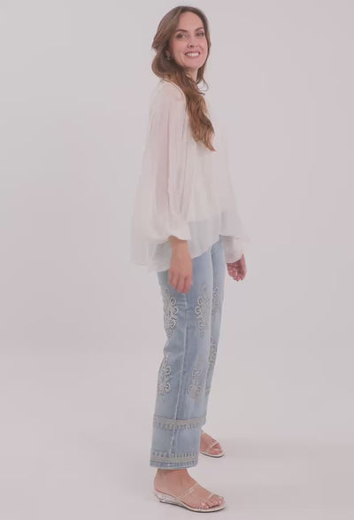 Este jean es una declaración de moda por sí solo. Al tener bordados en la pretina y detalles que resaltan las mangas, recomendamos llevarlo con prendas superiores que permitan lucir estos acabados, como un top de seda o nuestra línea de básicos estructurales. Su largo de 97 cm es ideal para usar con tacones o botas, proyectando una imagen de lujo moderno y sofisticación artesanal. Es la prenda perfecta para la mujer que valora la exclusividad en cada costura.