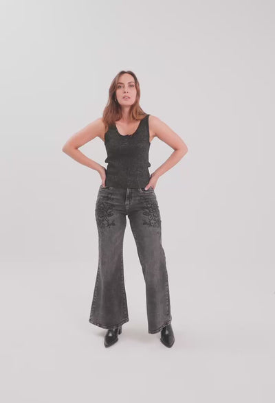 La versatilidad del denim se eleva con un diseño artístico que celebra la feminidad contemporánea. Este jean destaca por su exclusiva combinación de flores estampadas y aplicaciones de piedras que aportan relieve y un brillo sutil. Confeccionado con un textil de alta elongación, garantiza una silueta adaptativa que se amolda al cuerpo con suavidad, ofreciendo una horma que no marca y una caída fluida que estiliza la figura femenina.