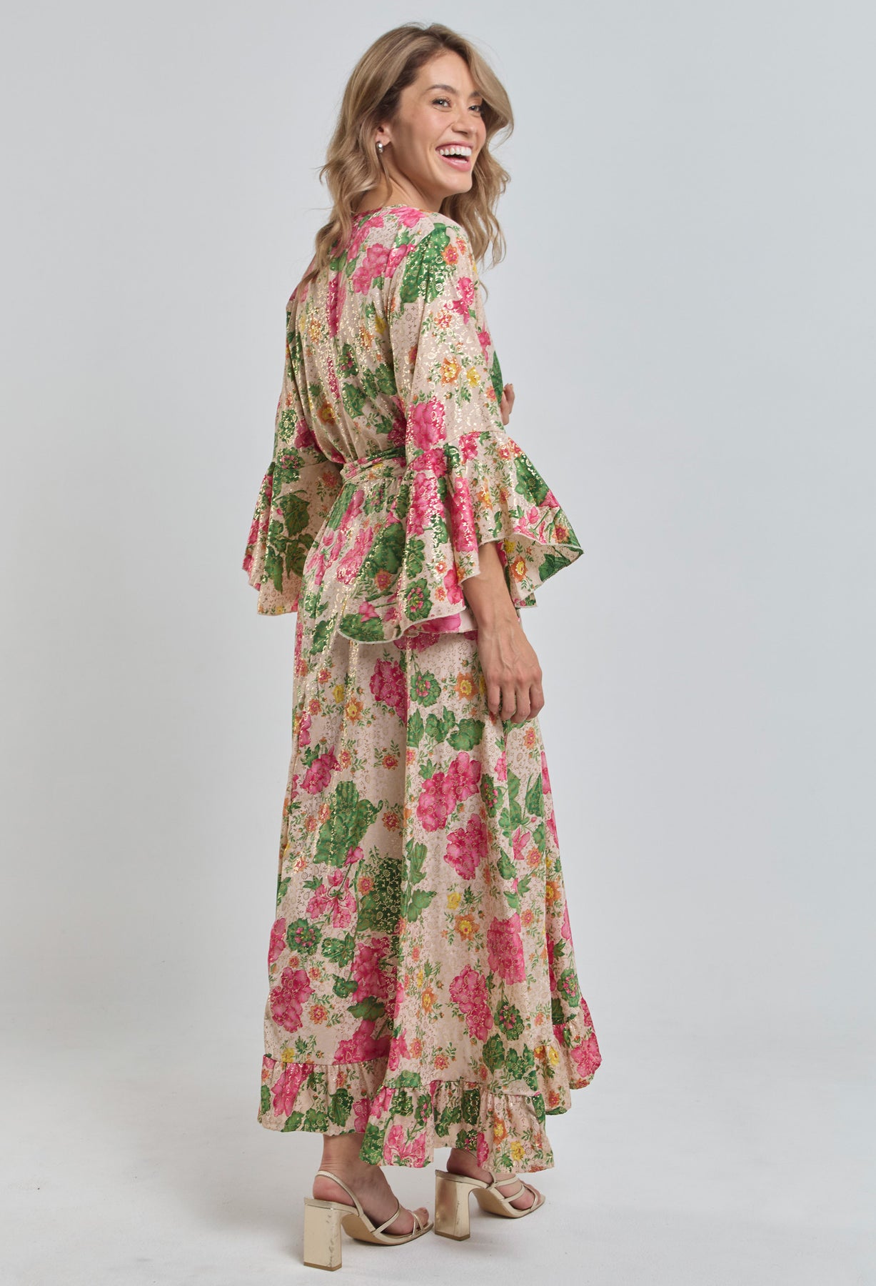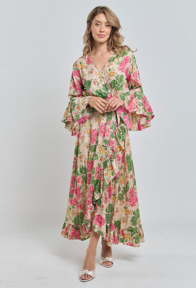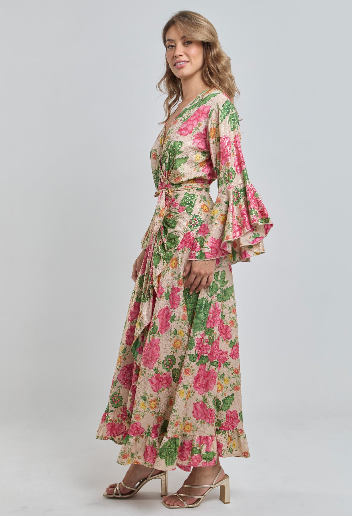 Precio habitual $429.900 Precio de oferta $249.900 Ahorro de 42%Vestido largo envolvente, manga larga con con vuelo tipo campana, cuello profundo, ajuste en cintura por cinturon en tela, vuelo en abertura y ruedo; estampado de flores. Destalle en tela con hilo dorado. La altura de la modelo es 1.74cm y esta usando una talla S.