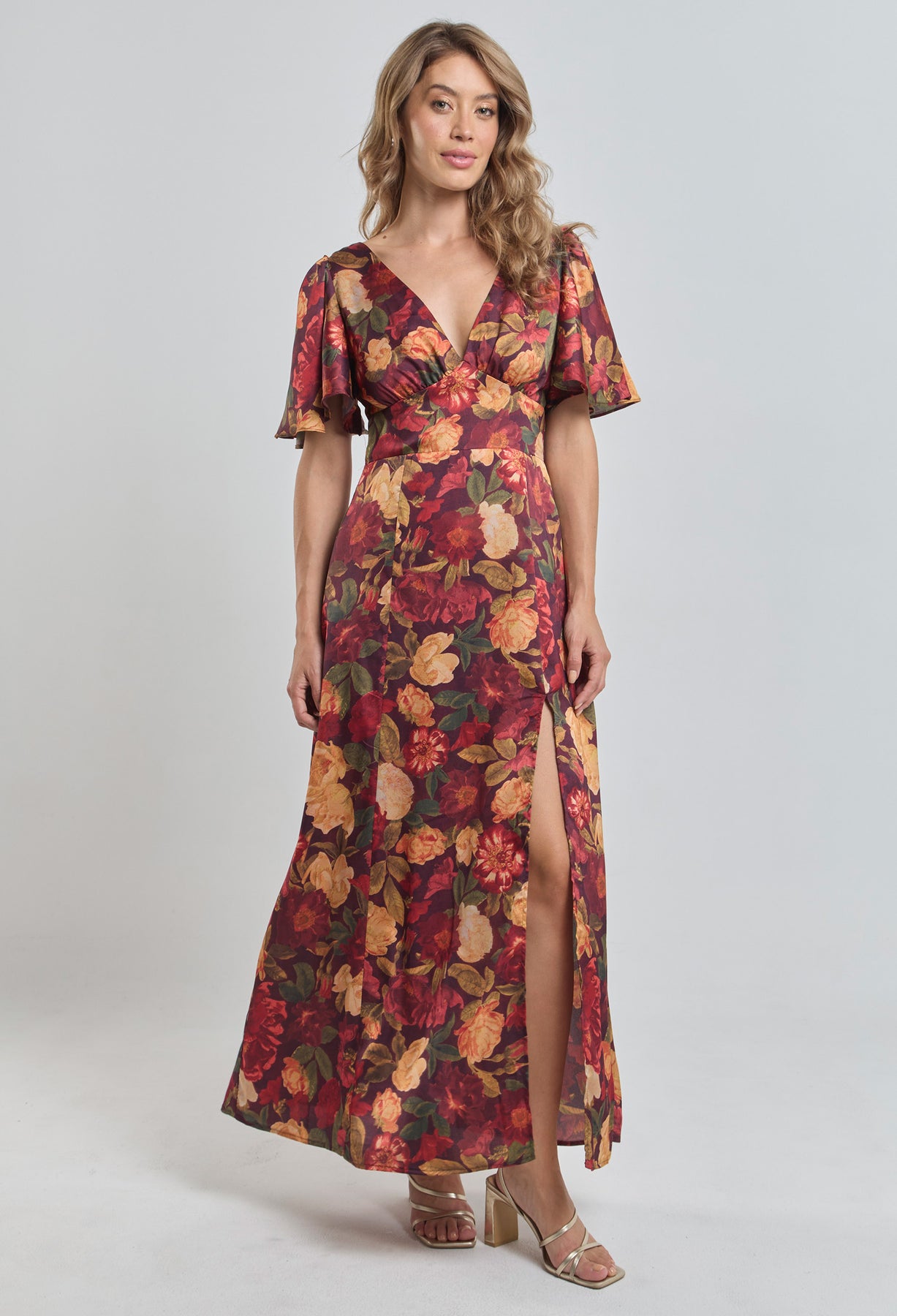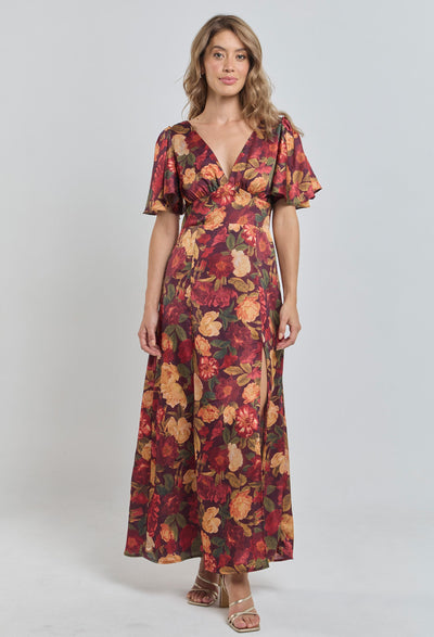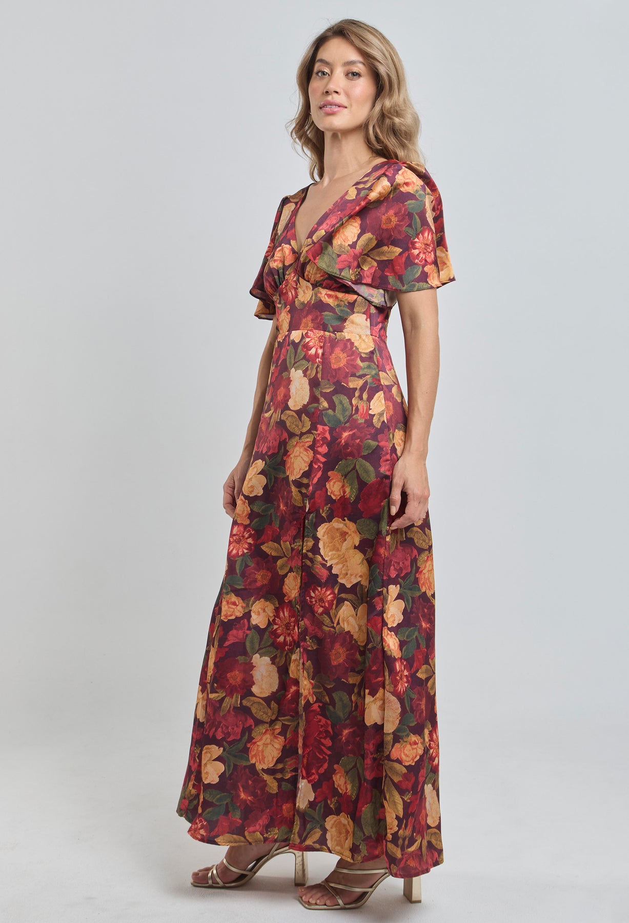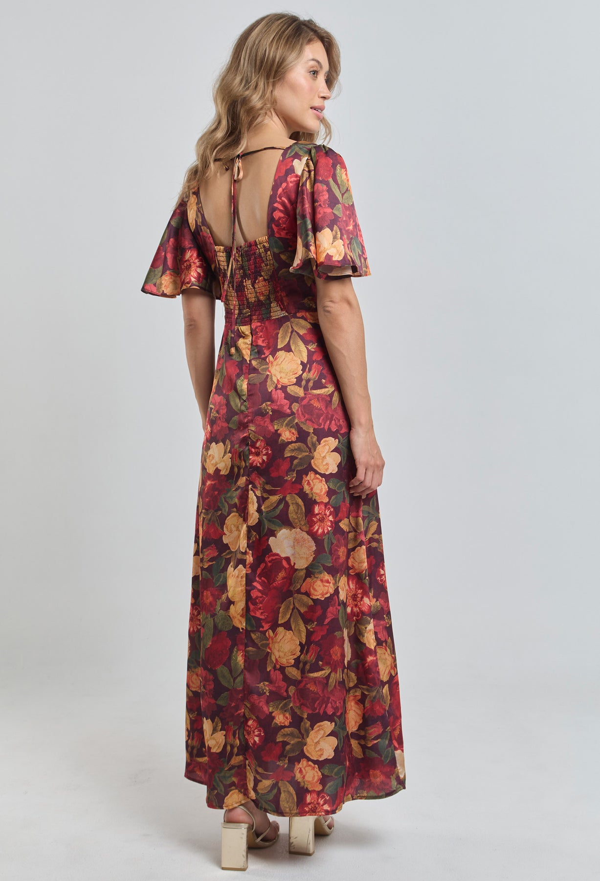 Precio habitual $549.900 Precio de oferta $189.900 Ahorro de 65%Vestido largo satén estampado, cuello en V, manga corta acampanadas, enresortado cintura y espalda descubierta.