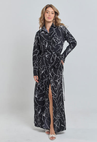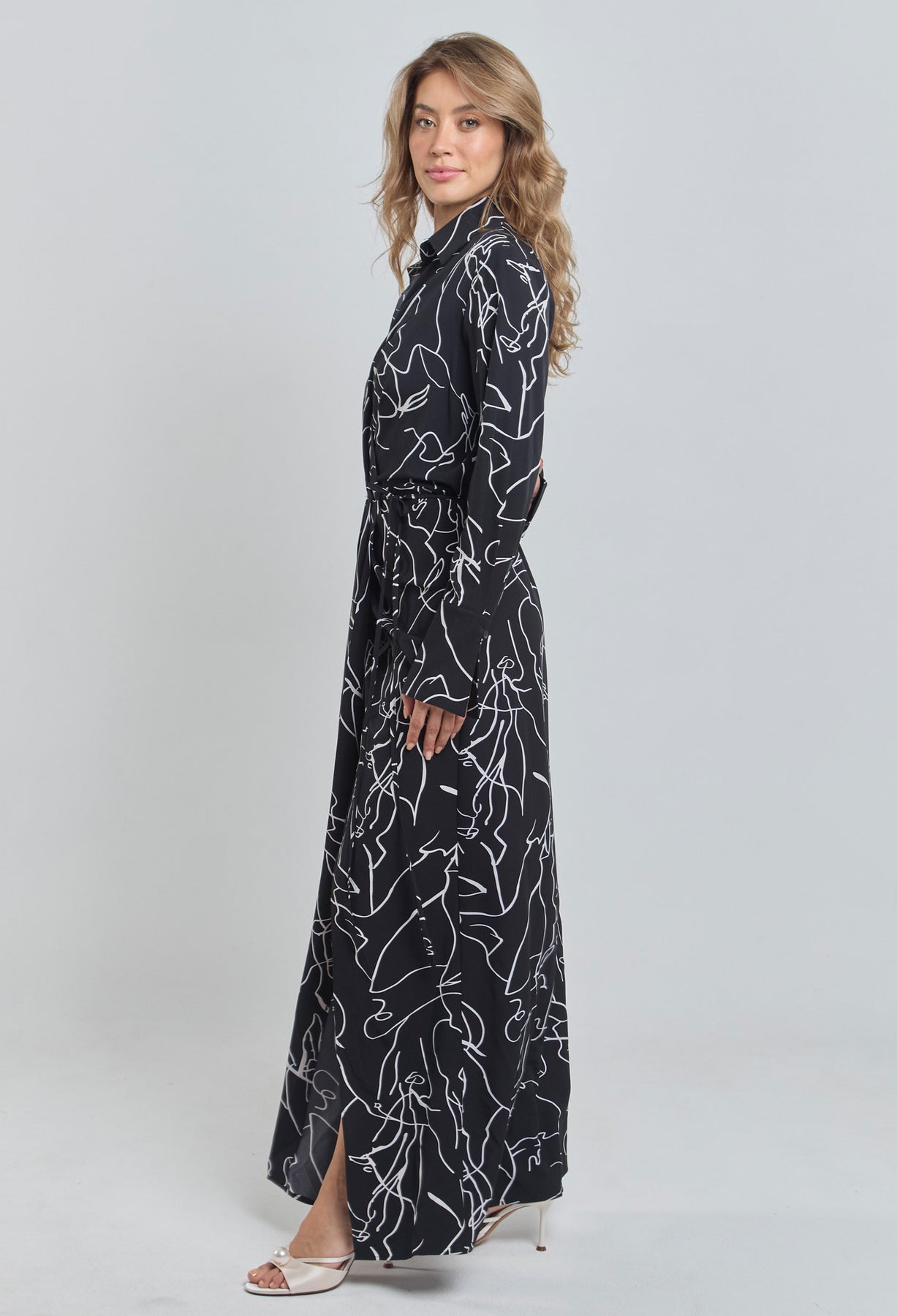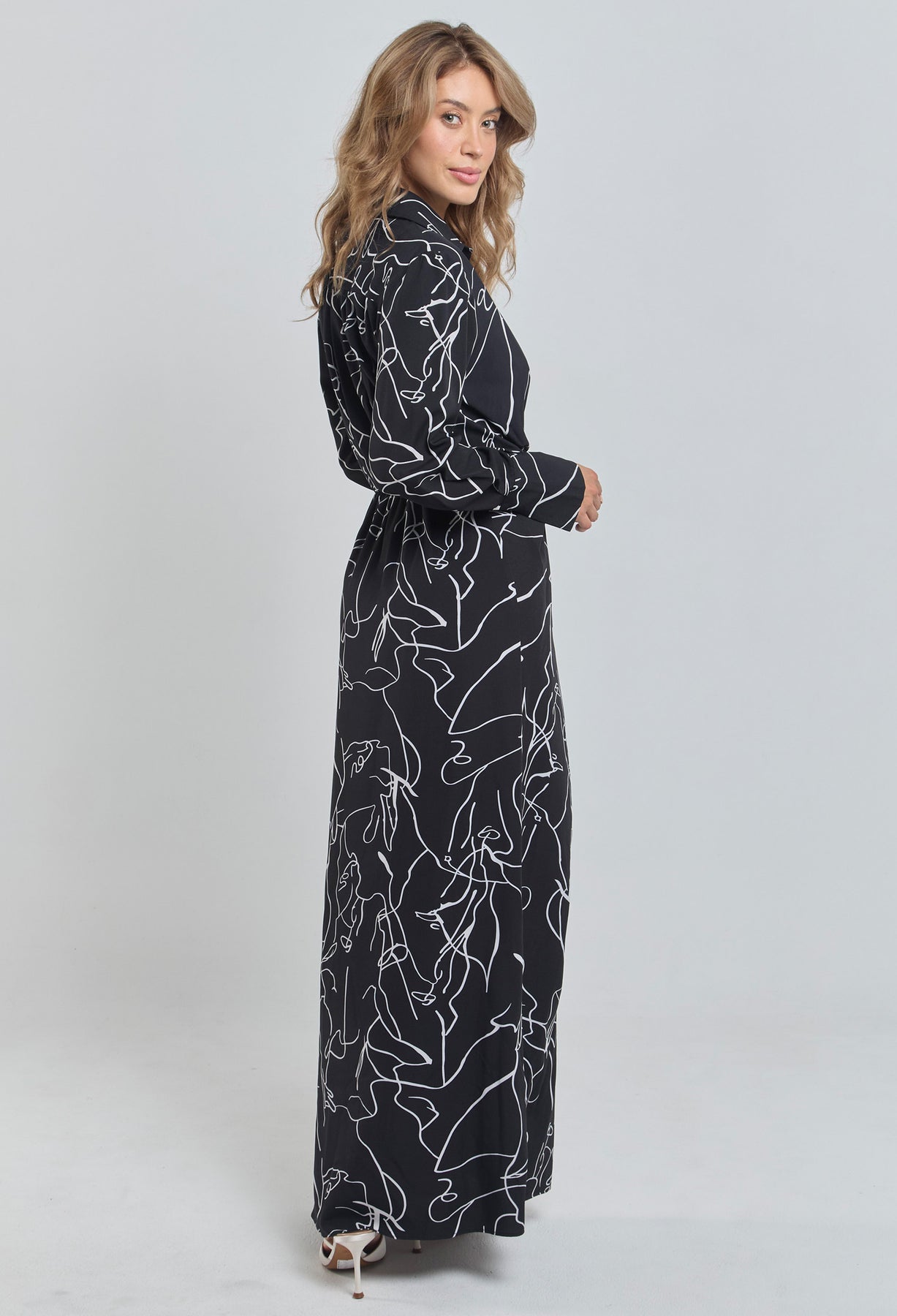 Precio habitual $289.900 Precio de oferta $169.900 Ahorro de 41%Vestido manga larga tipo camiseto, botones brontales, cruzado en la parte de la falda, estampado abstracto. La modelo mide 1.74 m y lleva puesta la talla S. Los accesorios de esta foto no vienen con la prenda.