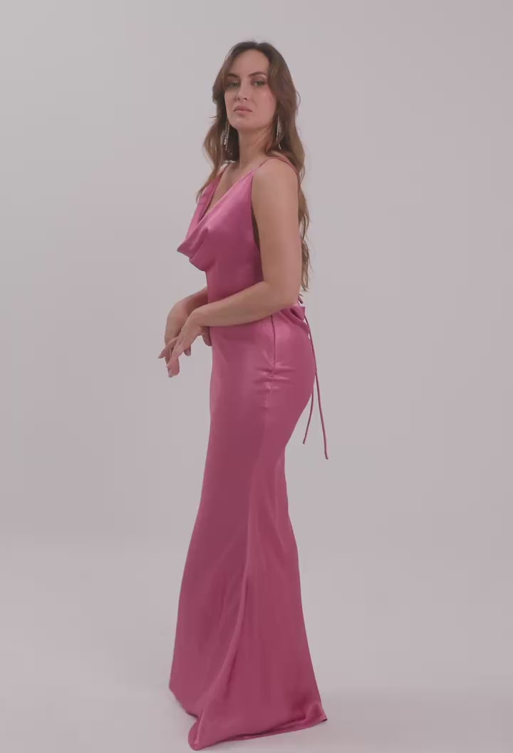 Para una noche de gala, complementa este vestido con sandalias de tacón fino y pendientes largos que estilicen el cuello. Su color fucsia vibrante y el brillo de la tela lo hacen destacar por sí solo; recomendamos un peinado recogido para lucir el sofisticado detalle drapeado de la espalda.