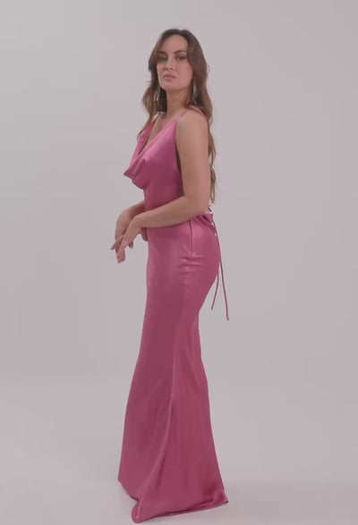 Una pieza de inversión que personifica el glamour contemporáneo. Este vestido largo, confeccionado en un satín de brillo profundo y caída fluida, destaca por su doble escote drapeado que enmarca tanto el frente como la espalda con sofisticación. Su silueta ajustada al cuerpo define la horma con elegancia, mientras que las tiras cruzadas permiten un ajuste personalizado, convirtiéndolo en la elección predilecta para eventos de etiqueta.