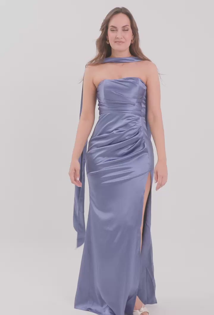 La sofisticación define a este vestido de gala de BYBLA. Confeccionado en un satín premium de brillo lujoso, este diseño presenta un escote strapless impecable que realza los hombros y el cuello. Su falda destaca por una audaz abertura en la pierna izquierda que aporta movimiento y sensualidad a cada paso. Como detalle distintivo de exclusividad, incluye un chal en la misma tela del vestido, permitiendo múltiples formas de uso. Con cierre invisible posterior, garantiza una horma limpia y pulcra para eventos de máxima etiqueta.