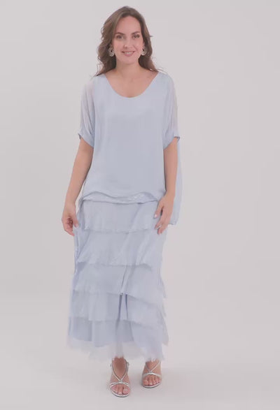 La magia de la seda italiana se eleva a un nuevo nivel con este diseño exclusivo de BYBLA. Este vestido destaca por su falda estructurada en capas que aporta volumen y movimiento, complementada por una parte superior fluida y cómoda. El detalle diferencial reside en las lentejuelas delicadamente bordadas en la primera capa de la falda y en las mangas, aportando destellos de luz sofisticados. Con forro interior para total seguridad y cuello redondo clásico, esta pieza ofrece una horma impecable que no marca y fluye con cada paso.
